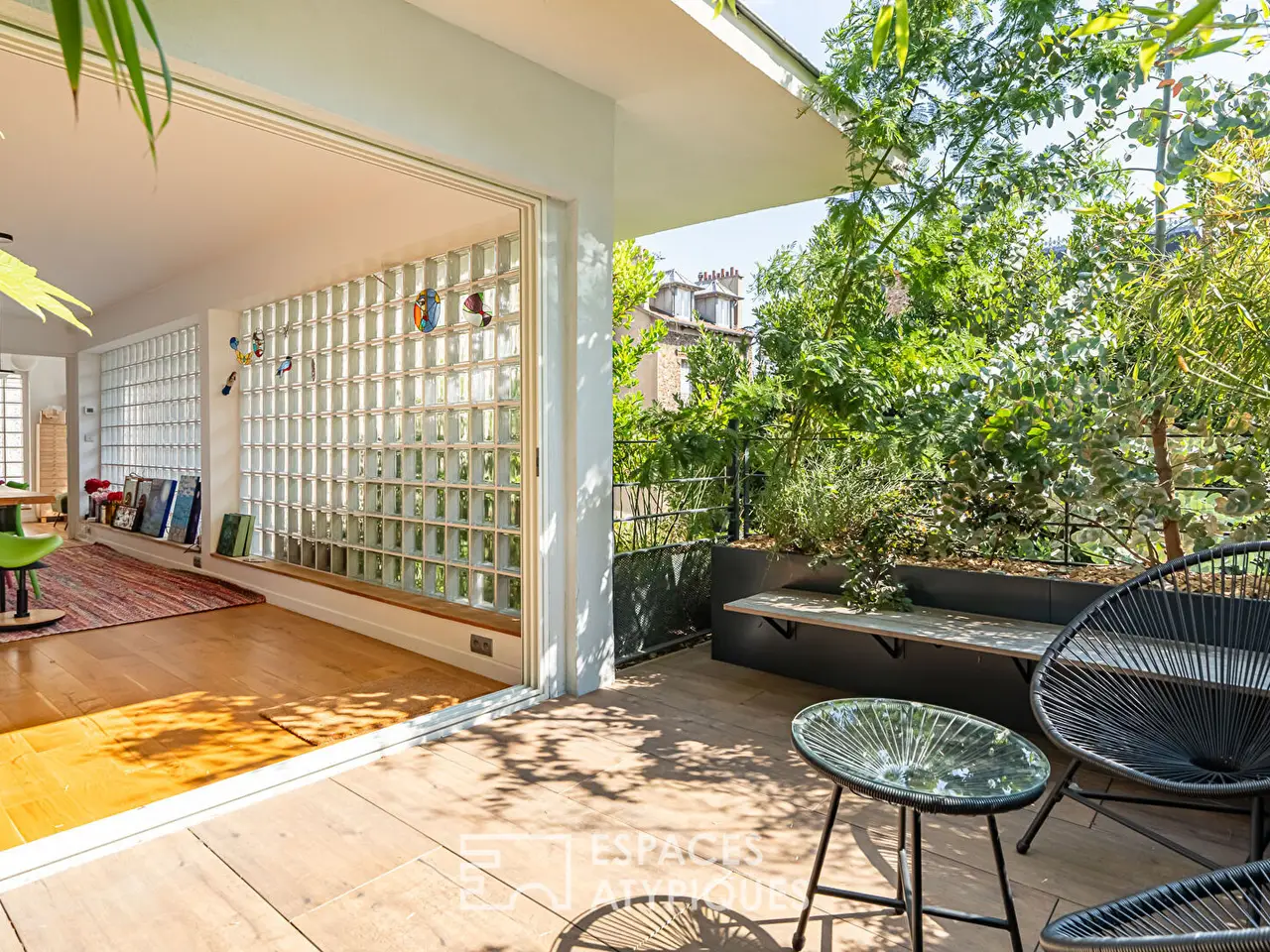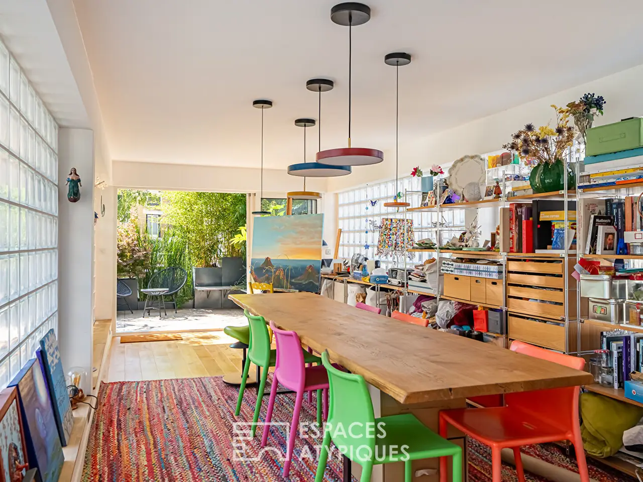On the top floor, a vast workshop, surrounded by glass bricks, captures light throughout the day. Designed as a true artist's studio, this space inspires with its brightness, its spaciousness, and its timeless atmosphere. Ideal for creativity, it can also be converted into a master suite or a fourth bedroom. It opens onto a suspended terrace, a secret garden perched hidden from view.