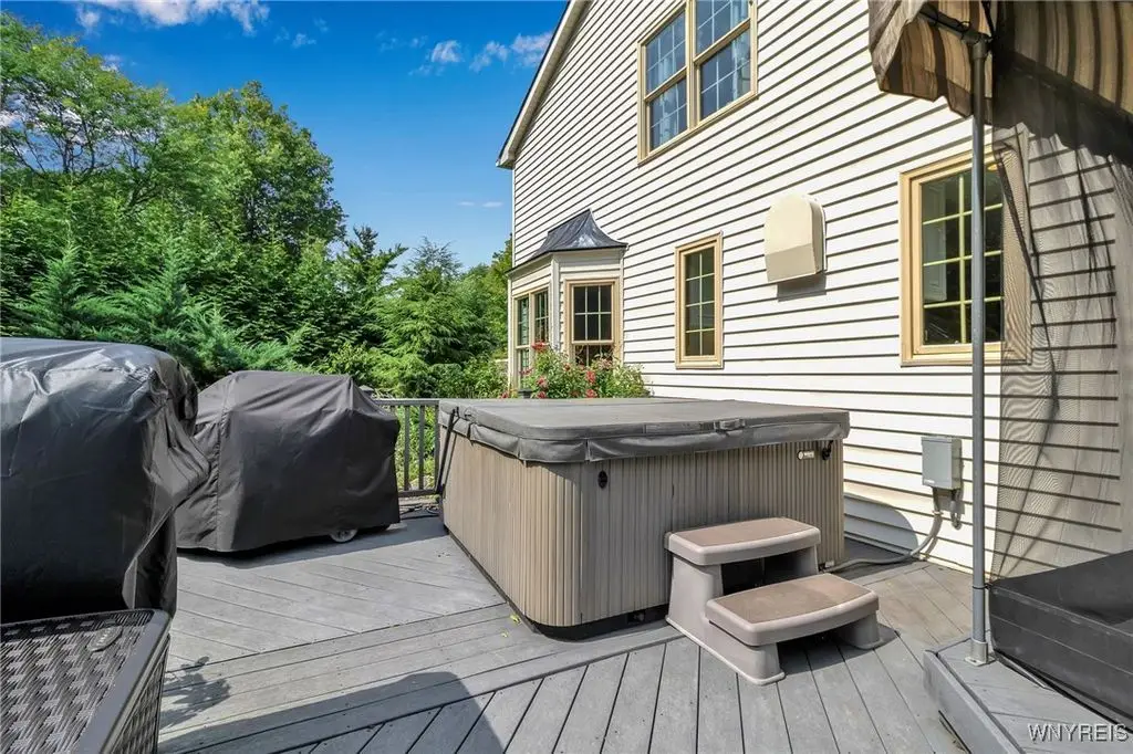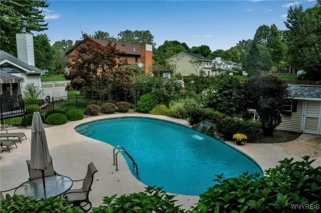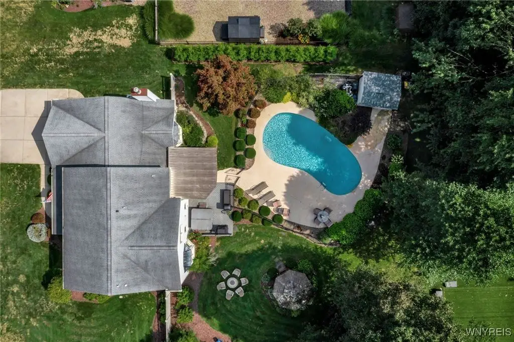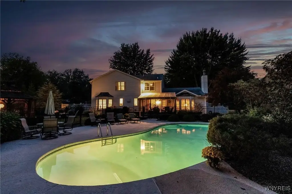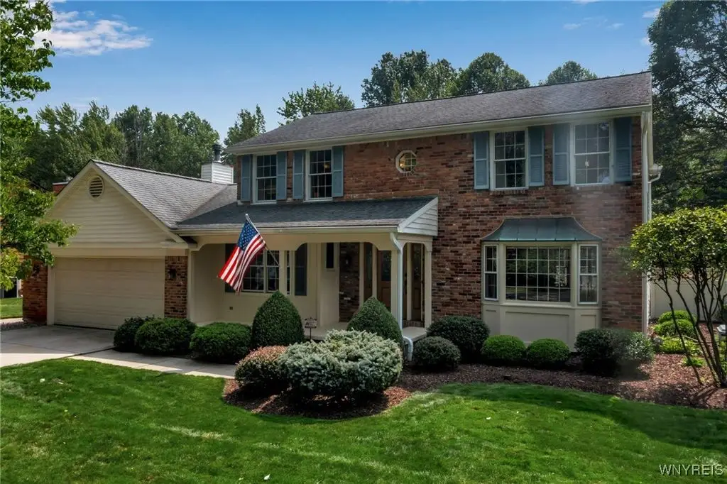 Welcome to this magnificent 4-bed, 2 full & 2 half bath Colonial w/stunning curb appeal that sits on a .97-acre private lot. A welcoming foyer w/hardwoods greets you or your guests as you enter the home through the covered front porch. The den is located off the foyer & features hwd floors, & fabulous California Closets custom built-ins. Kitchen features include hardwoods, Wood Mode cabinets, quartz countertops, under-cabinet lighting, a breakfast bar, a professional line SS gas cooktop & range hood, a newer refrigerator, dishwasher '23, & a lrg eating area. The kit seamlessly flows into the warm & inviting fam room, complete with custom built-ins, a gas fireplace, & a large bay window w/views of the magnificent yard, a perfect layout for entertaining or day-to-day living. Liv & din rooms feature newer hardwood floors, recessed lighting, & elegant bay windows that fill the space w/beautiful natural light. The home has been repainted throughout in lovely, peaceful, current paint colors. The 2nd floor features 4 large bedrooms, including a grand ensuite w/beautifully updated bath & California custom closet. A full split bath is off the hallway & features a whirlpool tub. Home has an abundance of closet space throughout! Step outside to your private backyard oasis. Enjoy the beautifully landscaped, private yard that showcases an in-ground Gunite pool (recently resurfaced) with a tranquil waterfall, and surrounded by Kool Deck concrete for comfort and safety. A Trex deck & a Kohler awning with retractable screens provide ideal spaces for outdoor relaxation or gatherings. Additional outdoor features include a hot tub, a charming gazebo with electricity, a storage shed, & a 30' x 60' sports court with w/professional turf and lay-flat drainage underneath. The lower level is partially finished w/3 areas to enjoy watching television, working out or relaxing. Additionally, there is a 1/2 bath & ample storage area. Add'l features include a whole-house generator, irrigation system, custom Bali solar shades, & a new smart garage opener w/camera in '23.Located in the highly sought-after Wmsvl School District. Superb location near all conveniences! This home truly has it all!