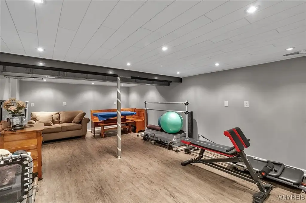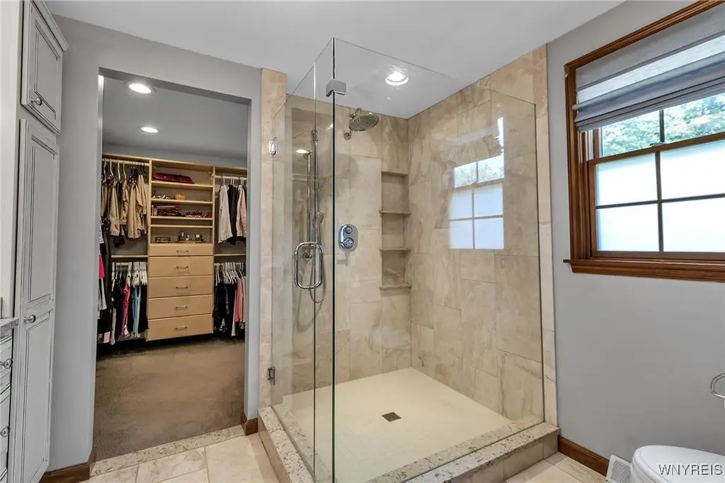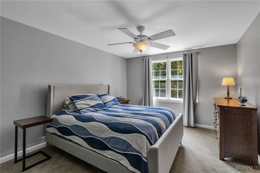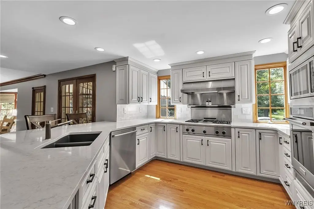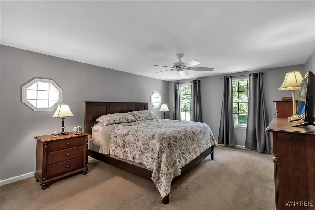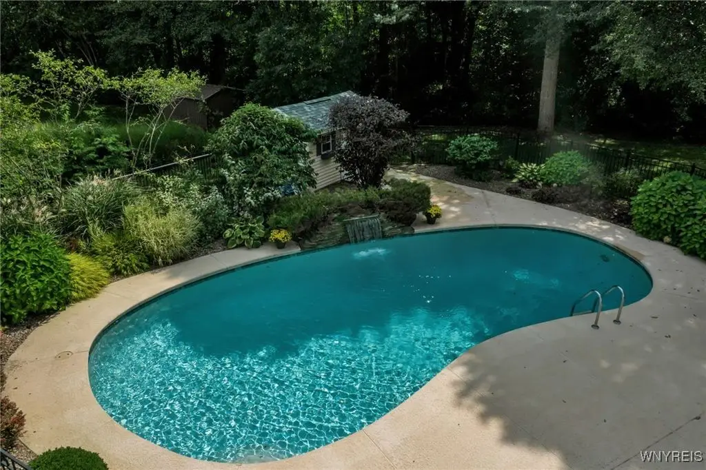 Welcome to this magnificent 4-bed, 2 full & 2 half bath Colonial w/stunning curb appeal that sits on a .97-acre private lot. A welcoming foyer w/hardwoods greets you or your guests as you enter the home through the covered front porch. The den is located off the foyer & features hwd floors, & fabulous California Closets custom built-ins. Kitchen features include hardwoods, Wood Mode cabinets, quartz countertops, under-cabinet lighting, a breakfast bar, a professional line SS gas cooktop & range hood, a newer refrigerator, dishwasher '23, & a lrg eating area. The kit seamlessly flows into the warm & inviting fam room, complete with custom built-ins, a gas fireplace, & a large bay window w/views of the magnificent yard, a perfect layout for entertaining or day-to-day living. Liv & din rooms feature newer hardwood floors, recessed lighting, & elegant bay windows that fill the space w/beautiful natural light. The home has been repainted throughout in lovely, peaceful, current paint colors. The 2nd floor features 4 large bedrooms, including a grand ensuite w/beautifully updated bath & California custom closet. A full split bath is off the hallway & features a whirlpool tub. Home has an abundance of closet space throughout! Step outside to your private backyard oasis. Enjoy the beautifully landscaped, private yard that showcases an in-ground Gunite pool (recently resurfaced) with a tranquil waterfall, and surrounded by Kool Deck concrete for comfort and safety. A Trex deck & a Kohler awning with retractable screens provide ideal spaces for outdoor relaxation or gatherings. Additional outdoor features include a hot tub, a charming gazebo with electricity, a storage shed, & a 30' x 60' sports court with w/professional turf and lay-flat drainage underneath. The lower level is partially finished w/3 areas to enjoy watching television, working out or relaxing. Additionally, there is a 1/2 bath & ample storage area. Add'l features include a whole-house generator, irrigation system, custom Bali solar shades, & a new smart garage opener w/camera in '23.Located in the highly sought-after Wmsvl School District. Superb location near all conveniences! This home truly has it all!