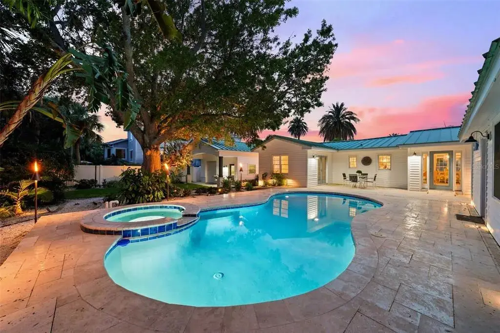Coastal Luxury Meets Effortless Charm in North Clearwater Beach Welcome to your private beachside oasis! This beautifully renovated Clearwater Beach Bungalow with a detached Guest House, sparkling Pool, oversized Garage, and sprawling fenced yard offers the ultimate in relaxed coastal living. Nestled in the highly sought-after North Clearwater Beach community, you’re just a short stroll or golf cart ride from the powder-soft white sands of Clearwater Beach — consistently ranked the #1 Beach in the USA. Step onto the welcoming front porch and feel the Gulf breeze as you take in golden sunsets and magical twilight skies. Inside, an open-concept floorplan showcases designer coastal finishes, all-new luxury vinyl plank flooring, and a seamless blend of comfort and sophistication. The main home features 3 spacious bedrooms and 2 updated bathrooms, including a serene primary suite with a large walk-in closet, complete with smart built-ins and convenient outlets. The heart of the home — a stunning chef’s kitchen — boasts quartz countertops, shaker cabinetry, a coffee or wine bar nook, and a counter-depth refrigerator, all with gorgeous views of the pool. Step outside to your private tropical escape. The remodeled pool and spa shine as the centerpiece of the backyard, complete with in-floor cleaning system, gas heater, and new equipment. Entertain with ease on the travertine lanai, grill at your built-in Coyote BBQ station, and enjoy ambient landscape lighting that sets the mood for unforgettable evenings. Need space for visitors or extended family? The detached Guest House offers a private retreat with its own kitchen and bath — perfect for long-term guests or rental potential. Storage and parking are a dream with an oversized 2-car garage, plenty of room for a golf cart, beach toys, and tools, plus a long driveway that fits four more vehicles with ease. Additional highlights: Privacy fence surrounding the property In-house laundry Lush, low-maintenance landscaping Short walk to beachside shops, restaurants, the Clearwater Beach Rec Center, and boat ramp This is more than a home — it’s a lifestyle. Whether you're looking for a full-time residence, vacation home, or investment opportunity, this one-of-a-kind beach compound offers it all. Live the dream. Love the beach. Welcome home.
