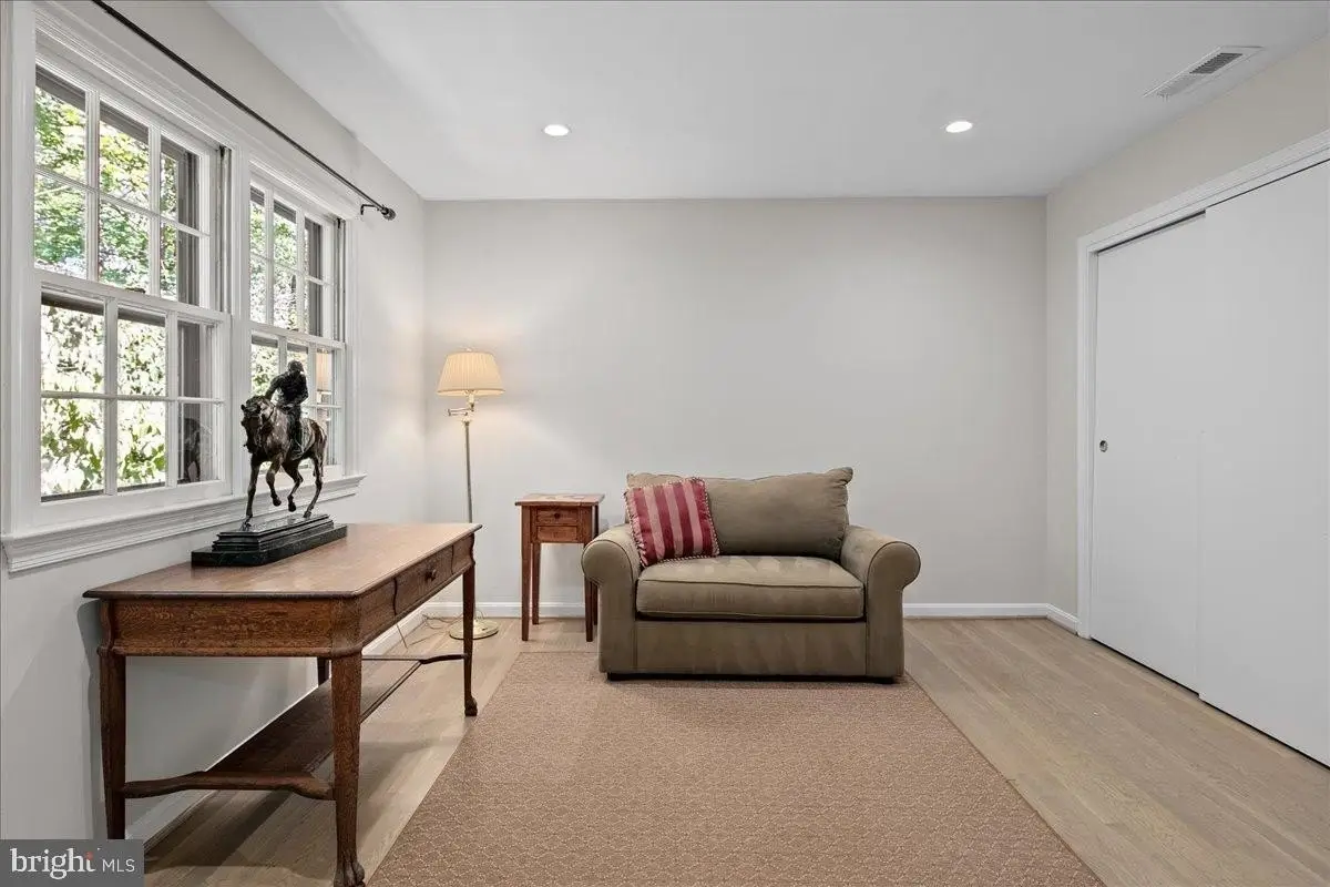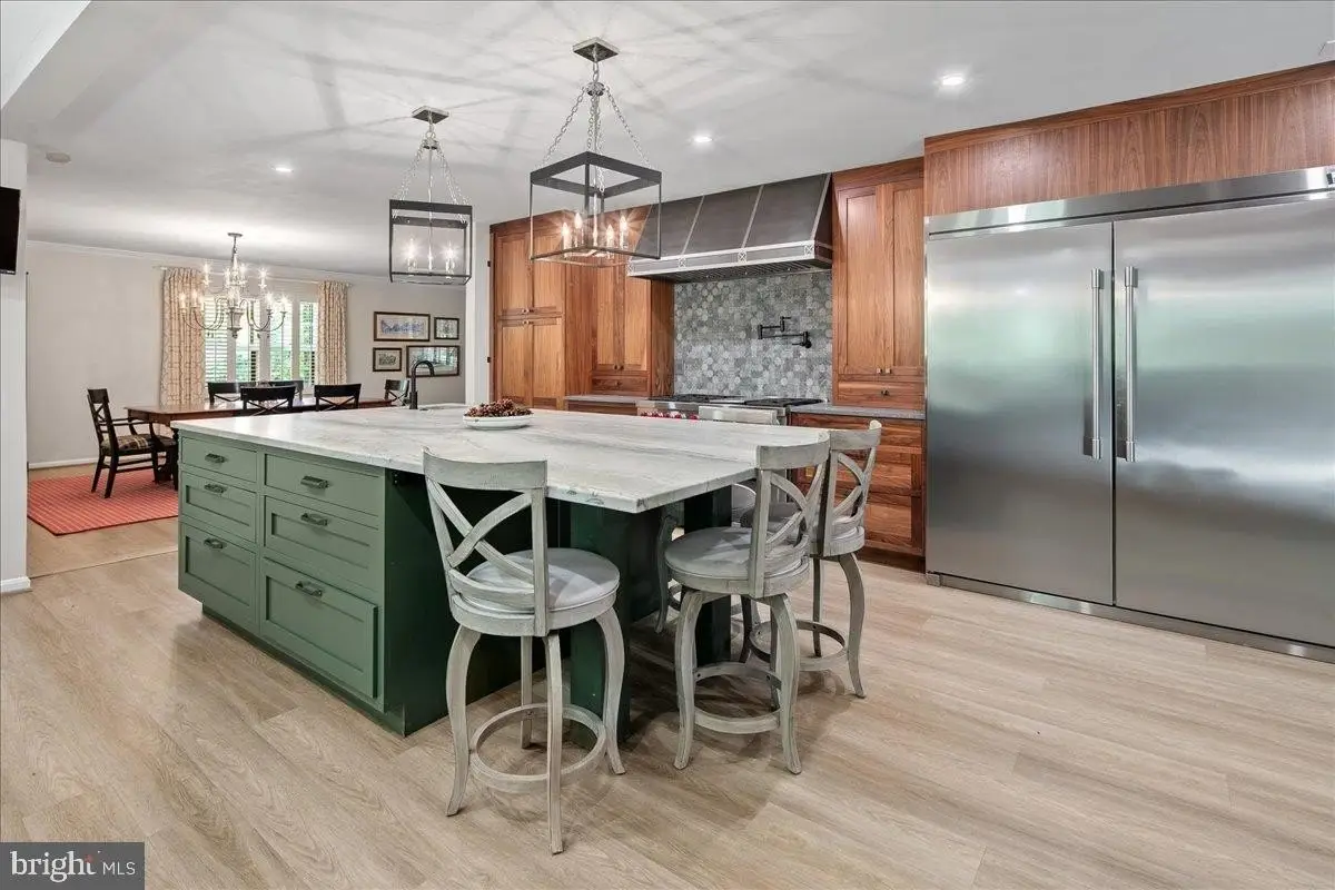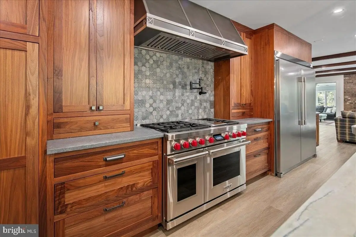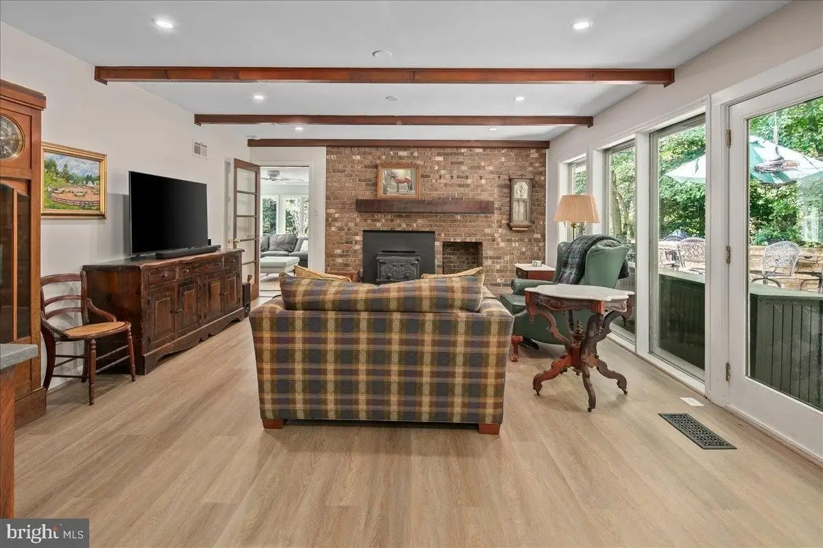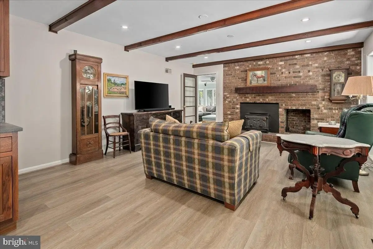 Welcome to this beautifully updated home that seamlessly blends modern design with timeless charm. Featuring a stunning open-concept kitchen, cozy living areas, and abundant natural light, this home offers both comfort and sophistication in every detail. Step into the heart of the home - an incredible gourmet kitchen designed to impress visually and functionally. Updated and expanded in 2023, the kitchen features a stunning Maldives leathered quartzite island (with no seams) with a built-in prep sink and bar seating that anchors the space. It is complemented by rich walnut cabinetry with integrated interior electrical outlets, and sleek Rugged Concrete Caesarstone quartz counters. Top-of-the-line appliances include a Wolf 6-burner gas stove with a custom hood, two dishwashers, and a cabinet-depth refrigerator and freezer. An eye-catching tile backsplash and oversized windows flood the space with light. Adjacent to the kitchen is a spacious family room with exposed wood ceiling beams and a classic brick fireplace, a perfect blend of rustic charm and modern amenities. Glass doors open to a beautiful outdoor patio, enhancing the indoor-outdoor connection. A glorious sunroom offers a relaxed retreat with wraparound windows, ideal for reading, relaxing, or hosting guests. This room is bathed in natural light and offers serene views of the surrounding pastures. The formal dining and living rooms are perfect for hosting gatherings, featuring white oak floors, plantation shutters, & custom draperies. The main level features a bedroom, currently used as an office, that includes a built-in desk. A full bathroom is also conveniently located on this level. Upstairs, the primary bedroom is a serene retreat with a walk-in closet & a beautifully updated en-suite primary bathroom with sleek double vanity, and a large, glass-enclosed walk-in shower with subway tiles. A second washer and dryer are a bonus in the primary suite. The upper level includes four bedrooms, all with hardwood floors, and two full bathrooms, both with double vanities. The finished lower level is an entertainer's dream, offering a versatile space for games and relaxation. A wet bar provides a perfect spot for serving drinks, and a large storage room with utilities offers abundant storage. Step outside to the fantastic outdoor living space, perfect for entertaining and enjoying the serene surroundings. The large patio features an outdoor kitchen, a hot tub, and two tranquil ponds. The property features a 5-stall center aisle horse barn, each with front and back doors leading to its own paddock and a wash stall. There's a separate hay barn, a grass schooling area, and multiple fenced turn-out pastures with elegant 3-board wood fencing. Direct access to incredible ride-out trails makes this a true equestrian's paradise. Beyond the barn, the expansive grounds include a sensational 100 x 50 vegetable garden, a chicken coop, and a tractor shed. A new roof was installed in 2018 and a new hot water heater in 2017. The grand circular driveway was upgraded in 2023 and provides an impressive entrance with an additional parking alcove, leading to a 2-car garage. This home is a perfect showcase of classic character and modern design.