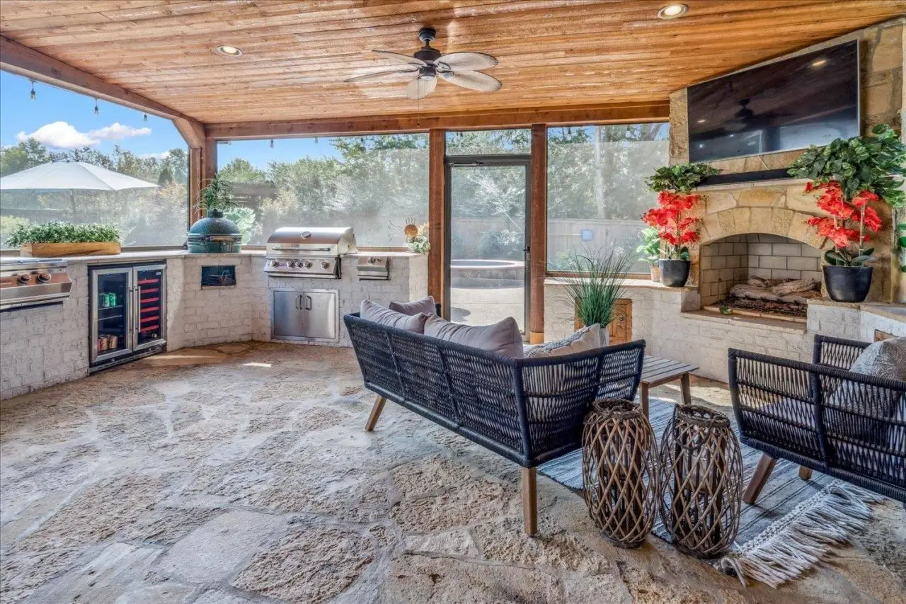 - Outdoor kitchen with cozy fireplace