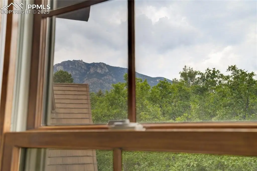 Set in the Broadmoor Bluffs neighborhood near D-12 schools, this home combines mountain & city views w/ a private, nearly half-acre lot close to parks, trails, shopping & military bases. A covered entry opens to solid oak hardwd flrs & a formal living rm framed by a bay window, crown molding, & views of the landscape. From here, the layout flows into the great rm where craftsmanship stands out, beamed ceiling, wainscoting paneling, built-ins, FP, & a wall of windows w/ walk-out access. An integrated bar w/ sink, granite counters & storage enhances the space while keeping everything tucked neatly away. The adj gourmet kitchen offers an eating nook surrounded by windows & deck access, plus hardwd flr, center island, granite countertops, updated lighting, tile backsplash, SS appliances incl range-top & wall oven, pantry, & built-in work area. A formal dining room connects easily, designed w/ crown molding & chair rail. Completing the main lvl is a half bath & a laundry room w/ sink, cabinets & window. Upstairs, the primary suite features a tray ceiling, sitting area w/ wd-burning FP, & large windows. The adj 5-pc bath has vaulted ceilings, soaking tub, glass shower & tile flooring, plus a massive walk-in closet w/ custom shelving & bonus room. Three additional bedrooms share the upper level each spacious w/ large closets & new carpet throughout. One bedroom captures mountain views, while all share easy access to a hall bath w/ tiled surround. The finished bsmnt expands the living space w/ a rec room anchored by a FP at one end & open space at the other, plus a bedroom & bath nearby. storage room w/ built-in shelving. Outdoors, a composite deck w/ wrought-iron railing overlooks the xeriscaped backyard, complete w/ fenced garden space & privacy from mature trees. The lot feels secluded while still connected to every convenience. Add highlights incl central A/C, HE furnace, metal tile roof, brick & stucco ext, oversized 2-car garage w/ 220V, & quality finishes throughout.