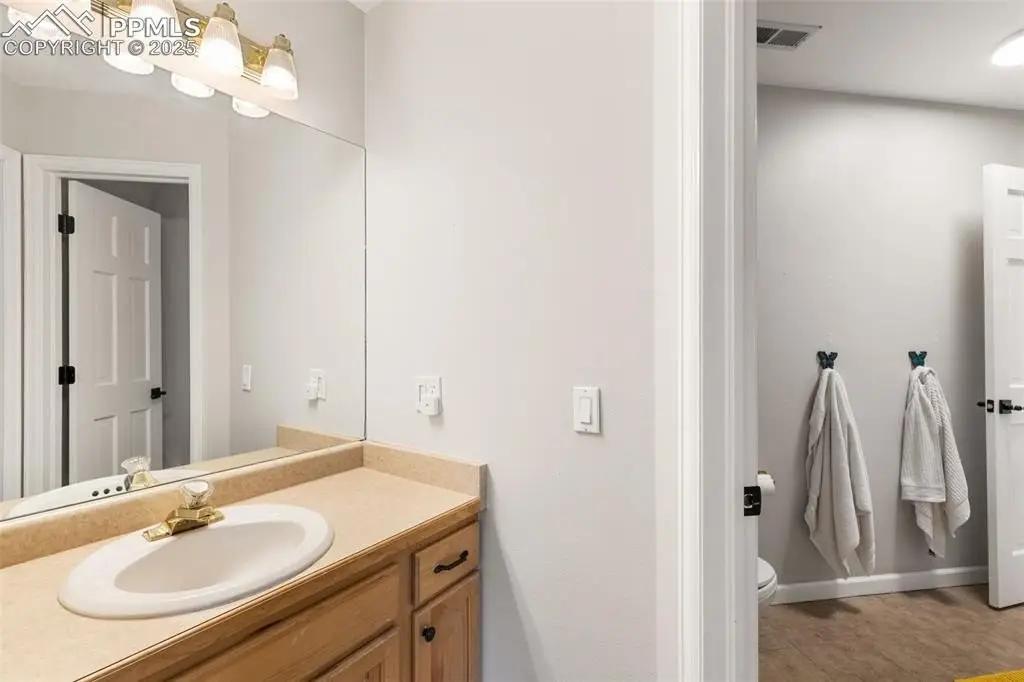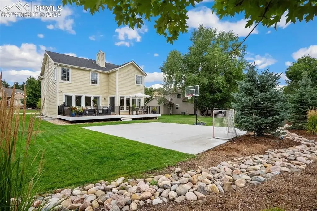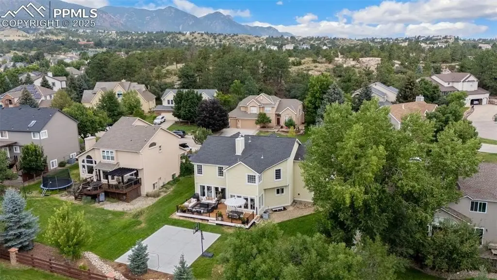 Stunning home in Rockledge at Peregrine boasting timeless style and designer finishes throughout. From the moment you enter, hardwood floors and an open floor plan set the stage for this inviting residence. The great room impresses with a dual sided stone fireplace and a wall of windows overlooking the backyard. A butler’s pantry leads to the renovated kitchen featuring quartz counters, a sprawling center island, gas cooktop, stainless appliances, and abundant cabinetry. The adjoining bayed dining nook is perfect for family meals. The floor plan offers flexible spaces to fit your lifestyle – formal dining room, office and living room. A half bathroom and remodeled laundry room complete the main level. Upstairs, the spacious primary suite offers a private sitting area, 5-piece bath, and walk-in closet. The upper level boasts three additional bedrooms—one with its own en-suite bathroom, and two connected by a Jack-and-Jill bathroom. The newly finished basement provides even more living space with a large family room, two bedrooms, and a full bathroom. Step outside to an expansive deck overlooking the park-like backyard with a sport court—perfect for entertaining, play, and relaxation. Walk to award winning Woodmen Roberts Elementary, neighborhood park or access acres of hiking trails in Blodgett Open Space. Situated in the foothills of Peregrine, you will enjoy mountain views, mature trees, and wildlife yet you are minutes from I-25 with easy access to downtown Co Springs, USAFA, shopping and dining. This home offers extensive hardwood flooring, new carpet, updated lighting, beautiful indoor and outdoor living spaces, invisible fence for dogs and much more. There is nothing left to do but move in and enjoy the amazing amenities of this home.