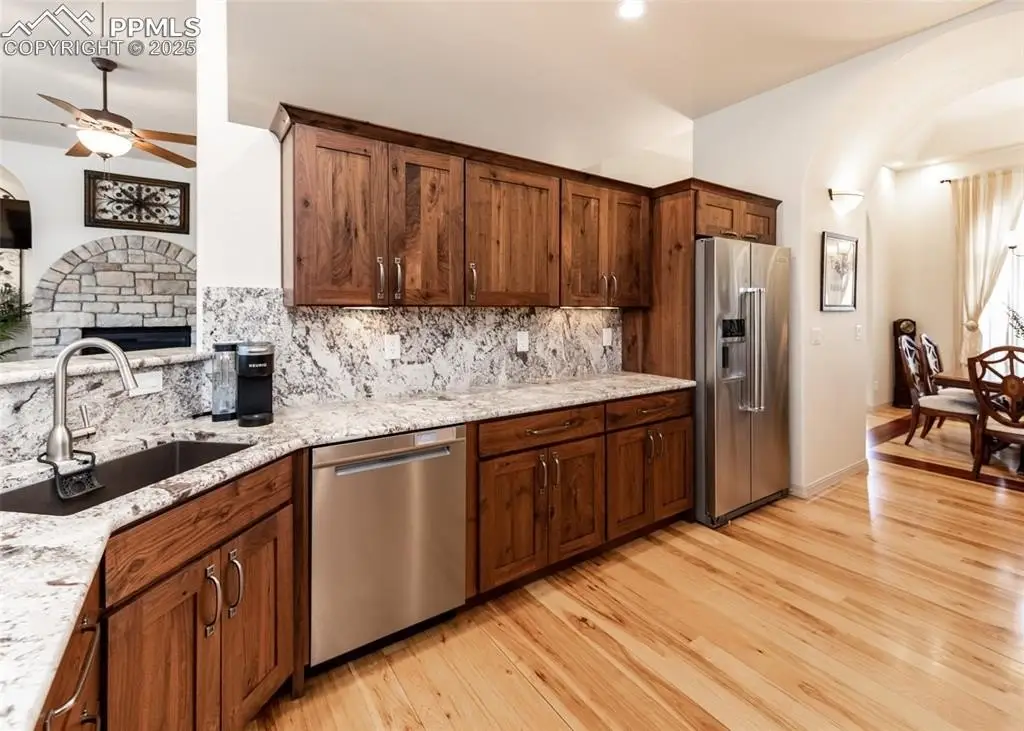 Immaculate updated 4,780 sq ft 7 bedroom stone & stucco raised rancher on a beautiful professionally landscaped corner lot at the top of University Heights. Tile roof ~ 2 Fireplaces ~ 2 Security systems with cameras inside & outside plus fire alarm system ~ Extensive 12' entry ceiling & natural 12' coffered ceilings in formal living & dining rooms~ shiny natural hickory floors with Brazilian cherry inlaids throughout the main level living areas ~ Gourmet granite & stainless steel kitchen totally redone in 2022 to include a gas range & dual ovens, soft close drawers & pull outs even in the pantry~ total one level living with laundry, primary suite & 3 more bedrooms on the main level ~ Elegant primary 5 piece bath with heated tile floor, jetted tub, granite counters & a 14' curved walk in shower with dual shower heads & glass block accents ~ Granite counters in all baths ~ Central vac ~ A/C on humidifier on main level. Huge 2nd family room in walk out basement with granite topped wet bar with 2nd fridge ~ 10'-12' ceilings on main level & 9' ceilings in basement ~ Milgard windows ~ Finished & painted 3 car garage with custom overhead doors, epoxy floor covering, high ceilings & a south facing driveway ~ 17x17 rear composite partially covered deck ~ 28x8 front composite partially covered deck both with powder coated iron railings ~ 12x10 patio off walk out basement ~ Mountain & Pikes Peak view from the rear. Immaculate condition. No kids, pets or smoking here. Shows great.