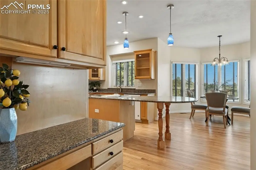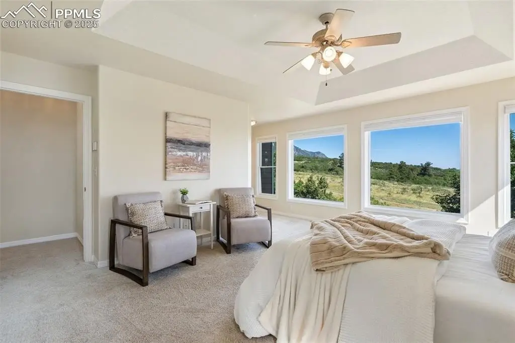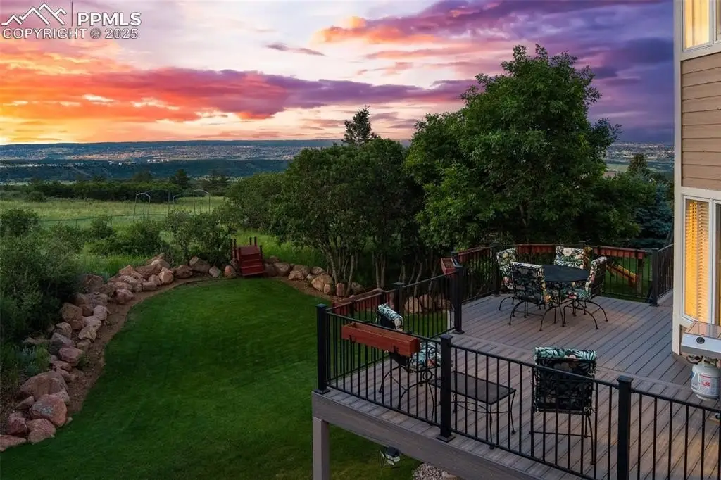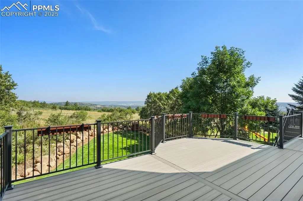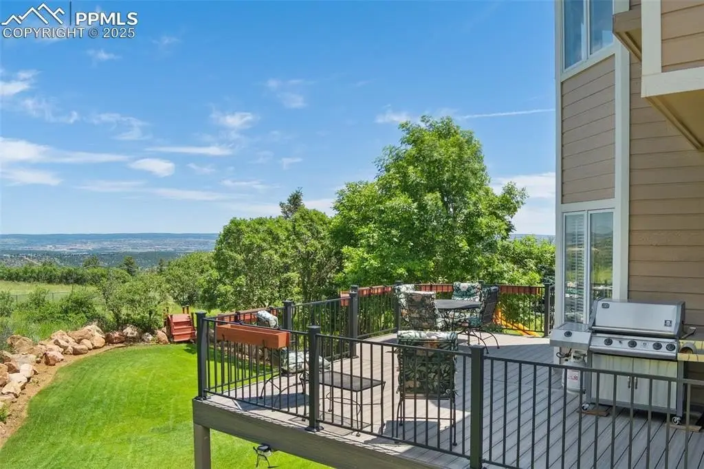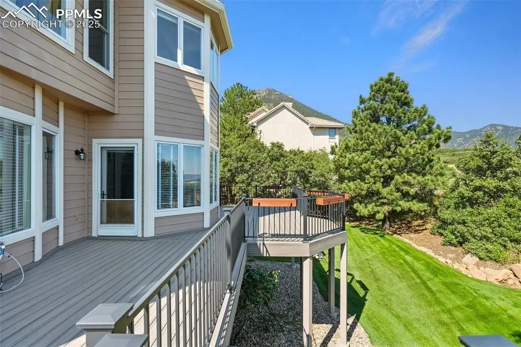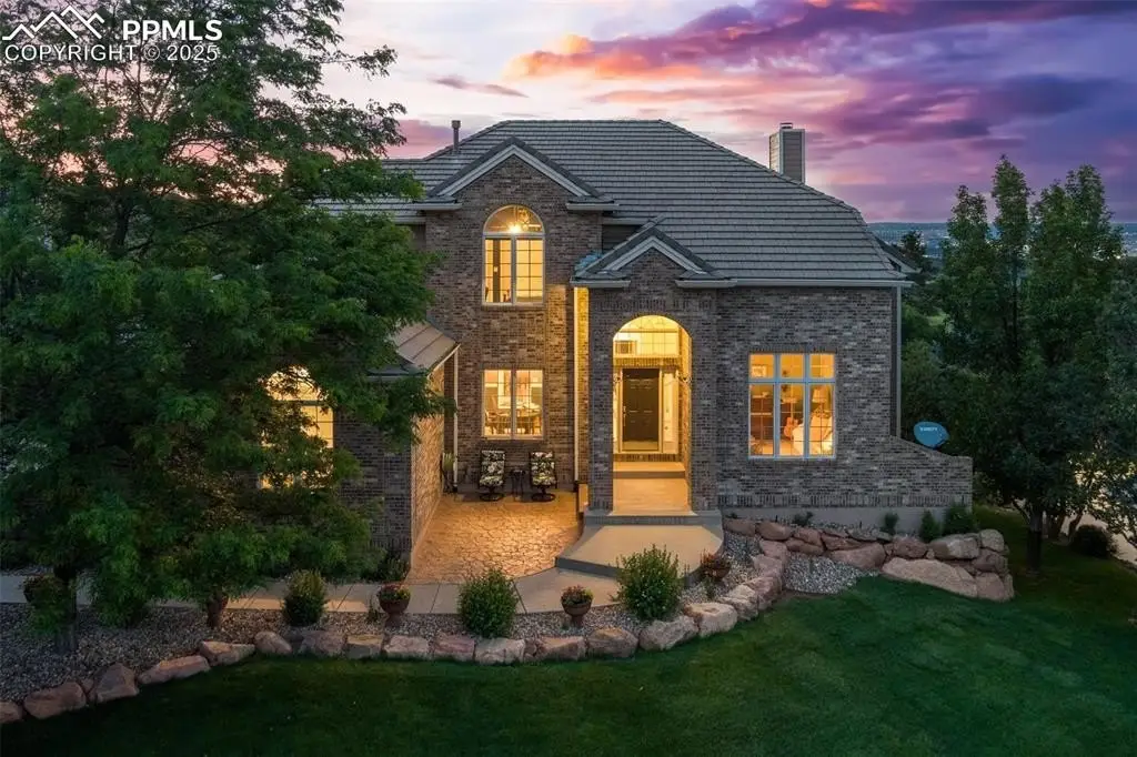Your Dream Home Awaits! Nestled in the highly sought-after Peregrine neighborhood in NW Colorado Springs, this extraordinary 6-bedroom, 5-bath residence redefines luxury living with its sweeping mountain and city views. Spanning 4,507 square feet, the home perfectly balances elegance and functionality in one of Academy District 20’s most desirable communities. Freshly painted throughout, this home welcomes you with soaring ceilings, hardwood floors, and a dramatic staircase. The spacious dining and living rooms set the tone for gatherings, while the sun-filled family room (don’t miss the sizable hidden storage!) impresses with oversized windows, a cozy gas fireplace, and captivating views of the city, mountains and Air Force Academy. The kitchen is a true entertainer’s delight, offering stone countertops, sleek cabinetry, and an island designed for conversation and function. The floor plan shines with thoughtful touches, including a private office just off the staircase and expansive windows framing views in every direction. Upstairs, the primary suite is a retreat with breathtaking panoramas, a spa-like 5-piece en suite, and walk-in closet. A junior primary with updated bath, two additional bedrooms with a shared Jack & Jill bath, plus tasteful updates throughout elevate the home. The walk-out basement offers two more bedrooms, a full bath, and a large recreation room ready for movie nights, workouts, or hosting guests. Outside, a newer 40x20 composite deck provides the perfect vantage point for enjoying both mountain views and city lights. The lot is a rare find, backing to the AFA for maximum privacy while offering usable yard space for play, gardening, or relaxation. Additional features include updated light fixtures, central AC, security system, and oversized 3-car garage with storage. With neighborhood parks, ASD20 schools, and a prime Peregrine location, this home is more than a place to live—it’s a lifestyle. Don’t miss the chance to make it yours!