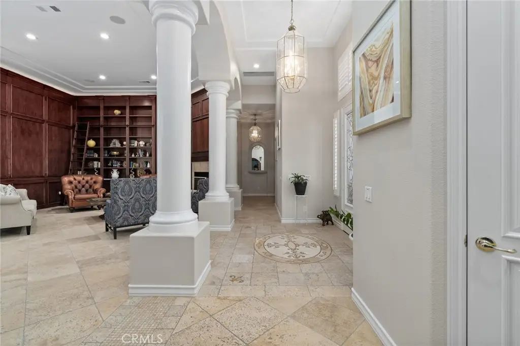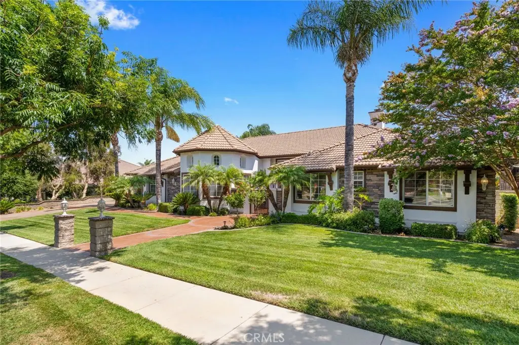Welcome to The Orchards by Amberhill--a stunning single-story estate offering nearly 4,000 square feet of luxury living on almost half an acre. This five bedroom, four bath home features soaring ceilings, an open floor plan, and elegant finishes including crown molding, plantation shutters, custom woodwork, and travertine flooring. The chef's kitchen boasts a large island with farmhouse sink, granite counters, and a spacious breakfast nook that opens to the family room. The primary suite is a true retreat with vaulted ceilings, fireplace, spa-inspired bath, and custom cabinetry. Designed for entertaining, the backyard showcases a rock saltwater pool with waterfalls, a covered patio with fans and built-in stereo, gazebo, and shuffleboard court. Gated RV parking and a 3-car garage with epoxy floors complete this one-of-a-kind property. Located in highly desirable South Corona, this home offers access to award-winning schools including Santiago High and Orange Elementary. Enjoy nearby shopping, dining, Dos Lagos and The Crossings, golf courses, parks, and easy freeway access to the 15 and 91 -- perfect for commuters. This is luxury living at its finest in one of Corona's most sought-after neighborhoods.
