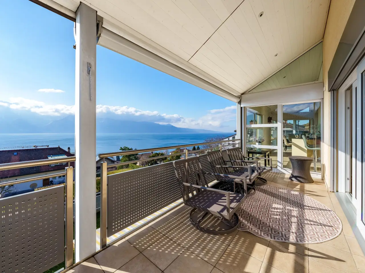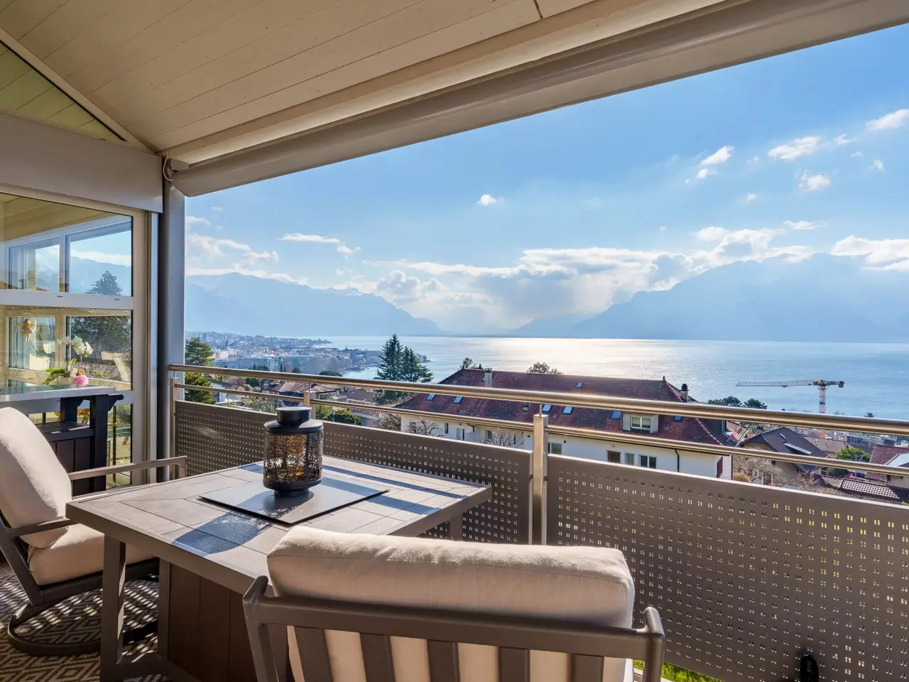 In a residence of just three units, majestically overlooking Lake Geneva, this exceptional property offers an idyllic living environment in the heart of a peaceful residential area, yet within easy reach of the Riviera's economic and cultural centers. This spacious 325 m² luxury apartment boasts breathtaking panoramic views, visible from every room. It features a large, bright living room with wood-burning stove, a pleasant dining area with direct access to a large 18 m² covered balcony, and a semi-open, fully-equipped kitchen. The same level also houses a guest toilet, a bedroom with en suite bathroom, a laundry room, and a second covered balcony of over 14 m², ideal for enjoying the outdoors in any season. The first floor, accessible by elevator, houses an elegant master suite with shower room, dressing room and storage space, as well as a generous second bedroom of 25 m². The impressively spacious attic features two large attic rooms, one with a dressing room. A central shower room and sauna complete this space dedicated to relaxation. An 80 m² garage with space for up to four vehicles (extra charge), a cellar and an air-conditioned wine cellar round off the top-of-the-range features of this unique property. The property is currently rented.