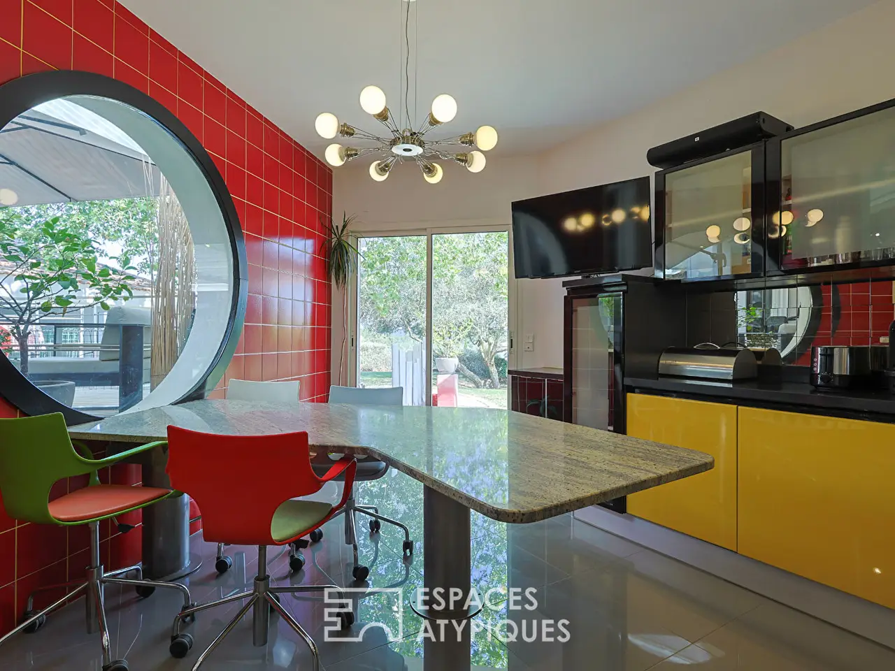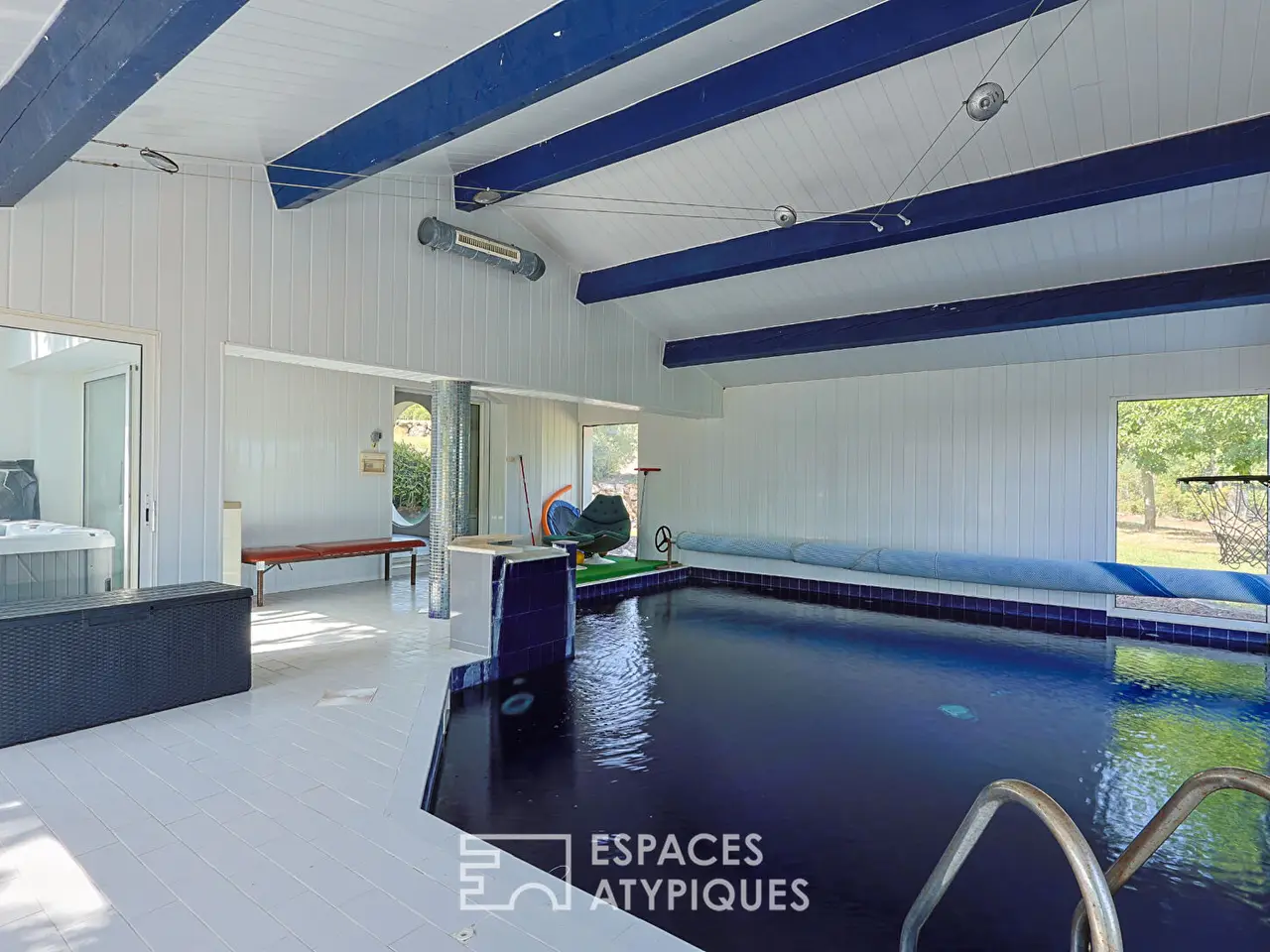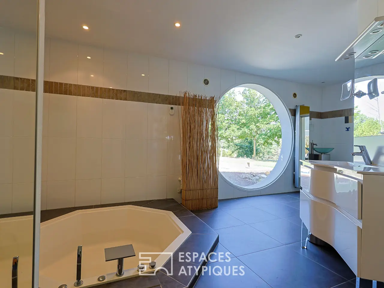 Nestled in a popular area of Cotignac, voted the most beautiful villages in France, this architect-designed property with brutalist notes was designed in 1995. It covers 223 m2 on a landscaped and magnificently wooded garden of 4800 m2. The entrance opens onto a pleasant living room, calm and bright which consists of: a cozy living room and its modern fireplace, a spacious kitchen with a 70's feel bathed in light thanks to its round bull's-eye window , and its covered wooden terrace overlooking a mosaic pool. On the same level, we find an office (which can also be used as a bedroom) and a studio with independent entrance, bathroom and kitchenette. A few stairs separate the two other spacious bedrooms with shared bathroom and the master suite. The latter confirms the originality of the place with its starry ceiling, its king size bathtub and its private sauna. The mezzanine floor serves a comfortable cinema room. Few outdoor spaces promise privacy and tranquility as well as the indoor relaxation area where you can enjoy a heated swimming pool and a jacuzzi. A garden workshop, a 3 place carport, a children's play area and a garage complete this unique property. Cotignac, a village of character renowned for its incredible cliff, is located 1 hour from the sea, 1h30 from Marseille Provence airport and 1h20 from Saint Tropez. ENERGY CLASS: B100 / CLIMATE CLASS: A3.Estimated average amount of annual energy expenditure for standard use, established based on energy prices for the year 2021: between EUR1,250 and EUR1,760 per year. Additional information * 7 rooms * 5 bedrooms * 1 bathroom * 2 shower rooms * 1 floor in the building * Outdoor space : 4800 SQM * Parking : 7 parking spaces * Property tax : 2 957 €