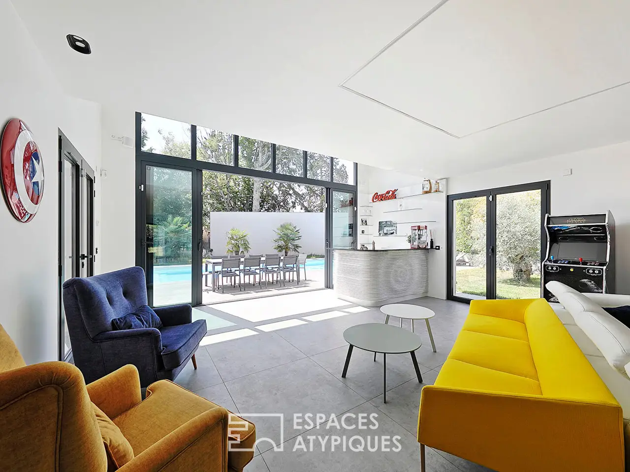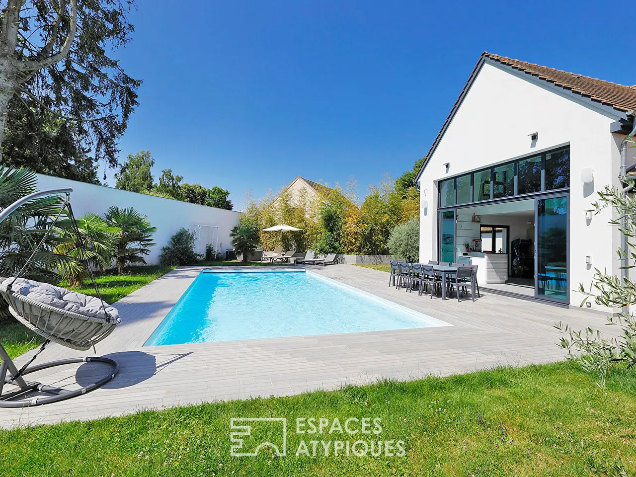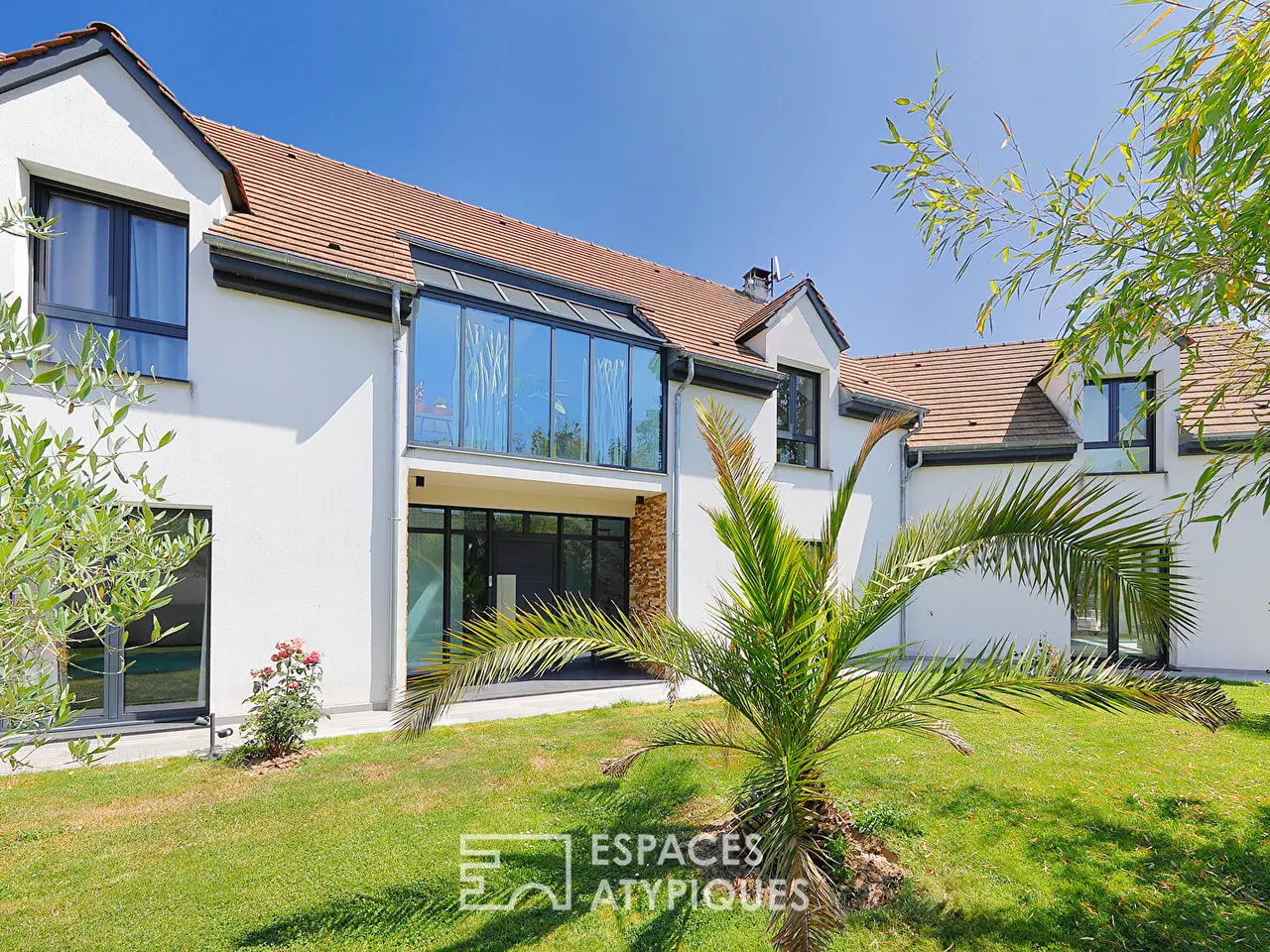 Maison d'architecte avec piscine et jardin paysagerIn a hamlet halfway between Crecy-la-Chapelle and La Ferte-sous-Jouarre in a preserved and green environment, this contemporary architect-designed house from 2018 develops a living space of 442sqm in total on two levels, on a landscaped plot of almost 2800sqm. Designed to combine volume, light and high-end comfort, it has five suites, a heated salt-water swimming pool, a jacuzzi, a 50sqm garage with a fast-charging electric terminal, and an unobstructed view of the countryside. From the entrance, the clean lines, the chosen materials, the brightness and the generosity of the volumes set the tone. The ground floor houses a master suite with a double dressing room and shower room, an office space, a dining room, a separate fitted kitchen with a scullery and pantry, bathrooms, and a living room bathed in light through a bay window opening onto the terrace and the swimming pool. A bar area and a home cinema with multiple screens enhance the conviviality of the place. Upstairs, the glass-floored landing leads to three suites with a dressing room and shower room, a fourth suite with a spa bathroom, a mezzanine living room and a gym/games room. The carefully designed interior layout allows for smooth and functional circulation. The outdoor spaces offer a real relaxing break: a 5×11 m heated swimming pool, a 5-seater jacuzzi, a continuous terrace, a fitted summer kitchen, a shower room and bathrooms for exiting the pool or spa, as well as a landscaped garden structured around various species, olive trees, palm trees, cherry trees and colorful hedges. The equipped well provides watering and supplies the sanitary facilities. One hour from Paris, this property benefits from a bucolic setting while remaining close to amenities, schools and transport links. Solar panels, underfloor heating by insert, reversible heat pumps, double aluminum glazing, home automation and optimal energy performance: a rare property, with an atypical character, ideal for a large family and with strong rental potential, currently operated as an Airbnb. ENERGY CLASS: A / CLIMATE CLASS: A Amount of annual energy expenditure for standard use established from energy prices indexed for the years 2021, 2022, 2023 (subscription included) between EUR965 and EUR1305 per year. Contact: Elvire de la MARTINIERE - 06 03 05 05 96 RSAC: 800 930 232 MEAUXREF. SM1158Additional information* 11 rooms* 5 bedrooms* Outdoor space : 2748 SQM* Parking : 5 parking spaces* Property tax : 3 797 €Energy Performance CertificatePrimary energy consumptiona : 41 kWh/m2.yearHigh performance housing*41kWh/m2.year1*kg CO2/m2.yearA*B*C*D*E*F*GExtremely poor housing performance* Of which greenhouse gas emissionsa : 1 kg CO2/m2.yearLow CO2 emissions*1kg CO2/m2.yearA*B*C*D*E*F*GVery high CO2 emissionsEstimated average annual energy costs for standard use, indexed to specific years 2021, 2022, 2023 : between 965 € and 1305 € Subscription IncludedAgency feesThe fees include VAT and are payable by the vendorMediatorMediation Franchise-Consommateurswww.mediation-franchise.com29 Boulevard de Courcelles 75008 ParisInformation on the risks to which this property is exposed is available on the Geohazards website : www.georisques.gouv.fr