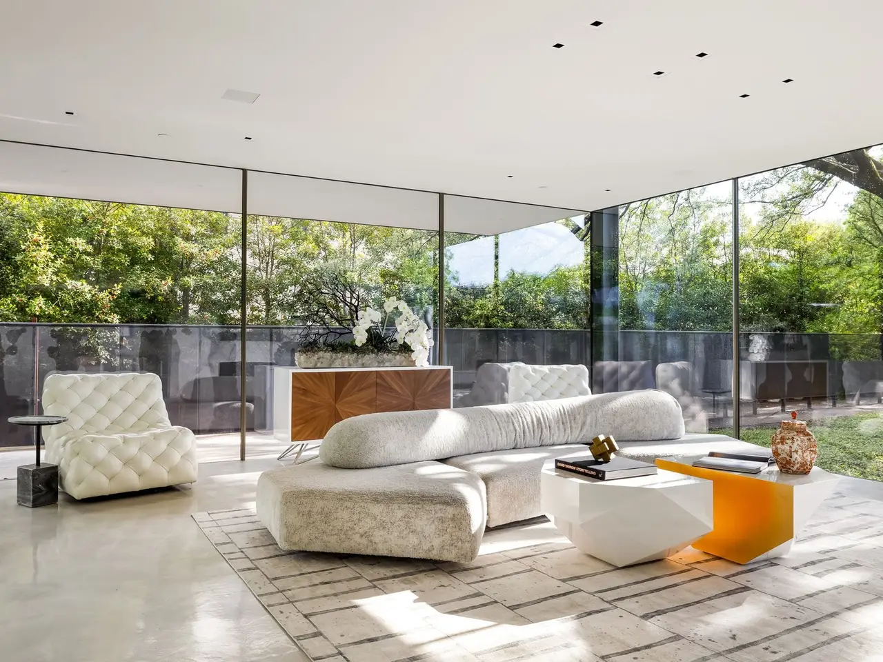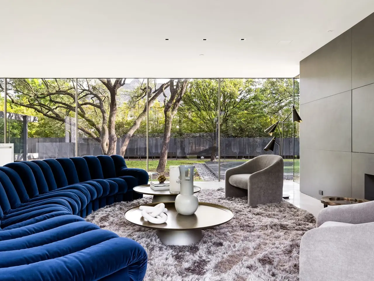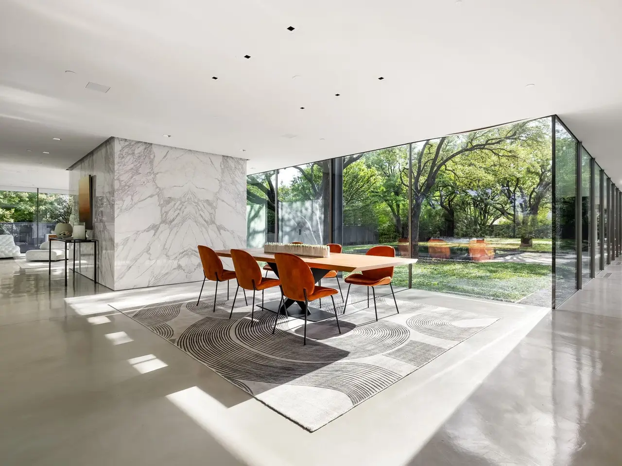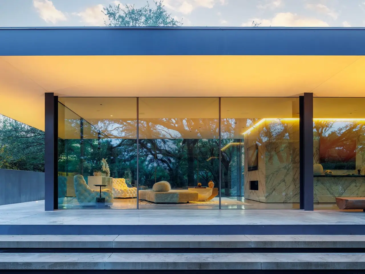 Inspired by the famous Farnsworth house, this modern masterpiece was constructed with 60 tons of steel, over 40 slabs of Calacatta marble, & cantilevers over a 5 ft-deep basement with 10,000 SF under the roof. Encased by 9 ft floor to ceiling glass windows, the home floats over the natural, minimalistic landscape intended to feel like art in park, designed by internationally-recognized Hocker Design Group. Custom acoustic ceilings keep sound from bouncing off the glass & concrete. Striking pool made of absolute black granite in concentric rings features a waterfall edge, creating the aesthetic of a floating square water-feature in the middle of the backyard oasis.