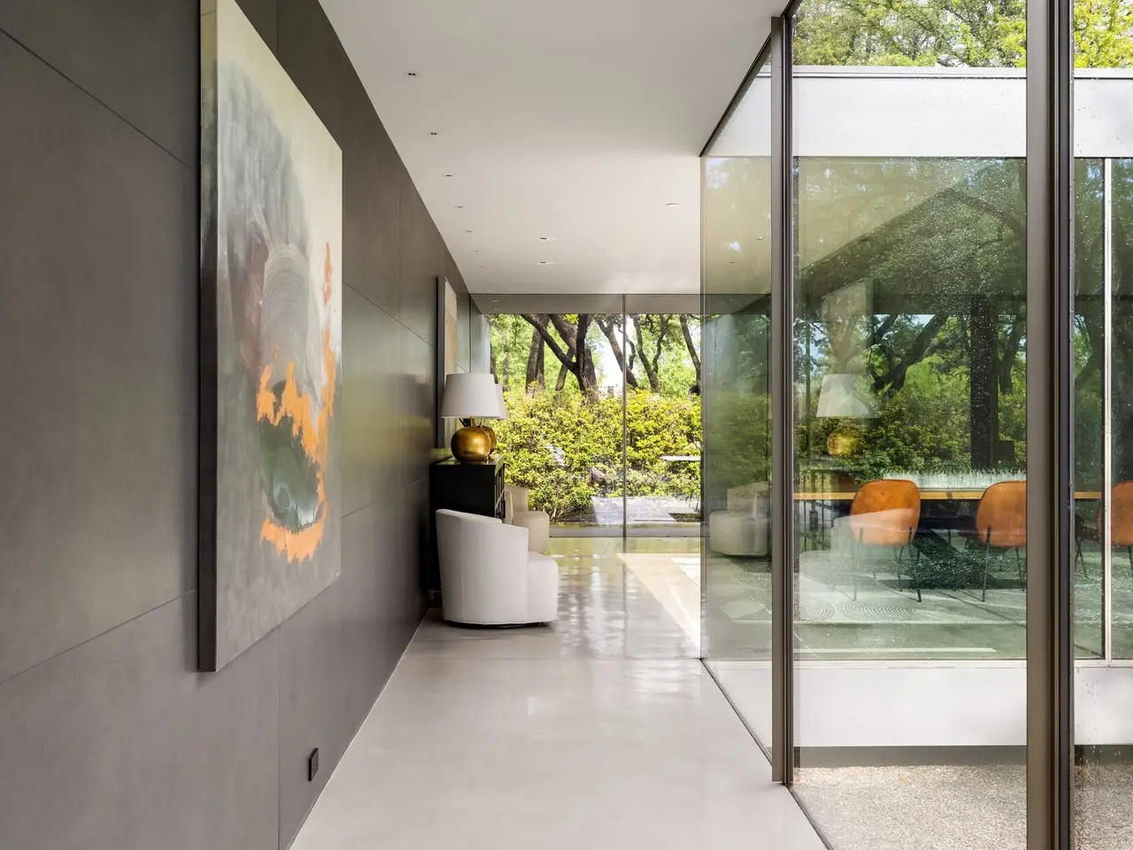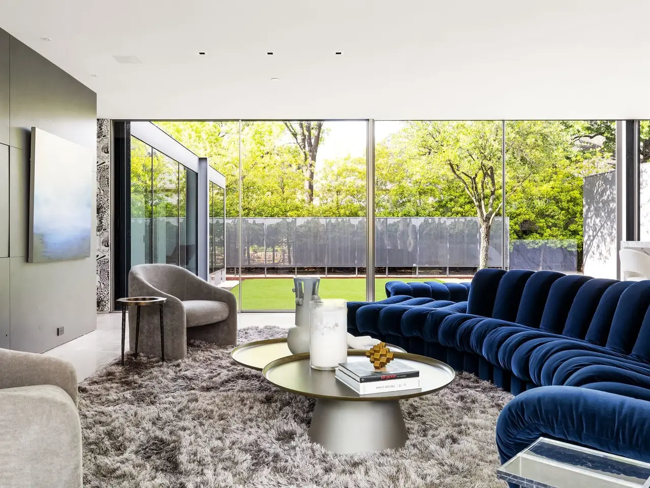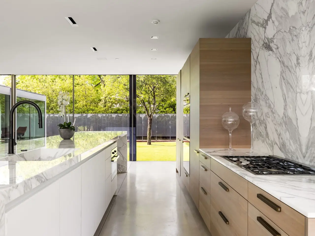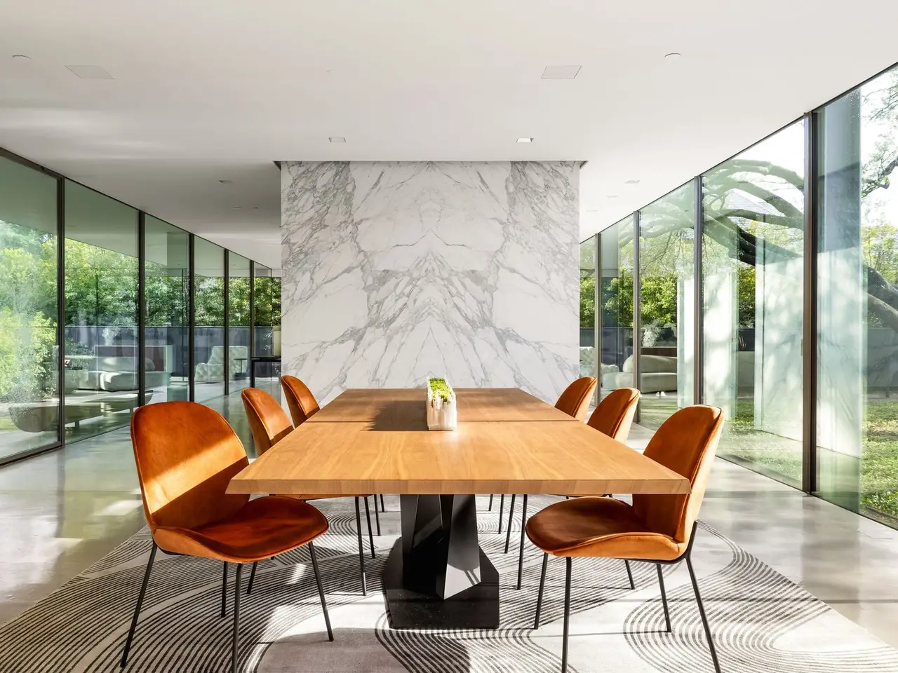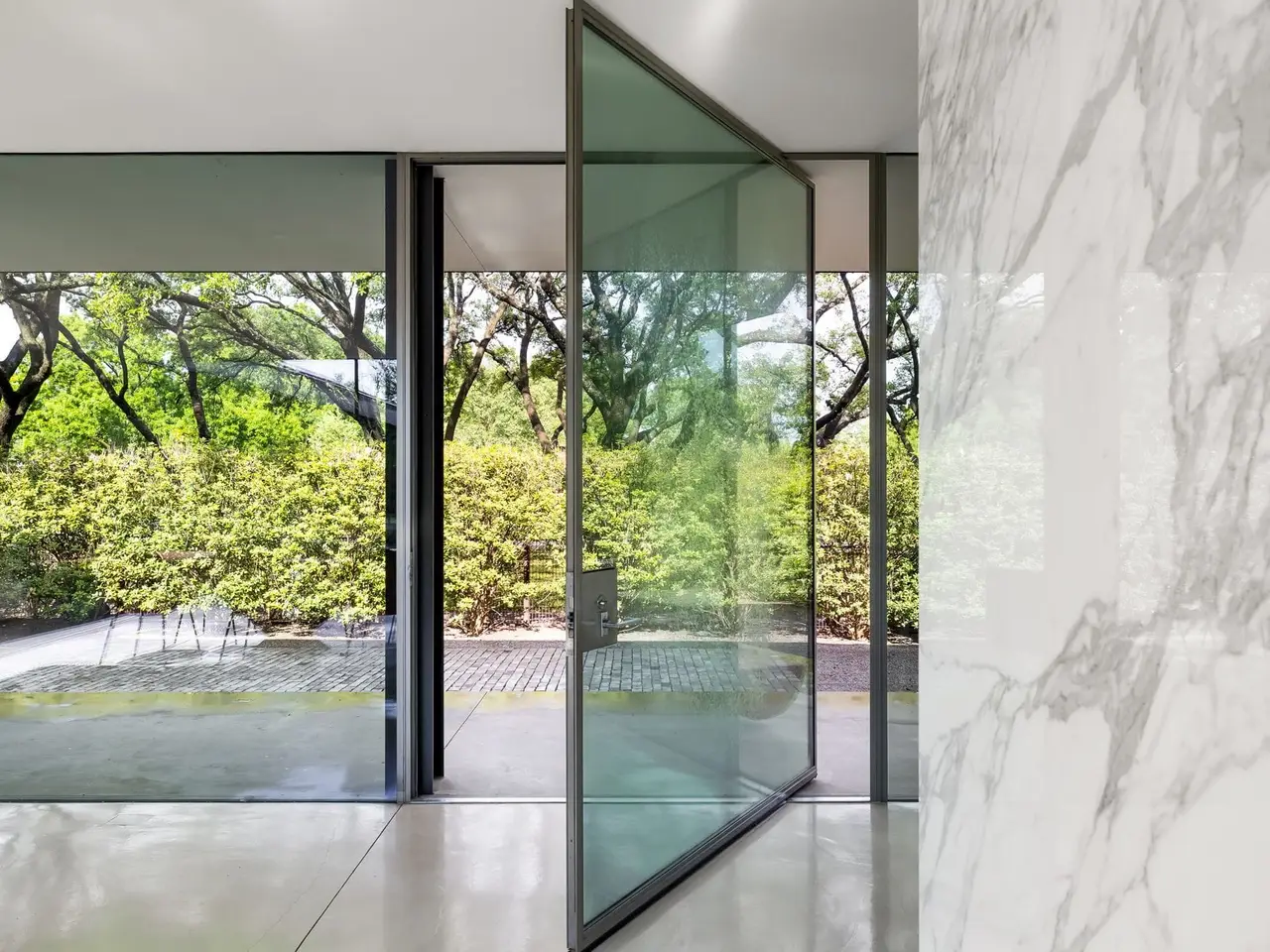 Inspired by the famous Farnsworth house, this modern masterpiece was constructed with 60 tons of steel, over 40 slabs of Calacatta marble, & cantilevers over a 5 ft-deep basement with 10,000 SF under the roof. Encased by 9 ft floor to ceiling glass windows, the home floats over the natural, minimalistic landscape intended to feel like art in park, designed by internationally-recognized Hocker Design Group. Custom acoustic ceilings keep sound from bouncing off the glass & concrete. Striking pool made of absolute black granite in concentric rings features a waterfall edge, creating the aesthetic of a floating square water-feature in the middle of the backyard oasis.