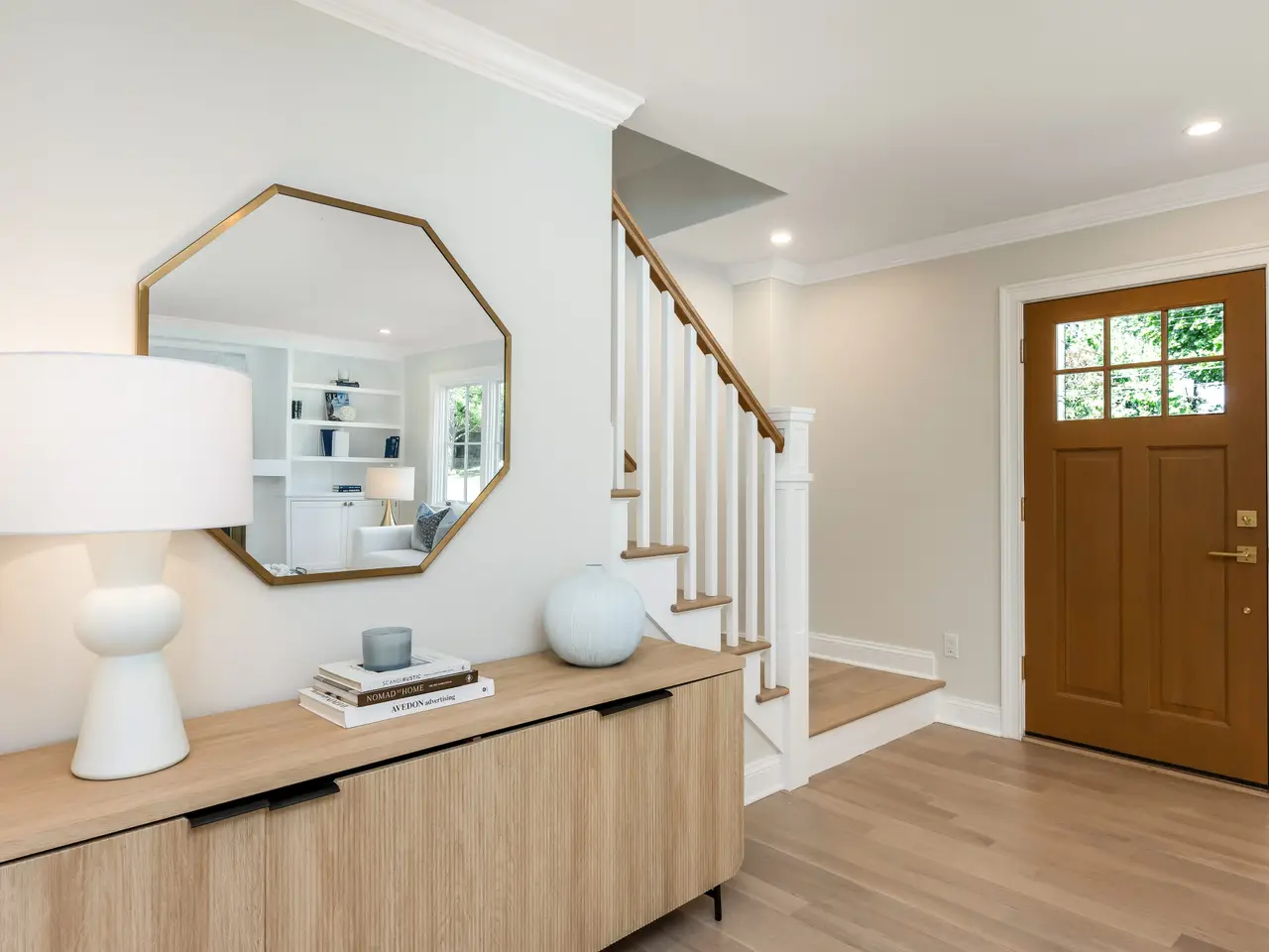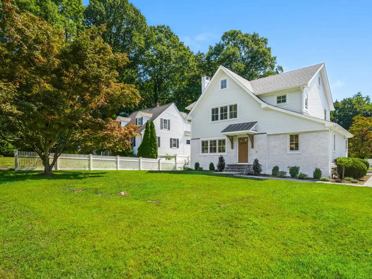 This newly re-built 4-bedroom, 3-bath Colonial offers 2400 sq feet of finely crafted living space on a level .25-acre lot. Set on the corner of Anthony Lane and a cul-de-sac, the property pairs neighborhood charm with privacy. Enjoy the outdoors in a newly fenced yard with professional landscaping and a full irrigation system. Inside, the open layout is defined by natural light and superior craftsmanship. White oak floors run throughout the home, complemented by custom millwork and oversized windows. The living room's fireplace, framed by built-in cabinetry, provides both warmth and architectural interest.The chef's kitchen impresses with custom cabinetry, quartz countertops, and high-performance energy-efficient appliances. A large mudroom with integrated laundry is designed for durability and organization. A first-floor bedroom offers versatility as an office, guest suite, den or playroom. The full bath is finished with frameless glass shower ensuring comfort and style. Upstairs, three bedrooms feature ample closets and abundant light. The hall bath includes a glass-enclosed tub/shower, dual windows, heated floor. The primary suite features two large closets and bath highlighted by a walk-in shower, heated floors, double sink vanity and polished finishes. With zoned propane heating, central air, and a balance of classic proportions and modern amenities this home combines elegance and functionality less than one mile to shops, dining and transportation of Noroton Heights.