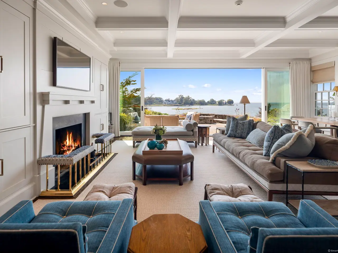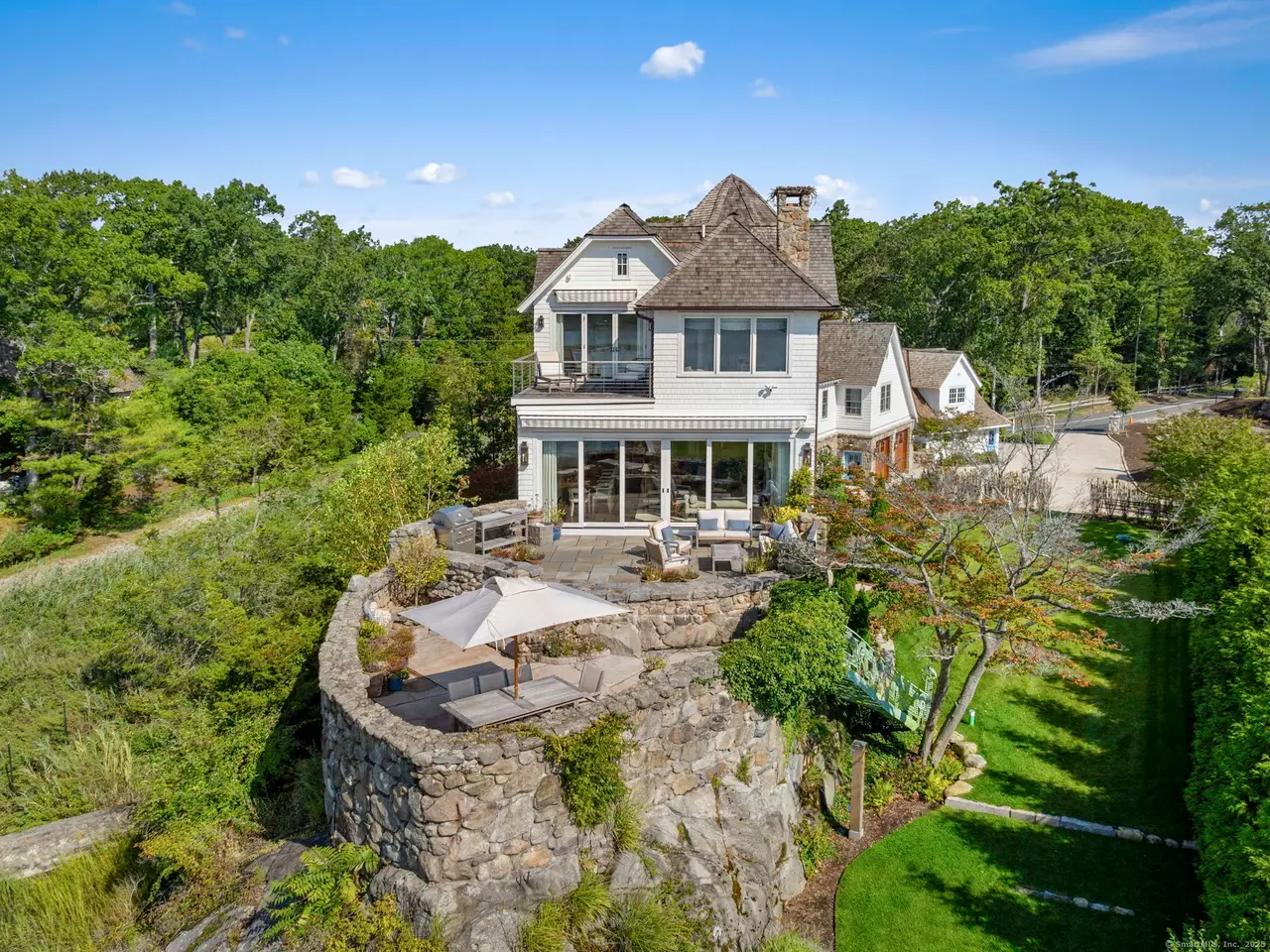 25 Tokeneke Trail - Where the Sky meets the Sea. Wake up to breathtaking sunrises, spend afternoons on the water, and end each day with sunset views from your private terrace. 25 Tokeneke Trail isn't just a home-it's a lifestyle. Perfectly perched above the shoreline and not in a flood zone, this stunning waterfront retreat offers direct access to the water with its own private beach, dock and mooring. Designed for seamless indoor-outdoor living, nearly every room frames panoramic water views. Multiple stone terraces, a firepit, and lush landscaping create the perfect setting for entertaining or quiet relaxation. Inside, over 6,000 sq. ft. of refined living space includes five bedrooms, seven baths, and a private studio suite over the detached garage ideal for a guest house or private retreat. Minutes from downtown Darien and the train to NYC, this rare property blends the serenity of coastal living with the best of modern luxury.