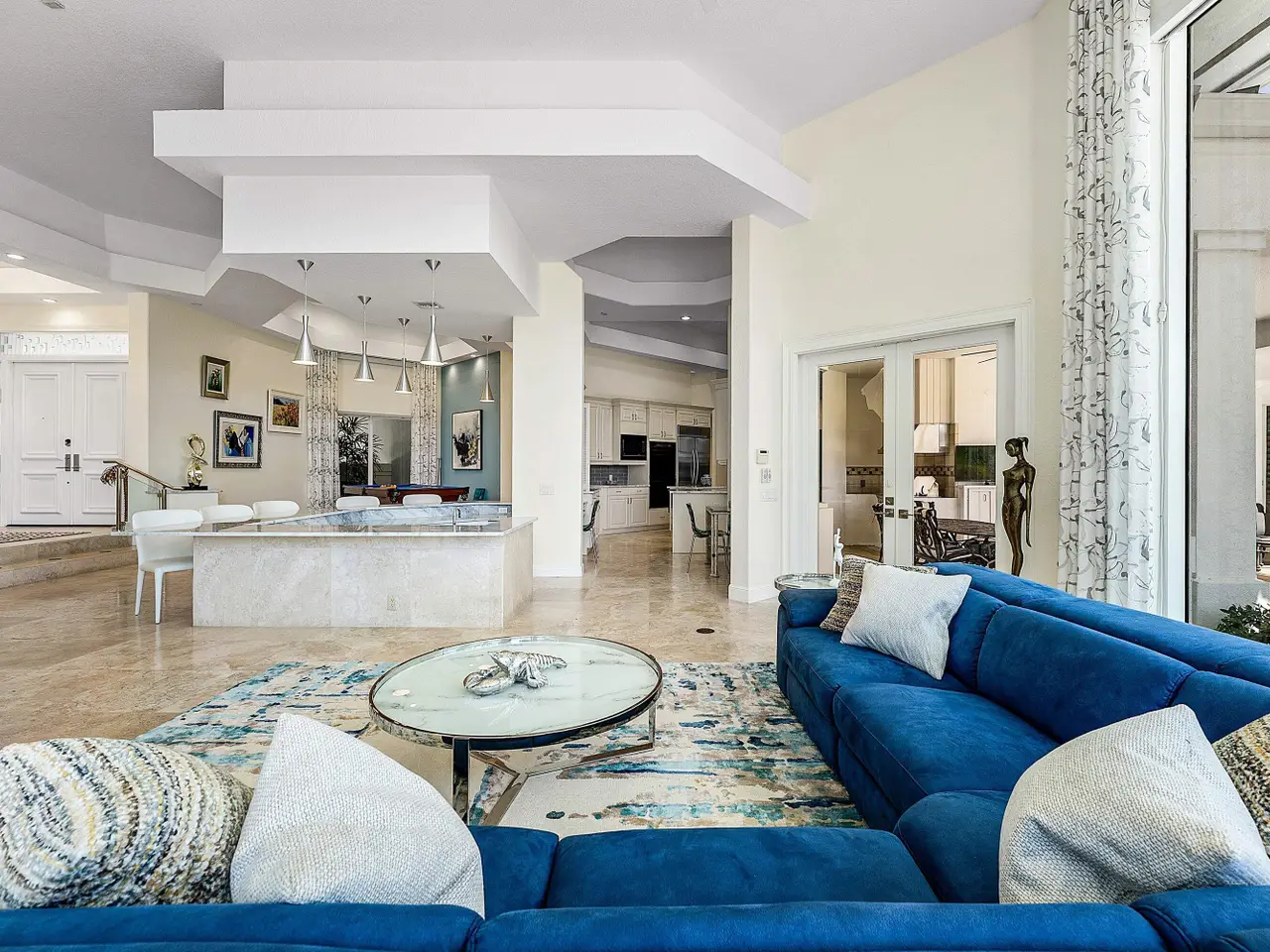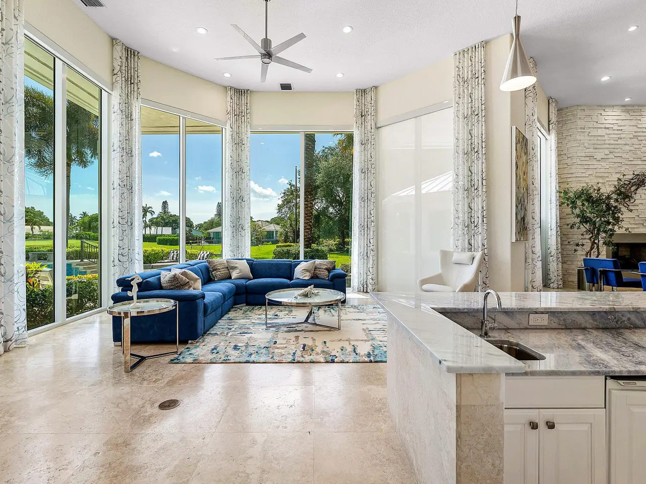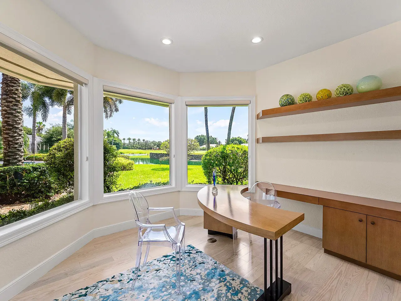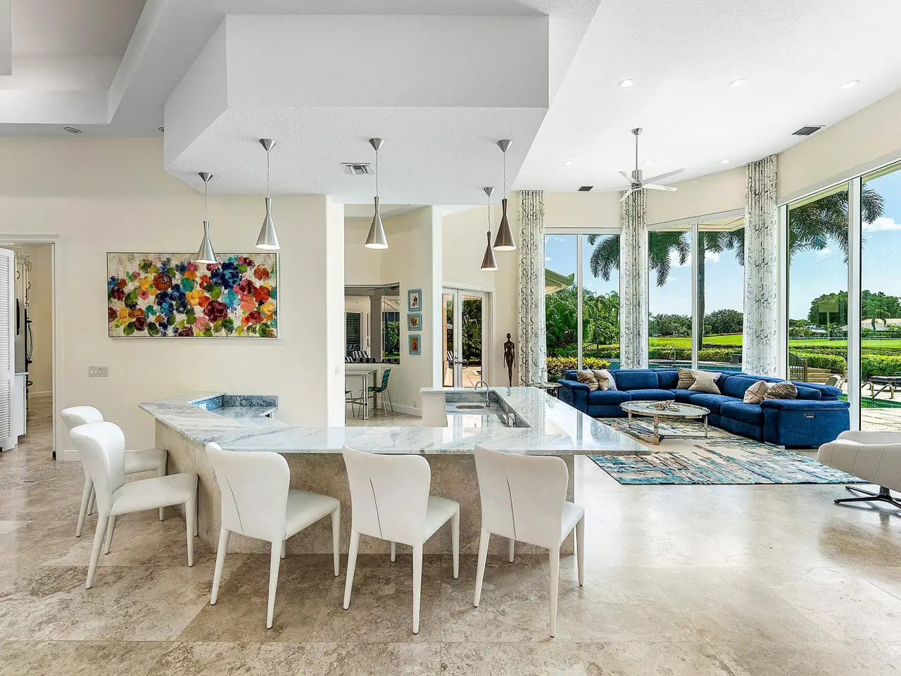 Custom-Built Estate in Seagate Country Club! Nestled in the prestigious Estates Section of desirable Seagate Country Club, this custom-built home spans over 1.33 acres with breathtaking golf course and lake views. Designed for both elegance and comfort, this residence features a split floor plan with 4 spacious bedrooms plus 2 offices. The primary suite, located in its own private wing, offers a luxurious walk-in closet, dual bathrooms, and a cozy sitting area overlooking the pool, golf course, and beyond. Highlights include: Marble and wood flooring throughout. An impressive bar with striking blue marble stone. A chef's kitchen with matching blue marble, custom cabinetry, walk-in pantry, and a picture window framing the expansive patio & outdoor kitchen.