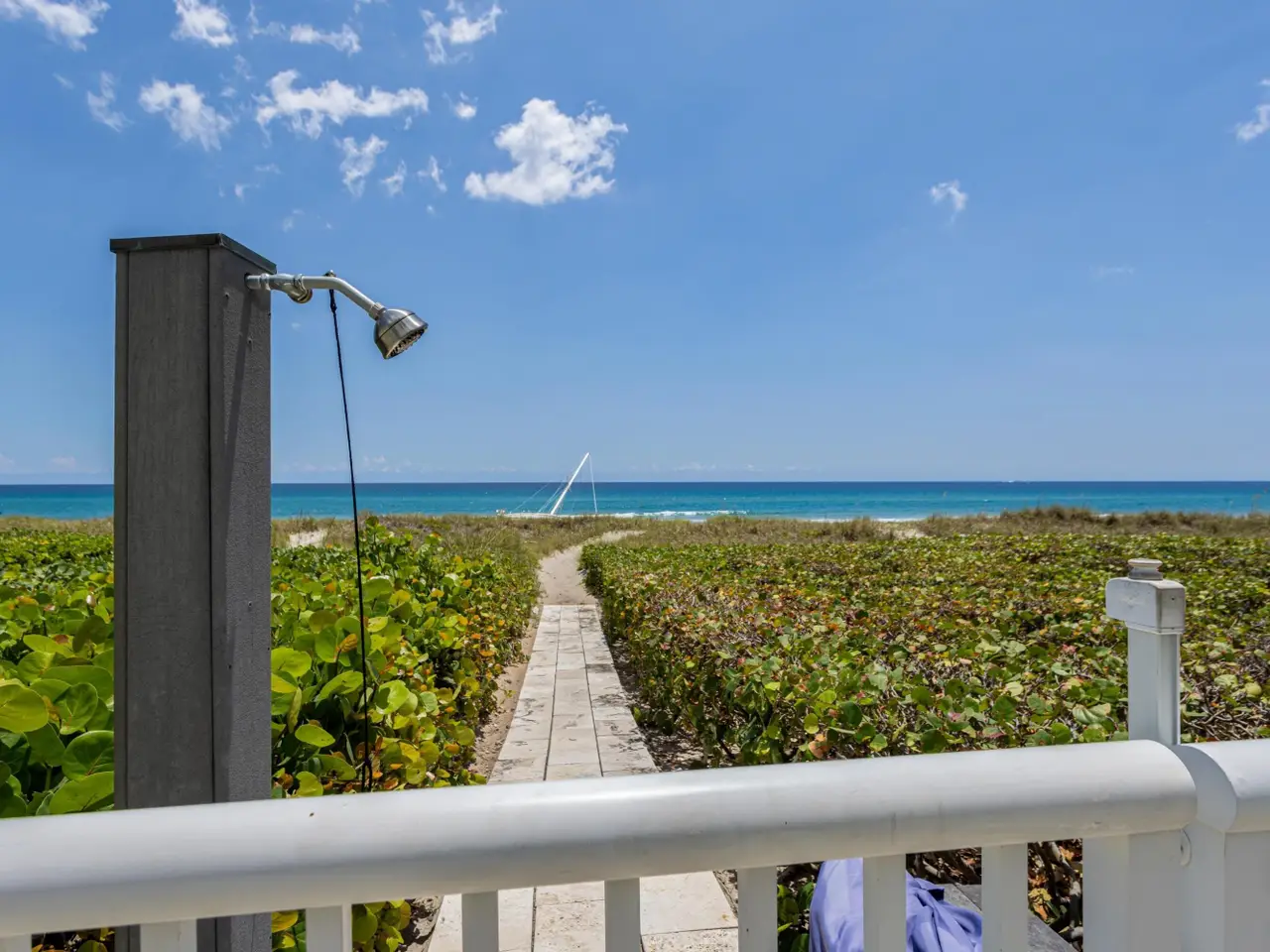 Located in a private, gated oceanfront enclave of only three homes, this elegant British West Indies-style home offers an open floor plan with large rooms and elegant interior. Unique features include third story viewing balcony, deeded beach access with a private beach pathway, formal living room and dining room, first-floor VIP bedroom, expansive balconies and large office with fireplace.