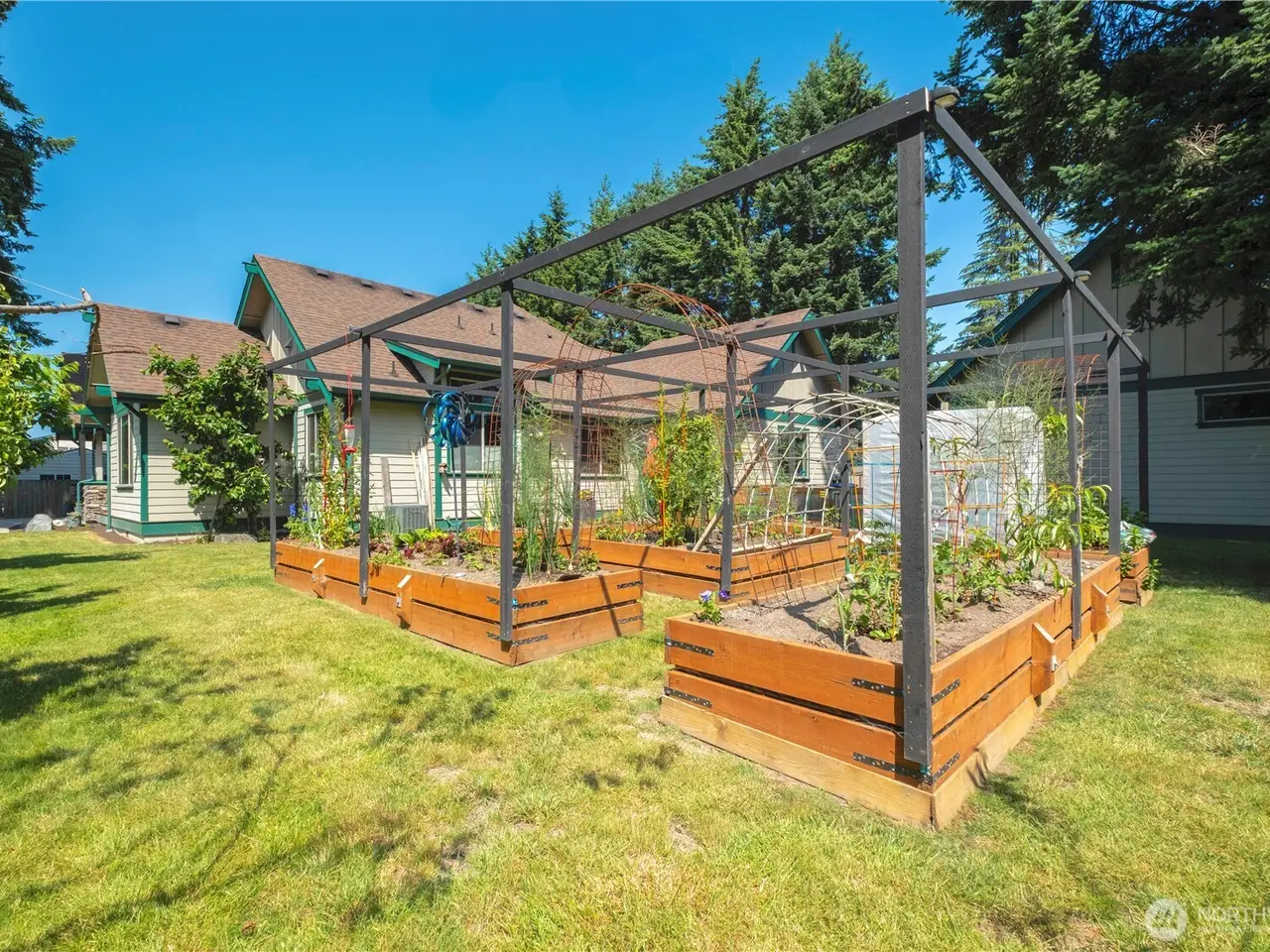 Don't miss this private lodge style sanctuary! The flat almost 1/2-acre lot with private drive & gated entry boasts a one-story 2014 custom-built home that is a car collector's dream! It has an oversized 3-car attached garage + 4-car detached shop w/1/2 bath & 10' doors for your RV/boat. The home has a grand covered entry that leads to sizable foyer w/adjacent office, vaulted ceilings & an open great room w/gas fireplace, dining area, & cook's kitchen. The luxurious primary suite features a spa-style bath. Step outside to the 422+ SF covered patio w/fireplace, built-in BBQ & TV wiring. Fenced yard w/fruit trees and a garden of raised beds- your urban farm to table awaits! Mature landscaping throughout. Sewer connected. Minutes from I-5 and 509.