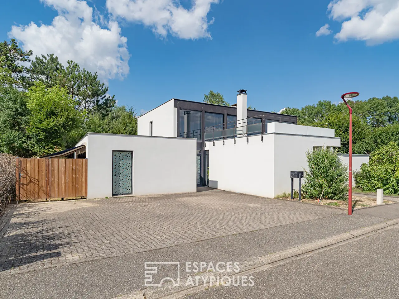 Just 20 minutes from Strasbourg, this Le Corbusier-inspired architect-designed house offers a total living area of 288 m2 on a wooded plot of over 10 acres. Organized around a light-filled central patio, it offers a rare living environment, combining generous volumes, exceptional brightness, and an intimate garden shielded from view. Included in the living space is a 90 m2 adjoining apartment, which is completely independent and offers multiple possibilities for use.The interior layout is very fluid and has been designed to offer comfortable living on one level. The ground floor features an entrance hall leading to the living areas: a fully equipped kitchen opening onto the patio, a dining room, and a cozy living room with a fireplace, ideal for relaxing moments. A second living room extends these spaces and provides direct access to the garden. This level also offers a bedroom, a shower room, a functional pantry, and a garage. Upstairs, an extension built in the 1990s houses three bedrooms, a bathroom with a skydome, and a light-filled mezzanine with access to a roof terrace, ideal for creating a private outdoor space at height.The adjoining apartment is entirely on one level and has independent access. The entrance opens onto a custom-built office space. Comprising a living room and a dining room, the living area extends into a separate kitchen and two pleasant terraces nestled in a lush green garden. A bathroom and two bedrooms overlooking the garden complete the amenities. Completely self-contained, it is an ideal solution for hosting a loved one, considering a home-based business, or generating rental income.Outside, a large tree-lined garden extends the living space, providing peace and privacy. This green space, with no neighbors overlooking, is a real living space in its own right, perfect for relaxation. The central patio, the true heart of the house, invites contemplation, creating a constant dialogue between inside and outside. The environment is peaceful, in a sought-after residential area, with all amenities close by: shops, schools, and access to major roads.This unique property appeals with its distinctive architecture, modular spaces, and remarkable potential. A discreet address, designed for lovers of unique properties A confidential address, designed for lovers of unique properties looking for a different and inspiring living environment.4 outdoor parking spacesShops 5 minutes' walk awaySchools 7 minutes' walk awayREF. 1581Additional information* 8 rooms* 6 bedrooms* 1 bathroom* 2 shower rooms* 1 floor in the building* Outdoor space : 1027 SQM* Property tax : 1 753 €Energy Performance CertificatePrimary energy consumptione : 253 kWh/m2.yearHigh performance housing*A*B*C*D*253kWh/m2.year8*kg CO2/m2.yearE*F*GExtremely poor housing performance* Of which greenhouse gas emissionsb : 8 kg CO2/m2.yearLow CO2 emissions*A*8kg CO2/m2.yearB*C*D*E*F*GVery high CO2 emissionsEstimated average annual energy costs for standard use, indexed to specific years 2021, 2022, 2023 : between 2980 € and 4080 € Subscription IncludedAgency feesThe fees include VAT and are payable by the vendorMediatorMediation Franchise-Consommateurswww.mediation-franchise.com29 Boulevard de Courcelles 75008 ParisInformation on the risks to which this property is exposed is available on the Geohazards website : www.georisques.gouv.fr