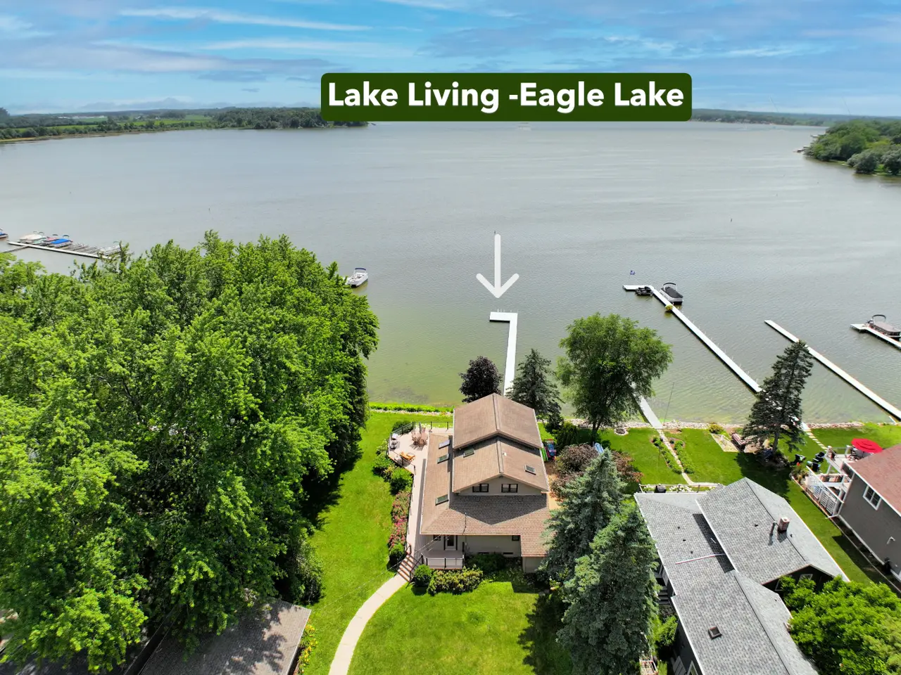 Imagine beginning your day with the breathtaking views of Eagle Lake, presenting a remarkable lakeside living experience. You can enjoy the final days of summer on your 87-foot flat lot, which offers stunning water views from a spacious, modern deck and a newly constructed pier with an expanded platform. Inside, you will find an inviting layout with a kitchen that features a large island, granite countertops, a tiled backsplash, stainless steel appliances, and attractive hardwood flooring. Enjoy the abundance of natural light from the numerous windows and new patio doors that showcase the beautiful lake perspectives from every angle. Two primary bedroom suites, situated on different levels, provide a wonderful sense of privacy for residents. The upstairs suite boasts a private balcony, a gas fireplace, and vaulted ceilings that enhance your appreciation of the peaceful lake views.