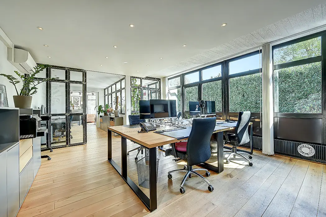 An individual and modern architect's house awaits you here, which was renovated to a very high standard and in style in 2016 and is still in excellent condition today. The property offers future residents a variety of possible uses, as there is an office area of around 137 m² directly adjacent to the main house with its approx. 225 m² of living space, both on the garden level and on the first floor. This is accessed separately via its own entrance and can continue to be used commercially in this form or serve as a granny apartment in the future, or can be connected to the main house to create a total of around 360 m² of living space without much effort, as it has already been converted into a living space. A door already connects these areas on the garden level. The split-level architecture, fantastically bright rooms, a timeless and exclusive interior design and a total of three terrace areas as well as a large garden make this property from 1972 a very special offer. The 897 m² plot is a leasehold property with an attractive and fair ground rent (currently only €3,051 p.a.). Thanks to the special layout, this property is ideal for multi-generational living, living and working next door to each other, or for merging or renting out the commercial unit. You enter the main house via the sheltered entrance area, where you will also find the front of the two terraces. A small entrance hall with guest WC and walk-in wardrobe leads to the loft-like living/dining area with open kitchen and fireplace. The modern fitted kitchen has a cooking island, which gives the room a special flair. Floor-to-ceiling window elements provide a great view and plenty of light both to the garden terrace with outdoor fireplace behind and to the front. Adjacent to this central room on the first floor is another living room, which is ideal as a cozy TV room or library. An open staircase leads from the living/dining area to the upper floor and garden level. Two bedrooms, each with an en suite bathroom, and a small study await you on the upper floor. The spacious bathroom in the master bedroom in particular leaves nothing to be desired in terms of design and function. The second bedroom also has a balcony on the garden side. On the garden level, there are two further bedrooms, a shower room, the boiler room, two cellar rooms and a hallway. One of the bedrooms also has access to the house's garden from this level. A door leads to the lower office area, where there is a room facing the garden with access to it, a staff kitchen and an interior room. A spiral staircase takes you from here to the first floor, which is bright thanks to its large windows and has three further rooms, some of which are separated by modern glass and steel structures, giving the floor a great sense of space. Another small kitchen, a shower room and a WC complete the floor plan here. The third terrace is located in front of the extension and you enter this area from the street via a separate entrance on the side of the house, so that there is a clear spatial separation of the two areas from the outside. You can reach the garden of the house via the terrace of the living area with a few steps as well as via two rooms on the garden floor or the terrace of the office area. Here, a large lawn invites you to play, as does a small outdoor sports field covered with mats. A modern garden shed and a large shipping container provide additional storage space. On the street side, the garden is protected from view thanks to a wall and dense hedge and offers plenty of space, especially for the younger residents of the house, while the large garden terrace with outdoor fireplace invites the older ones to enjoy cozy barbecue evenings. There are a total of 4 parking spaces in front of the house and a small wooden shed offers space for bicycles or motorcycles.
