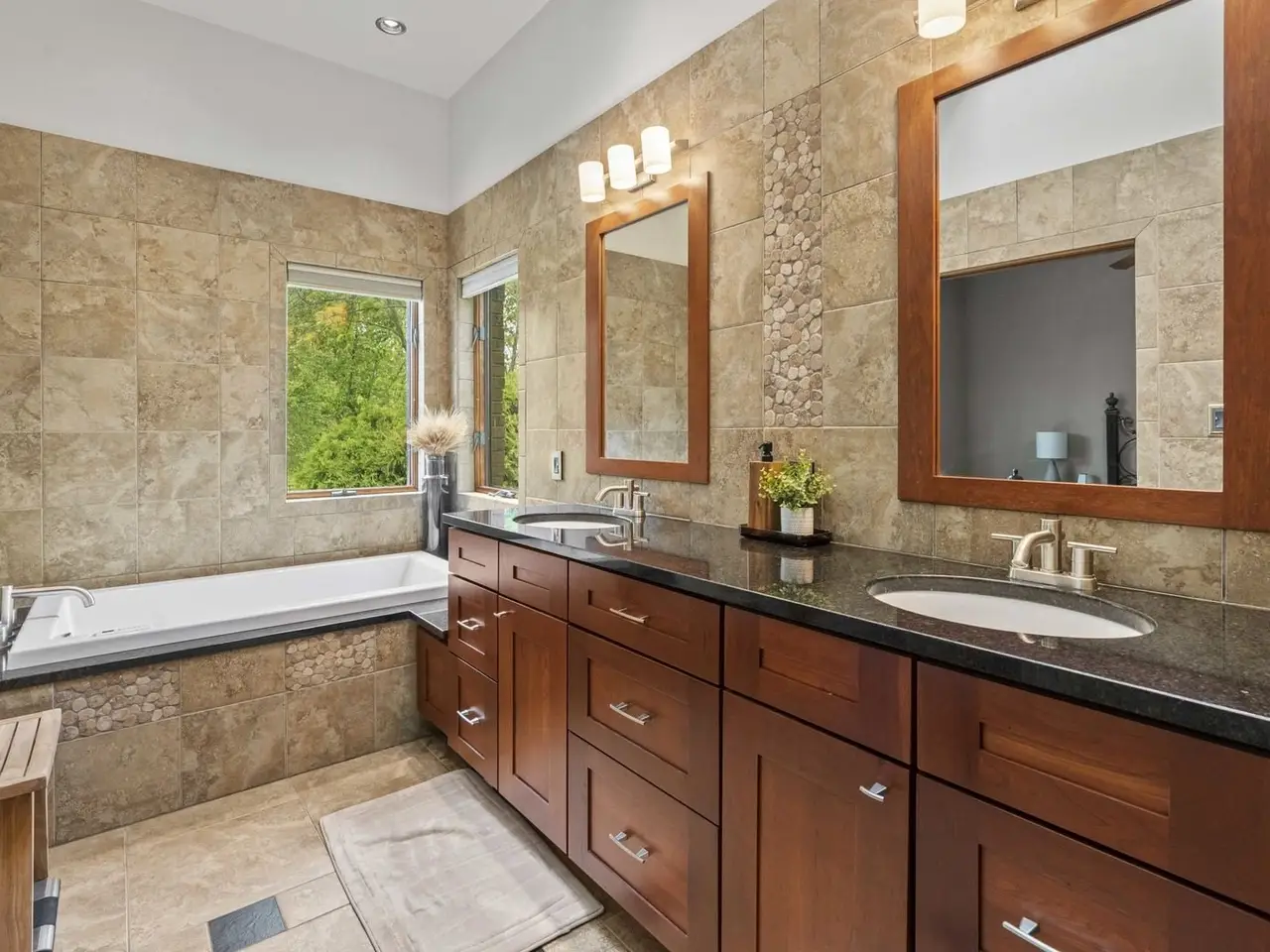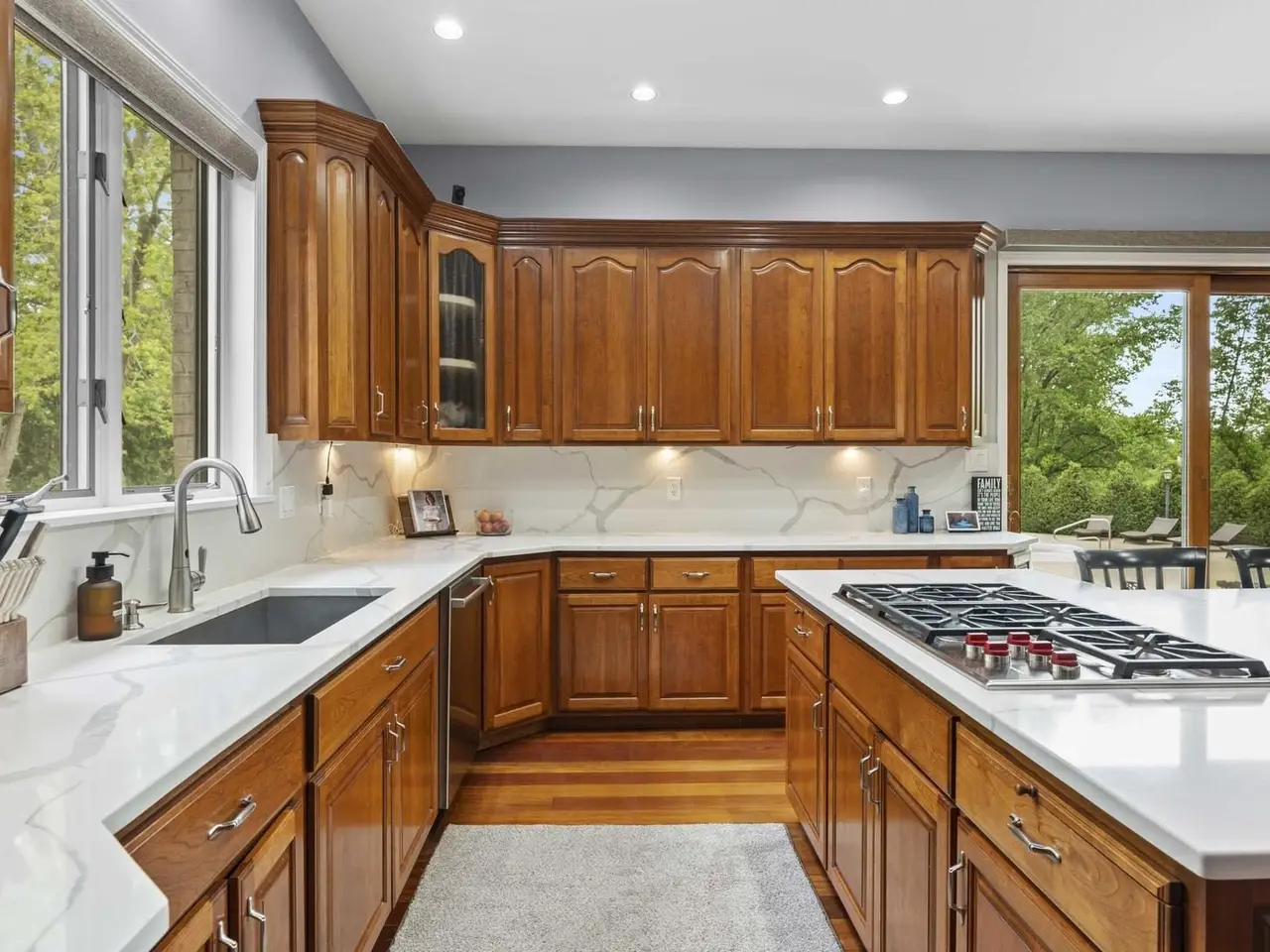 An entertainer's dream comes to life at this Whispering Woods retreat! Set on 1.38 wooded acres, this 4 bed, 4 bath walk-out ranch offers a resort-style lifestyle just minutes from the Illinois border for an easy Chicago commute. The backyard is your private oasis, featuring a heated in-ground pool, professional landscaping, Sonos speakers inside and out, a shed, new fence, and new pool cover-perfect for gatherings or quiet relaxation. Inside, the main level boasts 10' ceilings and cherrywood flooring, a vaulted great room with a dramatic floor-to-ceiling brick fireplace, and a built-in wet bar. The chef's kitchen includes quartz counters, matching backsplash, cherry cabinetry, walk-in pantry, stainless steel appliances, and a Wolf cooktop. A private office with French doors sits just off the entry. The primary suite is a true retreat with heated floors, jetted tub with built-in TV, dual granite vanities, walk-in shower, and oversized walk-in closet. The finished walk-out basement elevates entertaining with a home theater (all media stays), a rec room with tray ceilings and second fireplace, full wet bar with dishwasher and beverage fridge, climate-controlled wine cellar, and a 500-gallon saltwater aquarium. A poker room or potential 4th bedroom with hidden passage and a steam shower bath complete this luxurious space. Additional highlights include a heated 3.5-car garage with epoxy floors, battery backup sump pump, whole-house Generac generator with new battery, in-ground sprinklers, and recent updates to roof, HVAC, and water heater. This is a rare opportunity to own a luxury ranch designed for unforgettable entertaining, resort-style outdoor living, and serene acreage privacy.