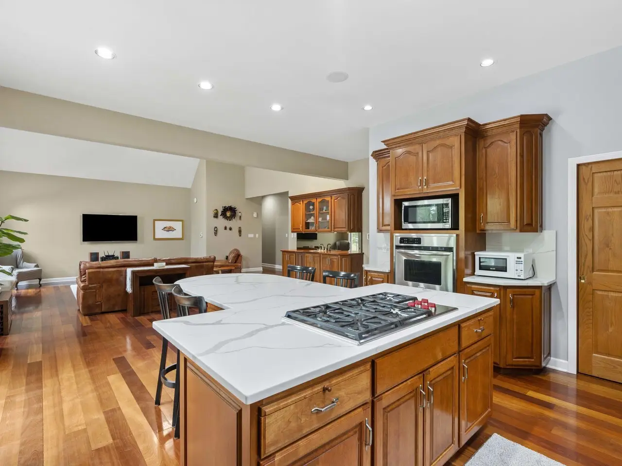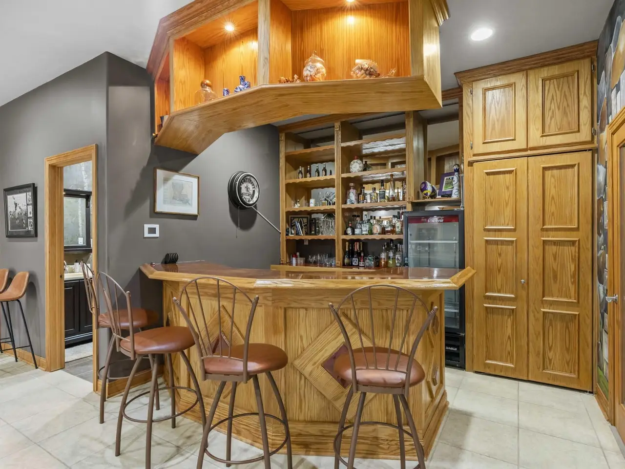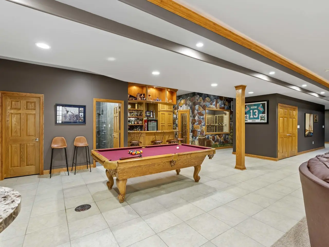 An entertainer's dream comes to life at this Whispering Woods retreat! Set on 1.38 wooded acres, this 4 bed, 4 bath walk-out ranch offers a resort-style lifestyle just minutes from the Illinois border for an easy Chicago commute. The backyard is your private oasis, featuring a heated in-ground pool, professional landscaping, Sonos speakers inside and out, a shed, new fence, and new pool cover-perfect for gatherings or quiet relaxation. Inside, the main level boasts 10' ceilings and cherrywood flooring, a vaulted great room with a dramatic floor-to-ceiling brick fireplace, and a built-in wet bar. The chef's kitchen includes quartz counters, matching backsplash, cherry cabinetry, walk-in pantry, stainless steel appliances, and a Wolf cooktop. A private office with French doors sits just off the entry. The primary suite is a true retreat with heated floors, jetted tub with built-in TV, dual granite vanities, walk-in shower, and oversized walk-in closet. The finished walk-out basement elevates entertaining with a home theater (all media stays), a rec room with tray ceilings and second fireplace, full wet bar with dishwasher and beverage fridge, climate-controlled wine cellar, and a 500-gallon saltwater aquarium. A poker room or potential 4th bedroom with hidden passage and a steam shower bath complete this luxurious space. Additional highlights include a heated 3.5-car garage with epoxy floors, battery backup sump pump, whole-house Generac generator with new battery, in-ground sprinklers, and recent updates to roof, HVAC, and water heater. This is a rare opportunity to own a luxury ranch designed for unforgettable entertaining, resort-style outdoor living, and serene acreage privacy.