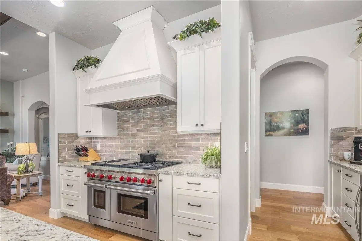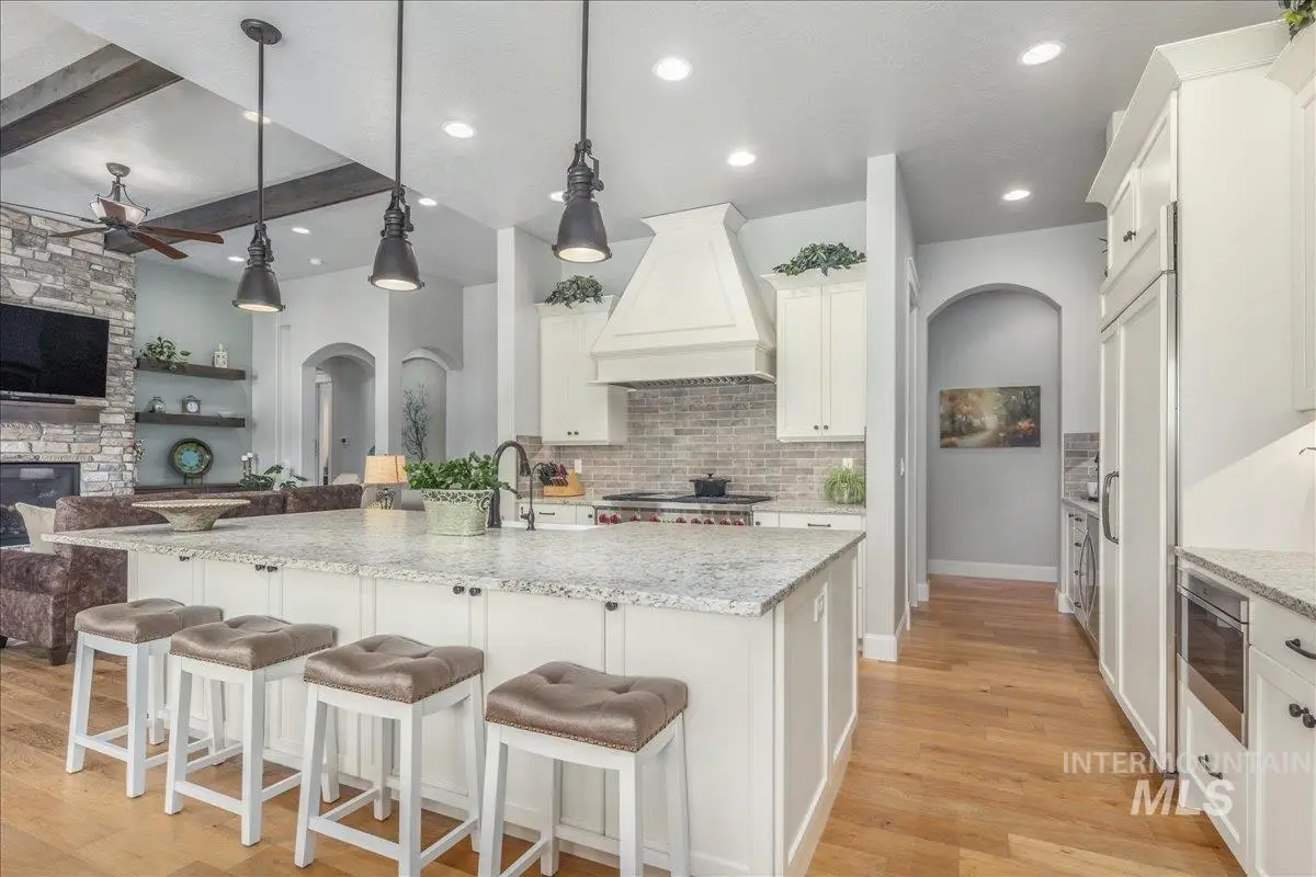 One of Eagle's most prestigious gated communities--Mace River Ranch Estates. Set on a spacious .63-acres, this custom-built single level home offers refined luxury with upgrades and designer touches throughout. Features soaring, 18 ft. ceilings with exposed hand-hewn wood beams and expansive great room, anchored by a stunning floor-to-ceiling stone gas fireplace and gorgeous wide-plank hardwood flooring throughout the main living spaces. The gourmet kitchen is a chef's dream, with top-of-the-line Wolf and Sub-Zero appliances, farmhouse sink, custom cabinetry, and generous storage. Retreat to the lavish primary suite featuring a double-sided gas fireplace shared with the spa-inspired upgraded bath with premium finishes including freestanding tub. Additional highlights include: Four-car garage with epoxy flooring & custom built-ins, outdoor BBQ, and full landscaping with new trees, new shrubs, fresh mulch, edging and existing fully fenced yard. Hunter Douglas electric shades & plantation shutters throughout. Upgraded security system, security lighting & 22kw Generac Generator. Central vac, two hot water heaters with recirculating hot water, reverse osmosis system & water softener. Mace River Ranch community amenities including a 40-acre nature preserve, tranquil water features, clubhouse & pool with direct access to the Boise River Greenbelt!