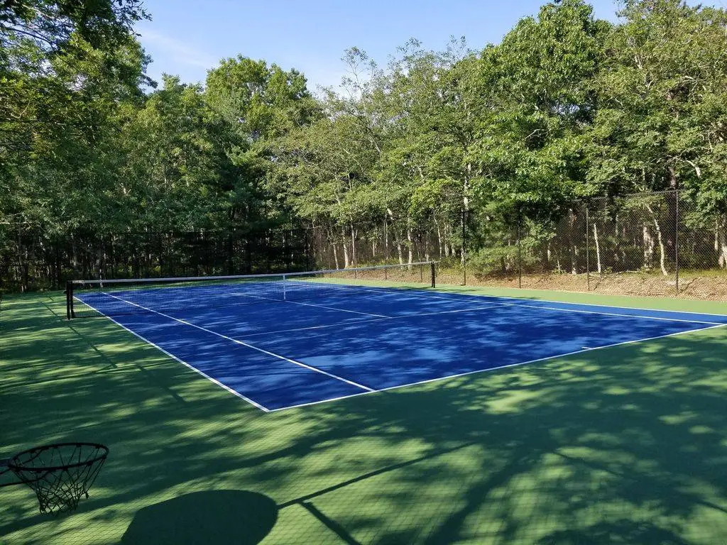 RR#: 21-451. Spacious and light filled home, beautifully furnished offering an open floor plan, great deck and pool area and private tennis court on 2.5 acres! The living room has cathedral ceilings and a fireplace; there is an eat-in kitchen with new stove and refrigerator in 2021 and dining area with a wet bar. The five bedrooms are all large and private. There is a junior master bedroom along with three other bedrooms on the first floor. Upstairs the large master suite encompasses the entire floor along with loft. The finished lower level has a gym with Pelton bike and game room. Plus a new laundry room. A great entertaining house and one you will truly enjoy.
