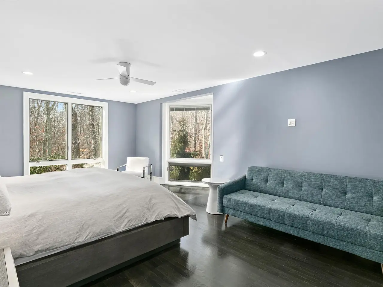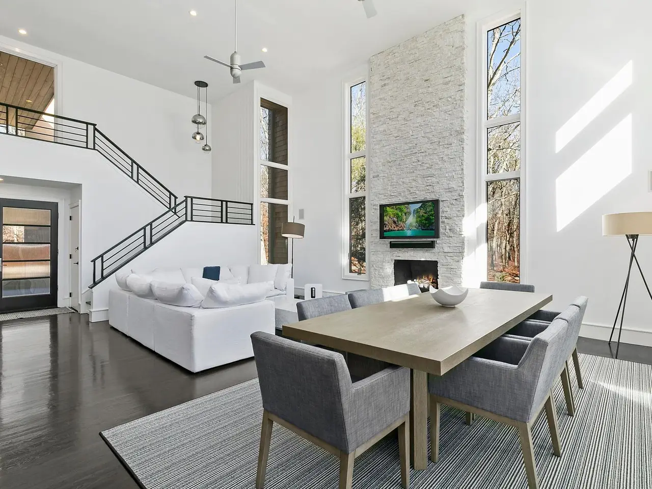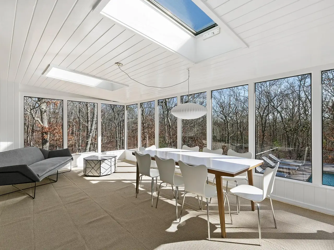 Rental Reg. # 22-54. Renovated in 2017, sublimely modern, but comfortable, this four bedroom, 4.5 bath house has a soaring double-height open living/ dining area leading to a comfy screened porch overlooking the heated pool. First floor primary suite has a gas fireplace and an adjacent sauna. Beautifully appointed and perfect for relaxing no matter what room you're in. A gourmet kitchen completes the picture. Equidistant between East Hampton and Sag Harbor.