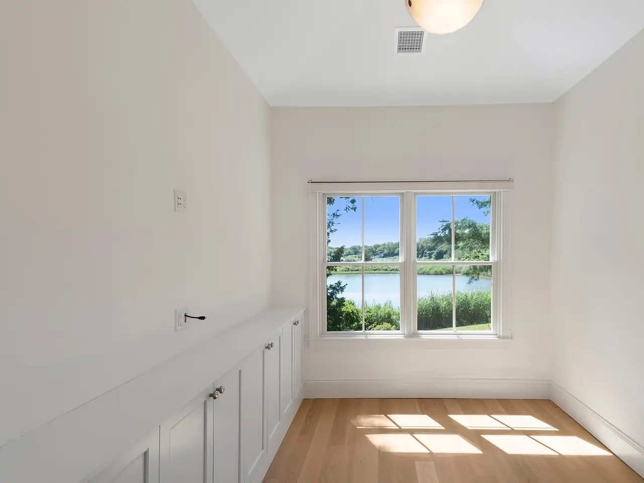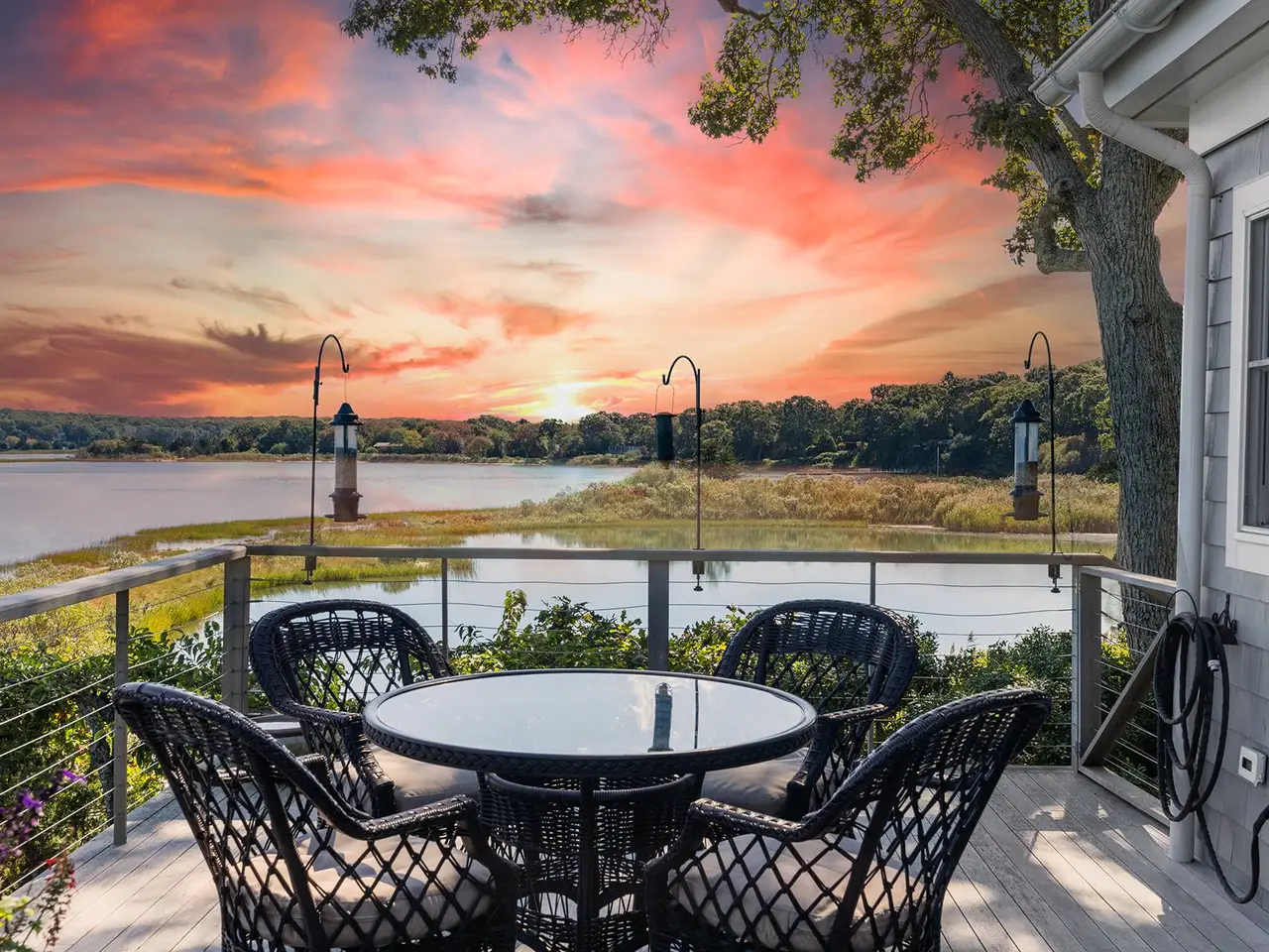 Facing due east for brilliant sunrises with 101' water frontage on Three Mile Harbor, this traditional house was thoroughly renovated in 2022. The upside-down configuration is approximately 3,500 square feet and each floor can operate separate from one another. The main floor has a 23' vaulted ceiling that creates a dramatic space for the living room with fireplace, wet bar with wine refrigerator, dining area and designer kitchen with island, double sinks, dishwashers and generous walk-in pantry. There are 5 bedrooms with 10' tray ceilings and 4.5 baths, two ensuite wings on the main floor, bedroom with private entrance and a separate private office with pocket door. The lower level hosts a living area with kitchenette including sink, dishwasher and refrigerator, two ensuite bedrooms, a miscellaneous room that had been a tackle room with shelving and a large mirror, laundry, massive amounts of storage and double doors leading to the water access. Additional amenities include a Kohler generator, solar panels, electric car charger, county water and a Self-Contained Hydro Action AN600 waste treatment system. The house sits 50 feet from the shoreline and 13 feet above sea level setting up the best 'in your face' pre-existing view of them all. This is the home of the late Hamptons Wellness Foundation creator who was also a life coach and avid sportsman. Beautifully designed, built and sited on 0.54 acre, the house is insulated from traffic noise because of the cul-de-sac location.