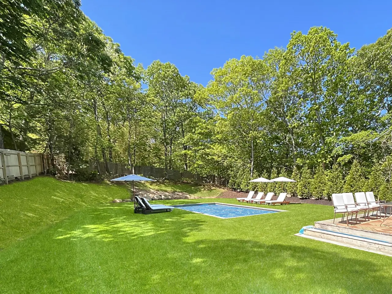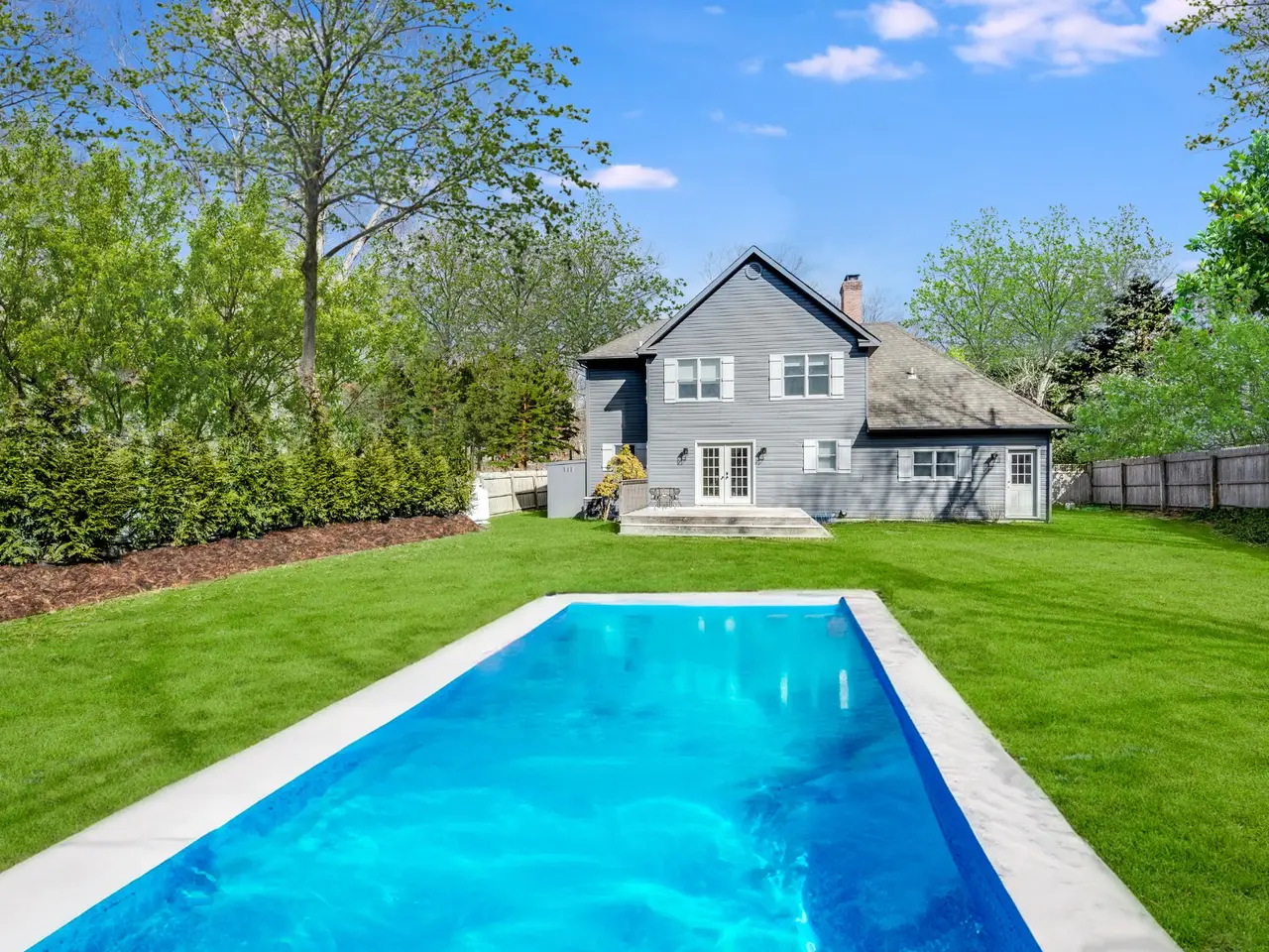 Heated pool surrounded by lush lawn