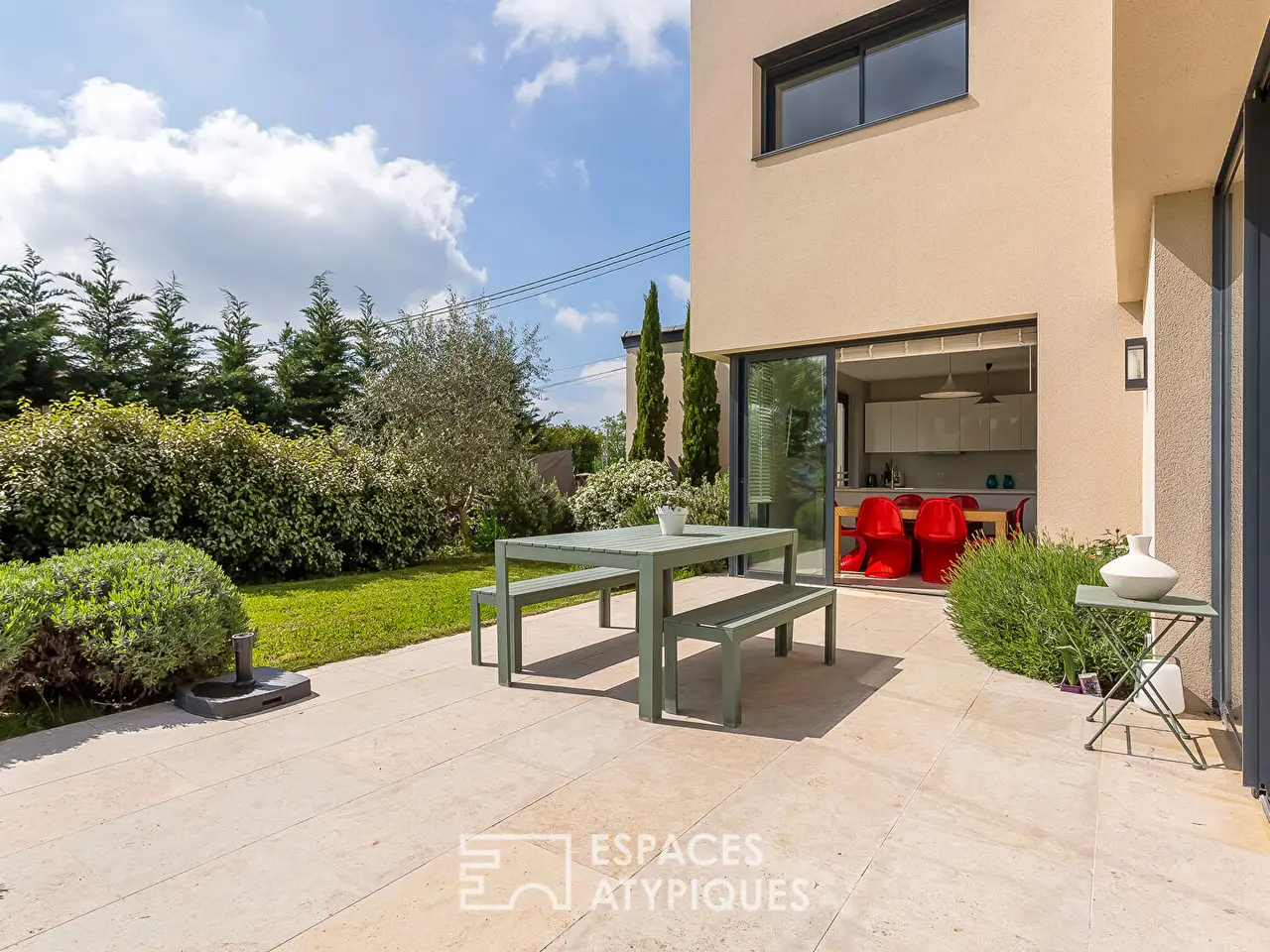 Nestled in a quiet and sought-after residential area, this 145 m² contemporary house, built in 2016, sits on a carefully landscaped 580 m² plot, featuring a 3x7 swimming pool and outdoor spaces designed for relaxation. From the entrance, the spaciousness and brightness capture the eye: the 66 m² living area unfolds in an open space around a fully equipped kitchen, enhanced by a corner bay window that blurs the lines between indoors and outdoors. The south-facing terrace and swimming pool provide an ideal setting for entertaining or relaxing, sheltered from view. The upper floor houses four bedrooms, including a master suite with a private shower room and custom-made dressing room. A separate bathroom completes this level. Thermal comfort is ensured by underfloor heating powered by a heat pump, guaranteeing optimal energy efficiency. The 45 m² (480 sq ft) insulated and already connected garage offers the possibility of creating a separate studio—a rare opportunity in this area where proximity to schools generates strong rental demand. A property with high-quality features, in a dynamic, family-friendly neighborhood, combining modernity, comfort, and growth potential. ENERGY CLASS: B / CLIMATE CLASS: A Estimated average annual energy costs for standard use, based on 2021 energy prices: between €690 and €970 Contact: Amandine: +33 6 50 86 46 08 REF. 10789 Additional information * 5 rooms * 4 bedrooms * 2 bathrooms * Outdoor space: 580 SQM * Property tax: €1,700 Energy Performance Certificate EPC: 73 kWhEP/m2.year