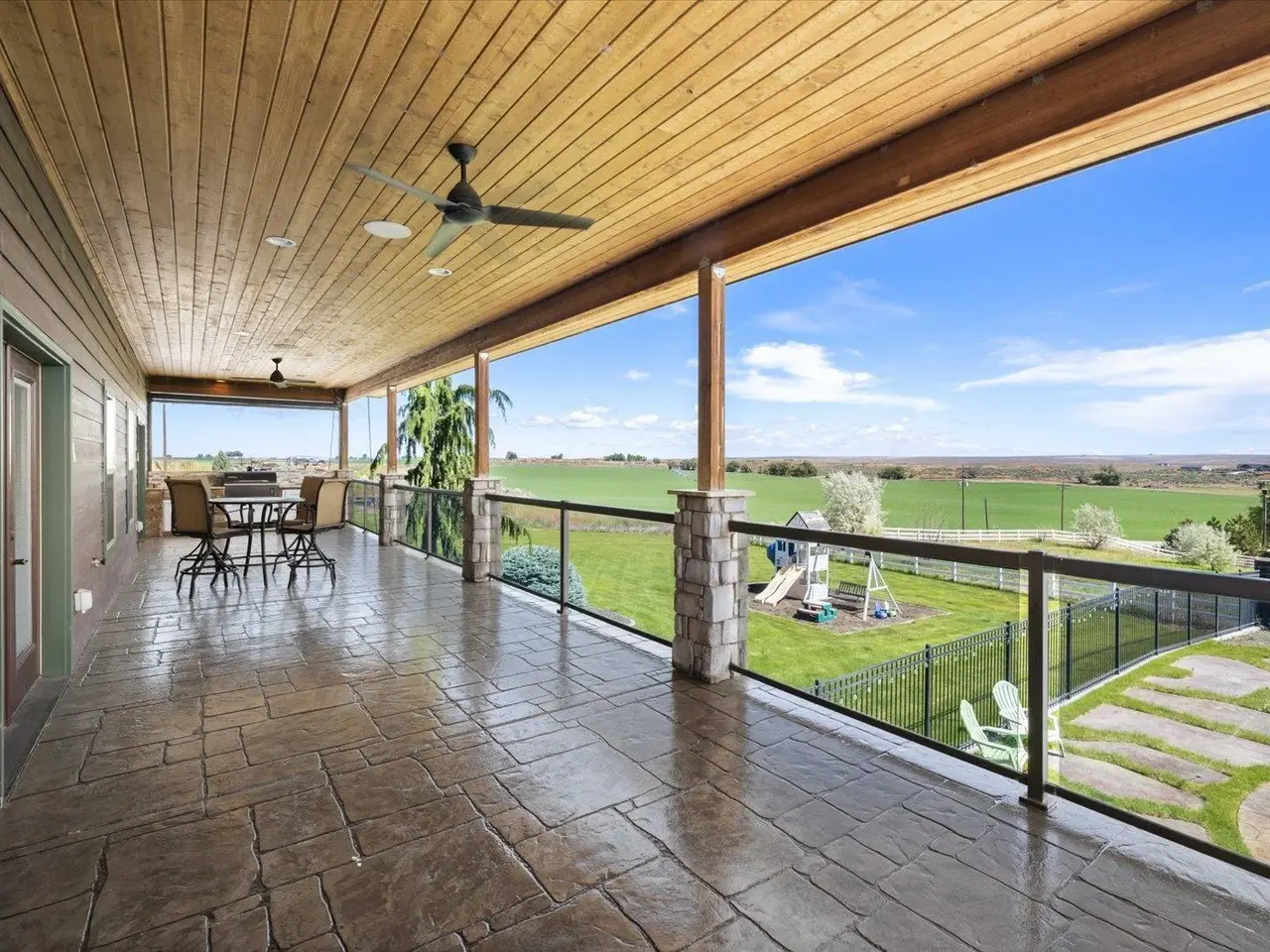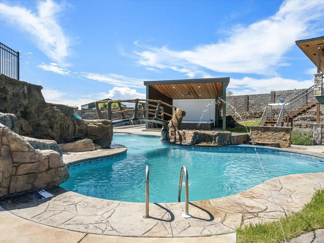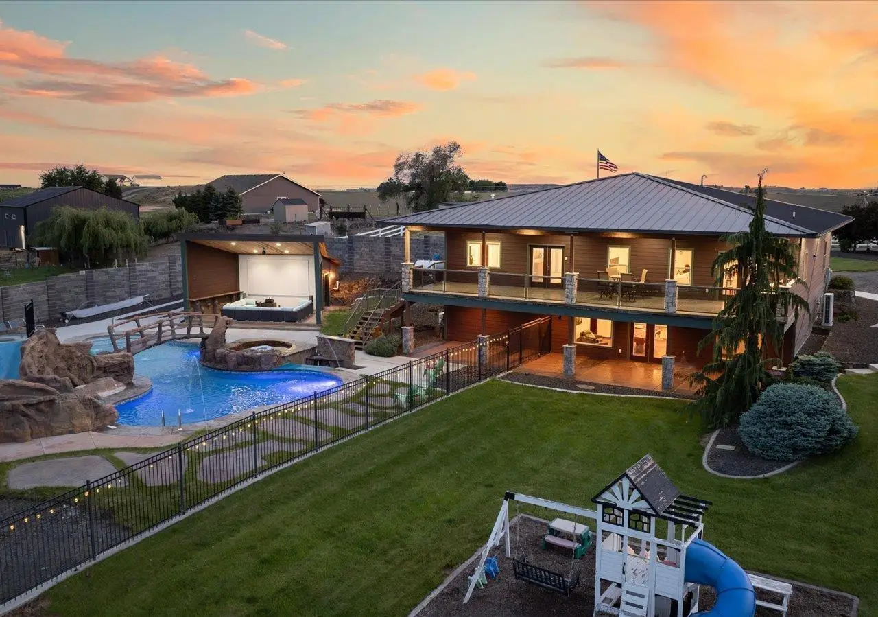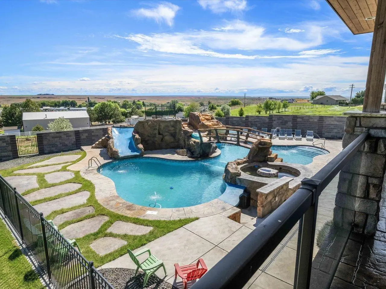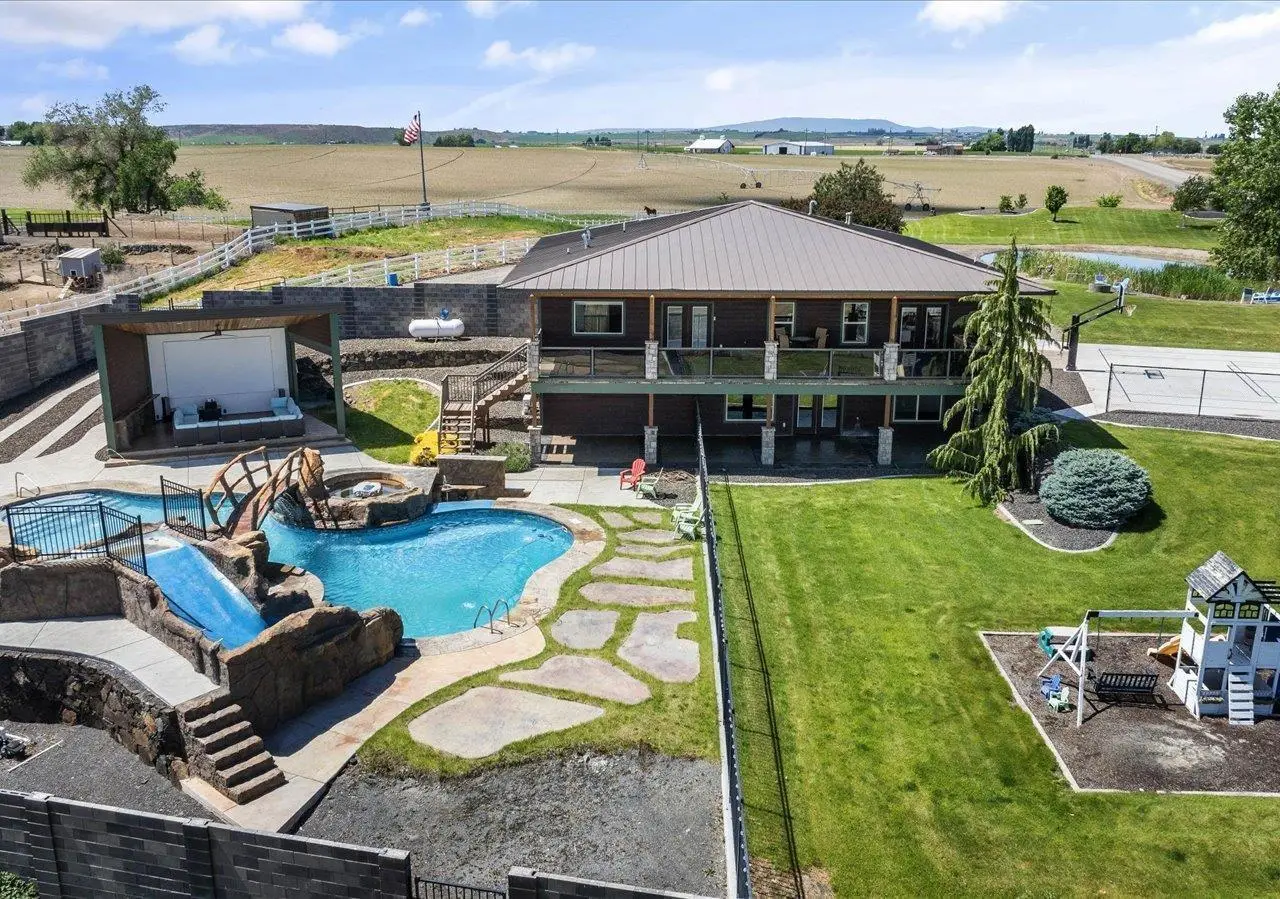 Presenting this exclusive premier listing – Discover unparalleled privacy and resort-style living just 12 minutes north of Pasco, Washington. Nestled on 4.34 acres, this extraordinary 4-bedroom, 5-bath estate offers 3,356 sq ft of luxury and functionality, thoughtfully designed for upscale entertaining and everyday comfort. The open-concept kitchen and living area exude modern elegance with an oversized granite island, brand new built-in fridge/freezer, large pantry, Venetian plaster ceiling, custom millwork, and ambient LED up-lighting. The main level features a versatile bedroom or office, full bath, and spacious laundry/mudroom with oversized sink. The massive primary suite is a private retreat with French doors opening to the outdoor oasis and covered patio, a large walk-in closet, and a spa-like en-suite with self-heated two-person Jacuzzi tub, dual showerheads with rain feature, dual vanities, heated towel rack, and smart TV. The daylight basement continues the luxury experience with stamped and stained wood-look concrete floors, two additional bedrooms (one with walk-in closet), full bath, game room with pool table, and a custom wet bar with sink and luxury cabinetry. The professionally designed theater room includes a half bath, no-touch urinal, climate control, and 8” steel-reinforced safe room. Outdoor living is truly unmatched, featuring a 43,000-gallon lagoon-style pool with swim-up bar, grotto rock waterfall, waterslide, two white sand beaches, bridge, 20+ person hot tub with waterfalls, and a gas fire pit. Additional highlights include a miniature lake with sand beach and firepit, an outdoor amphitheater with 200”+ drop-down screen and built-in bar, and an outdoor bathroom with shower for pool guests. The upper stamped concrete deck offers panoramic territorial views of the Basin and Blue Mountains and includes a custom built-in Traeger grill, outdoor kitchen, sink, and refrigerator. The lower covered patio features outdoor speakers and more stamped concrete for seamless entertainment. A newly added sport court with pickleball and a fully fenced, irrigated pasture for horses or livestock make this property both luxurious and functional. With a private drive, low-maintenance pre-stained concrete siding, standing seam metal roof, and proximity to schools, highway access, and Country Mercantile nearby, this one-of-a-kind estate is a rare opportunity in the Tri-Cities.