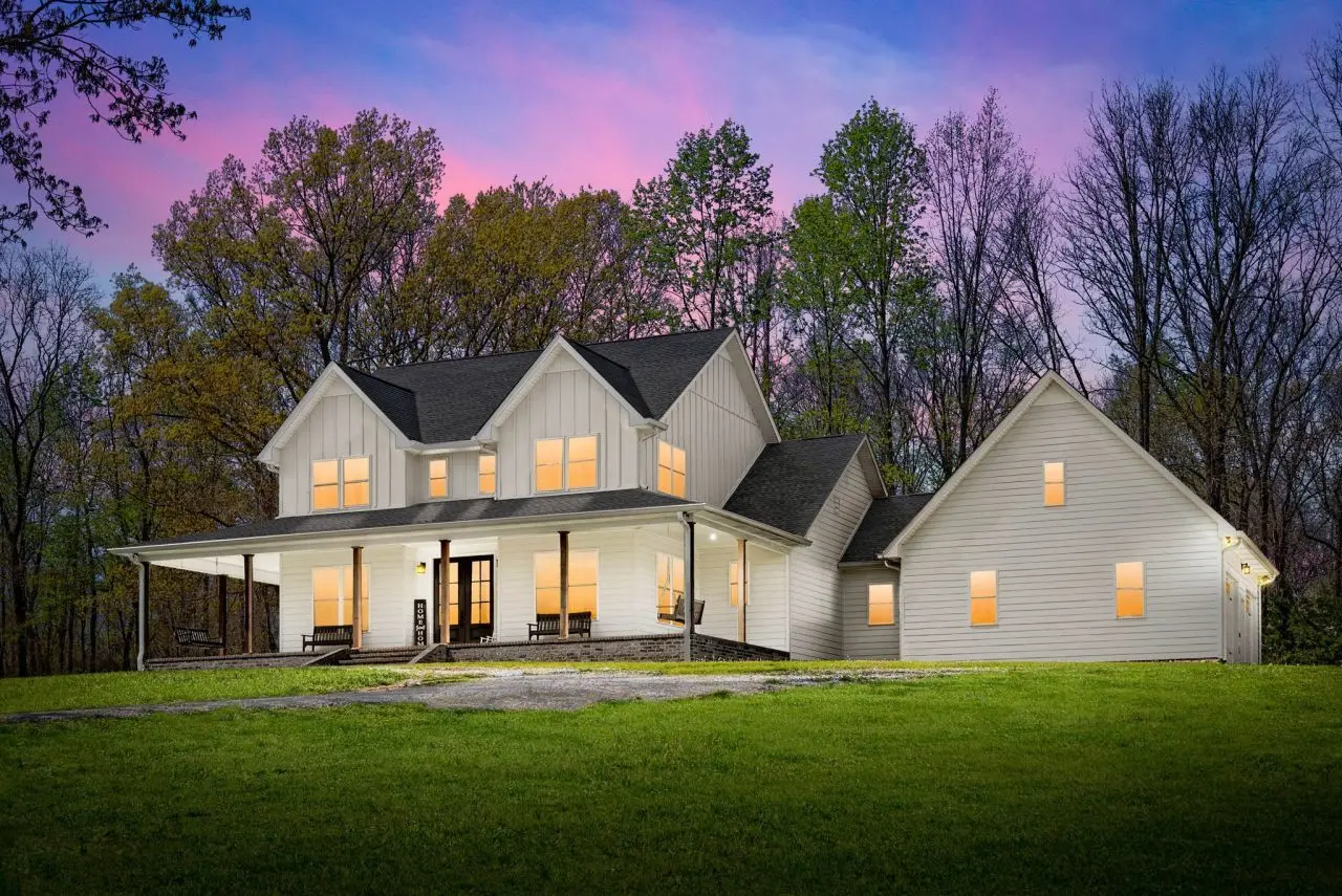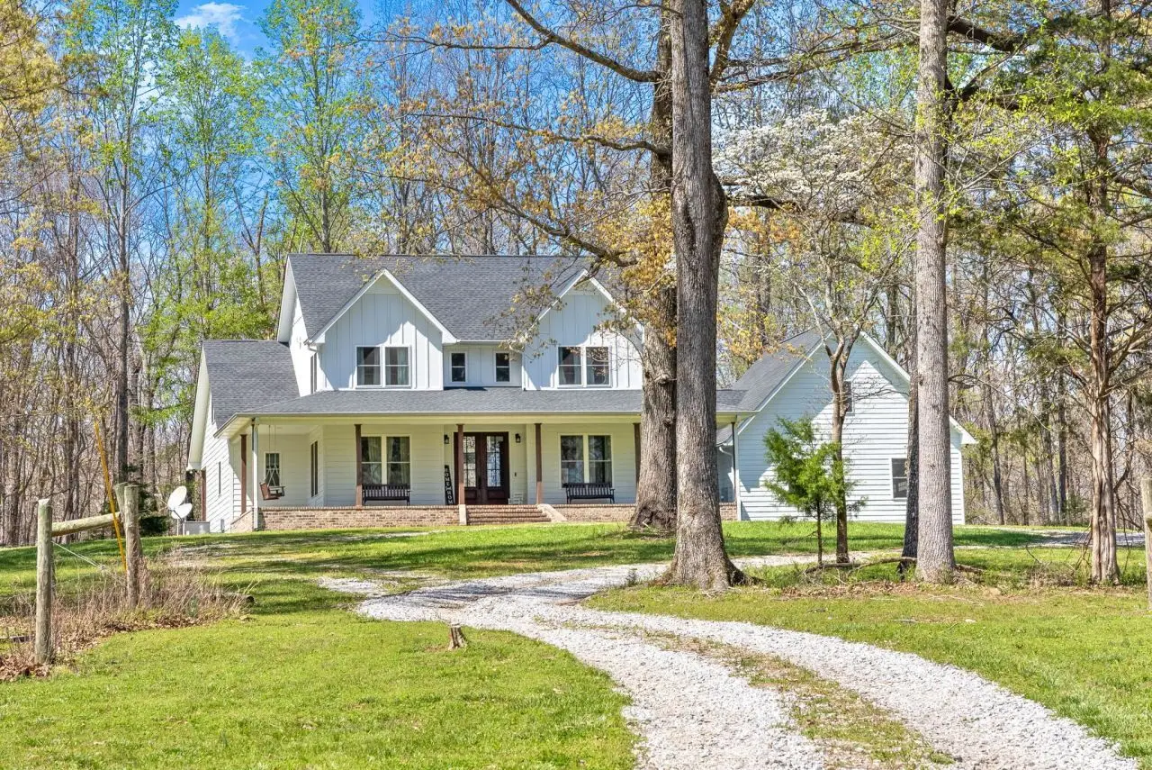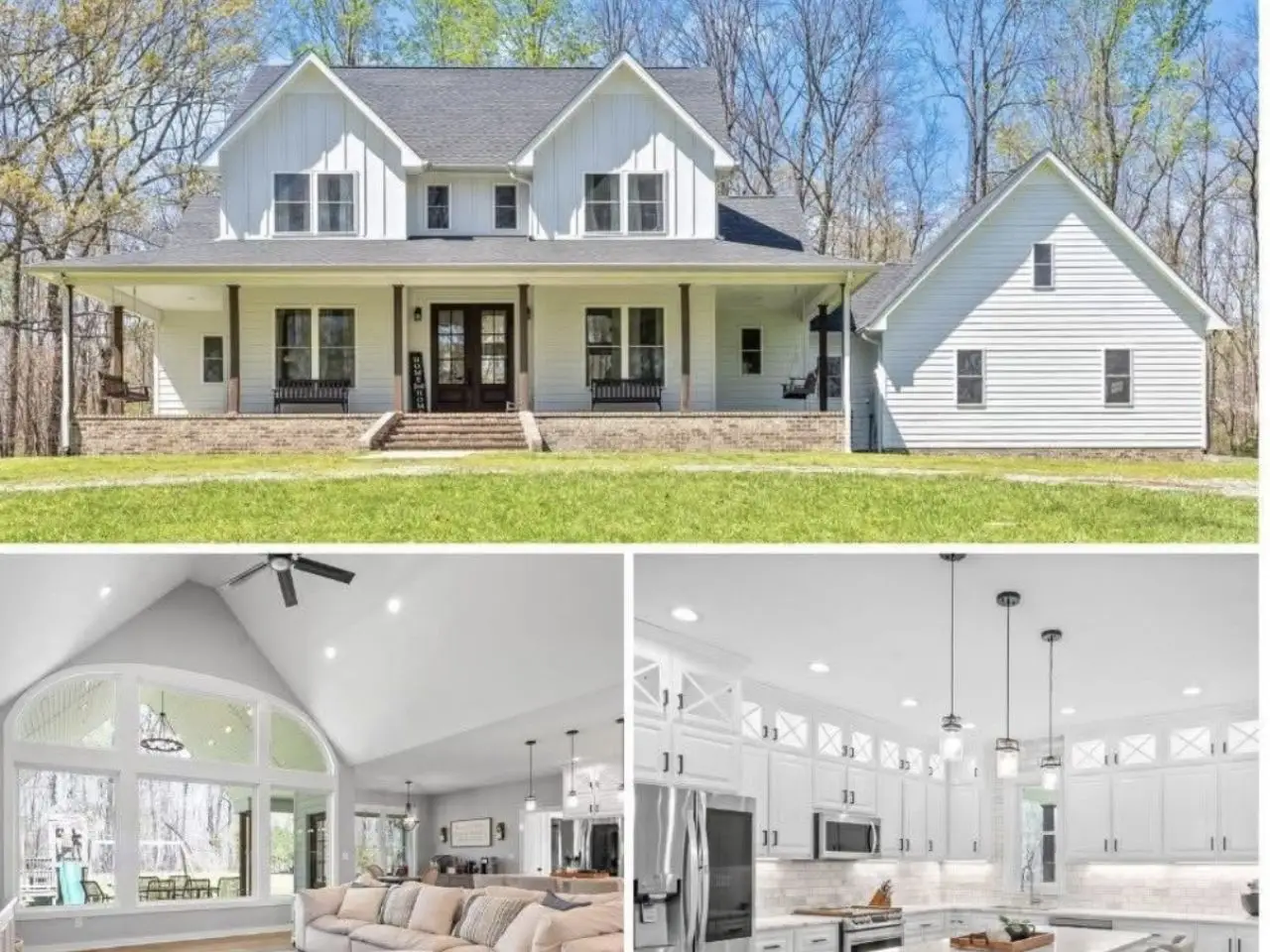 Welcome to your dream modern farmhouse, an exquisite three-story retreat nestled on a sprawling four-acre estate. This stunning home features cathedral ceilings and wide plank wood flooring throughout, creating a warm and inviting ambiance. The heart of the home is the expansive kitchen, boasting luxurious marble countertops and a cozy breakfast nook, perfect for morning gatherings. Adjacent is a formal dining room, ideal for entertaining guests. With four spacious bedrooms, including a master suite with elegant finishes, and three and a half beautifully designed baths, comfort is paramount. This home also includes two versatile bonus rooms, perfect for a home office or play area. Step outside to your large covered back porch, featuring impressive cathedral ceilings, an outdoor half bath, all perfect for relaxing or entertaining while enjoying the picturesque surroundings. An attached heated & cooled two-car garage adds convenience to this exceptional property. Immerse yourself in modern luxury and country charm in this remarkable farmhouse!