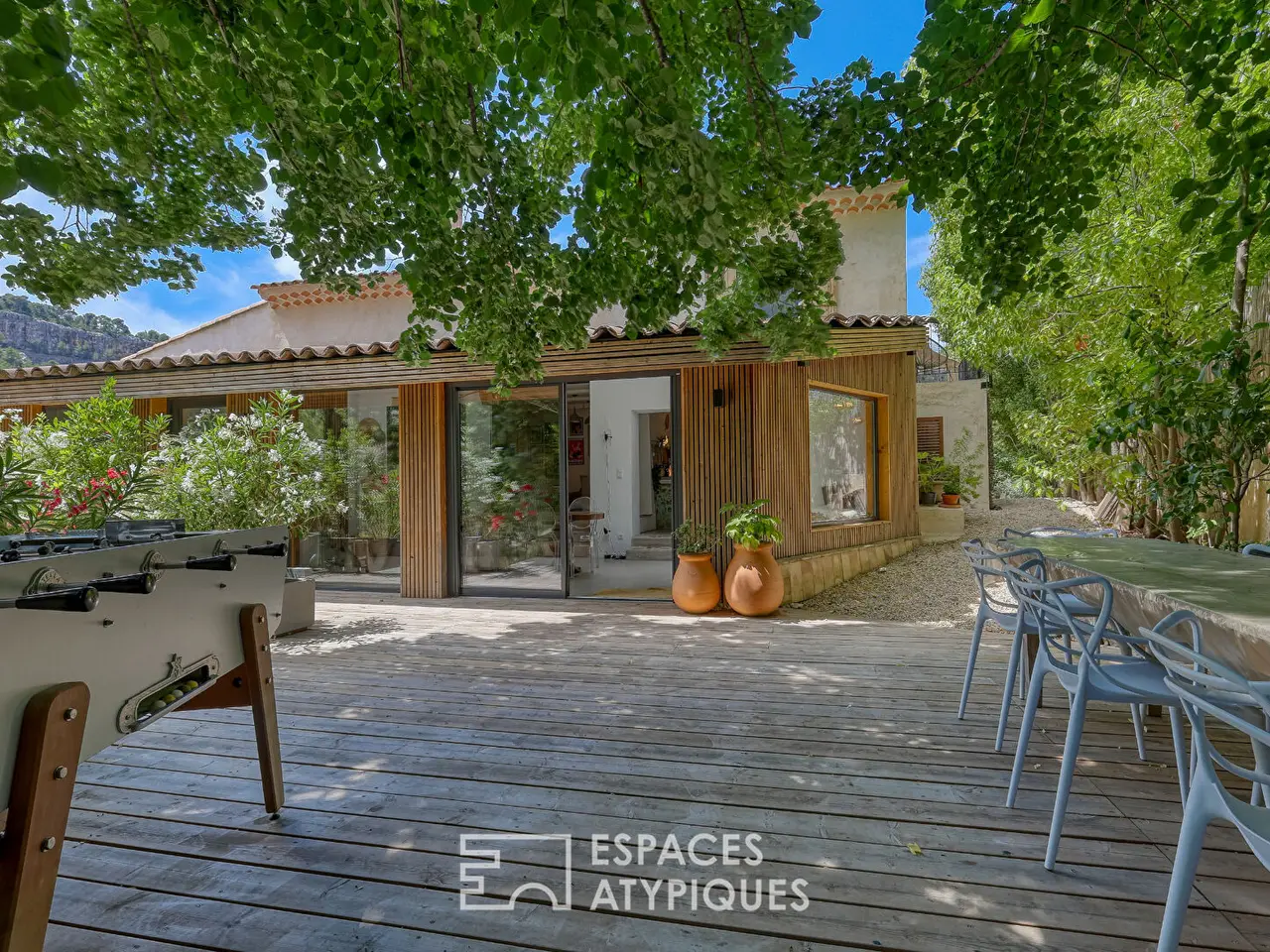 In Evenos, a charming village 15 minutes from Toulon and the coast, this property consists of two homes combining the authentic charm of the old and the contemporary. At the end of a path, hidden by vegetation, this charming property is revealed. Past the gate, a few steps lead to a large terrace with summer kitchen where a century-old lime tree provides shade. On this level is the entrance to the main house, a bright living room and a large cozy living room with fireplace, polished concrete, wood and stone give this space an authentic and modern charm. Following this, a fitted kitchen invites conviviality around its island. A master suite with access to a shaded terrace, a bathroom and another suite with dressing room complete this level. The first floor has a bedroom with dressing room and a games or rest area. A small path leads to a terrace below where we find the relaxation area with swimming pool and a single storey guest house offering a bright living room with kitchen, two bedrooms and a bathroom. Beyond the charming habitat, the green and calm environment of this property is conducive to a peaceful life. Reversible air conditioning, parking and water via the Canal de Provence. Toulon tgv station 20 minutes ENERGY CLASS: B 101/ CLIMATE CLASS: A 3 Estimated annual energy cost for standard use (DPE carried out after January 1, 2024) between 860 and 1210 euros Additional information * 9 rooms * 5 bedrooms * 1 bathroom * 2 shower rooms * 1 floor in the building * Outdoor space : 1200 SQM * Parking : 4 parking spaces * Property tax : 900 € Energy Performance Certificate Primary energy consumption b : 101 kWh/m2.year High performance housing