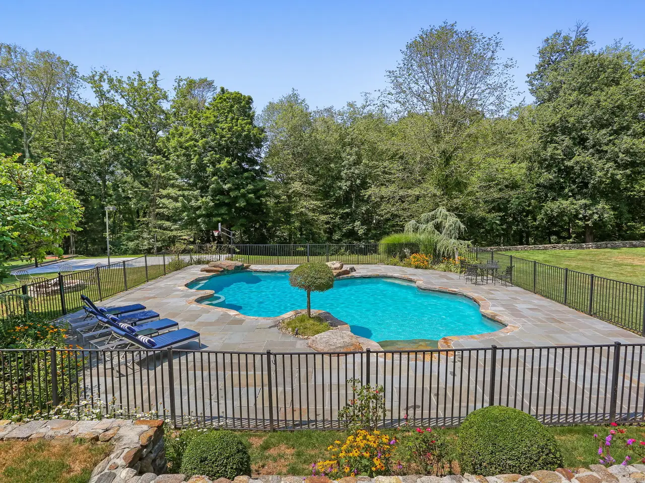 Welcome to 545 Shrub Oak Lane, an expanded Colonial on 2 private acres in Greenfield Hill. This home sits on a beautifully flat front yard that enhances its curb appeal. Fully renovated in 2012, the family room and oversized kitchen is the heart of the home. The custom designed kitchen has an 10 foot mahogany island with granite countertops, walk-in panty, and mahogany wood framed glass doors that create a seamlessly indoor-outdoor experience. The first level offers a formal living and dining room, an office and an expanded mudroom. Upstairs, the primary suite includes french doors to a private deck, a steam shower, a jacuzzi tub, walk-in closet, and a separate sitting room. Four additional bedrooms, two baths, and laundry room complete the upper level. The lower level offers a rec room, extra laundry, an office and ample storage. The oversized three-car garage with unfinished bonus space above is ideal for a in-law suite or future expansion. Outside is an entertainer's paradise, a custom designed lagoon-style pool with diving rocks, multiple bluestone patios, an elevated covered patio, two mahogany decks and an incredible recreational setup, including a full-size lighted basketball court, a turf area for bocce ball/batting cage, fire pit and more!