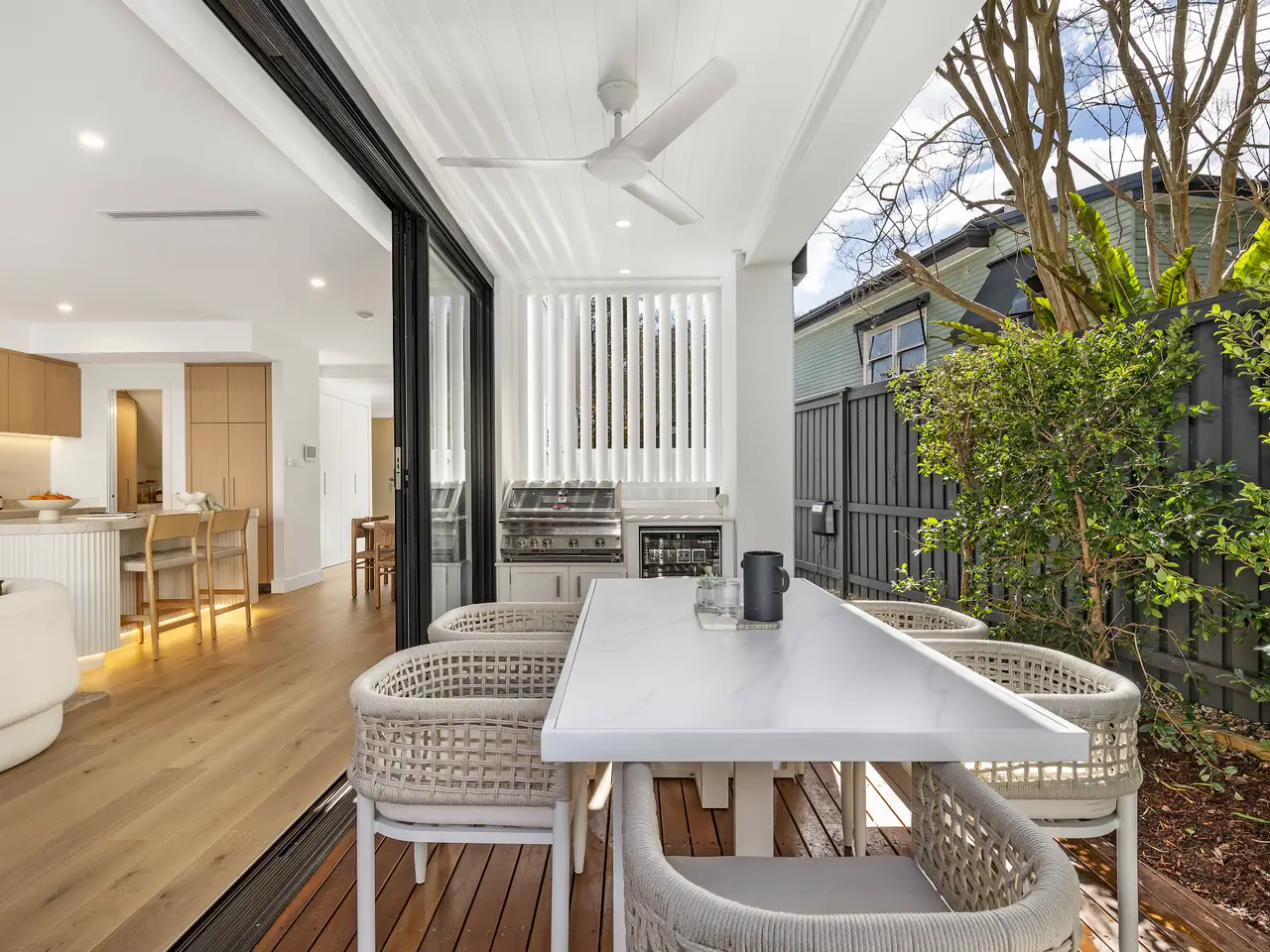 Stacked glass sliders leading to stone bar and barbecue