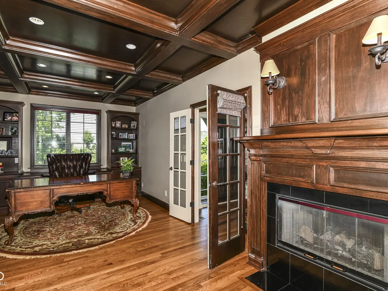 Rich home office with fireplace