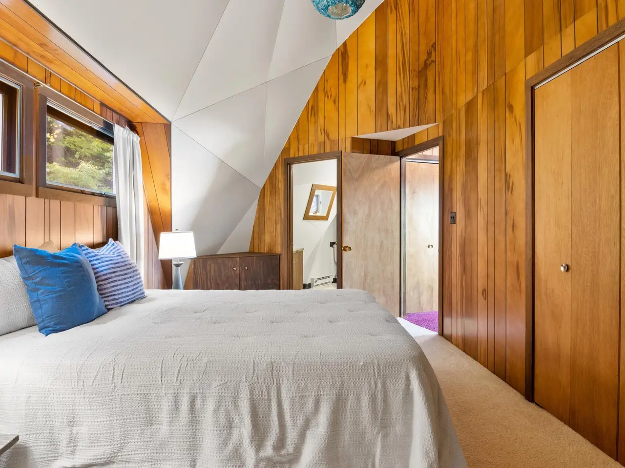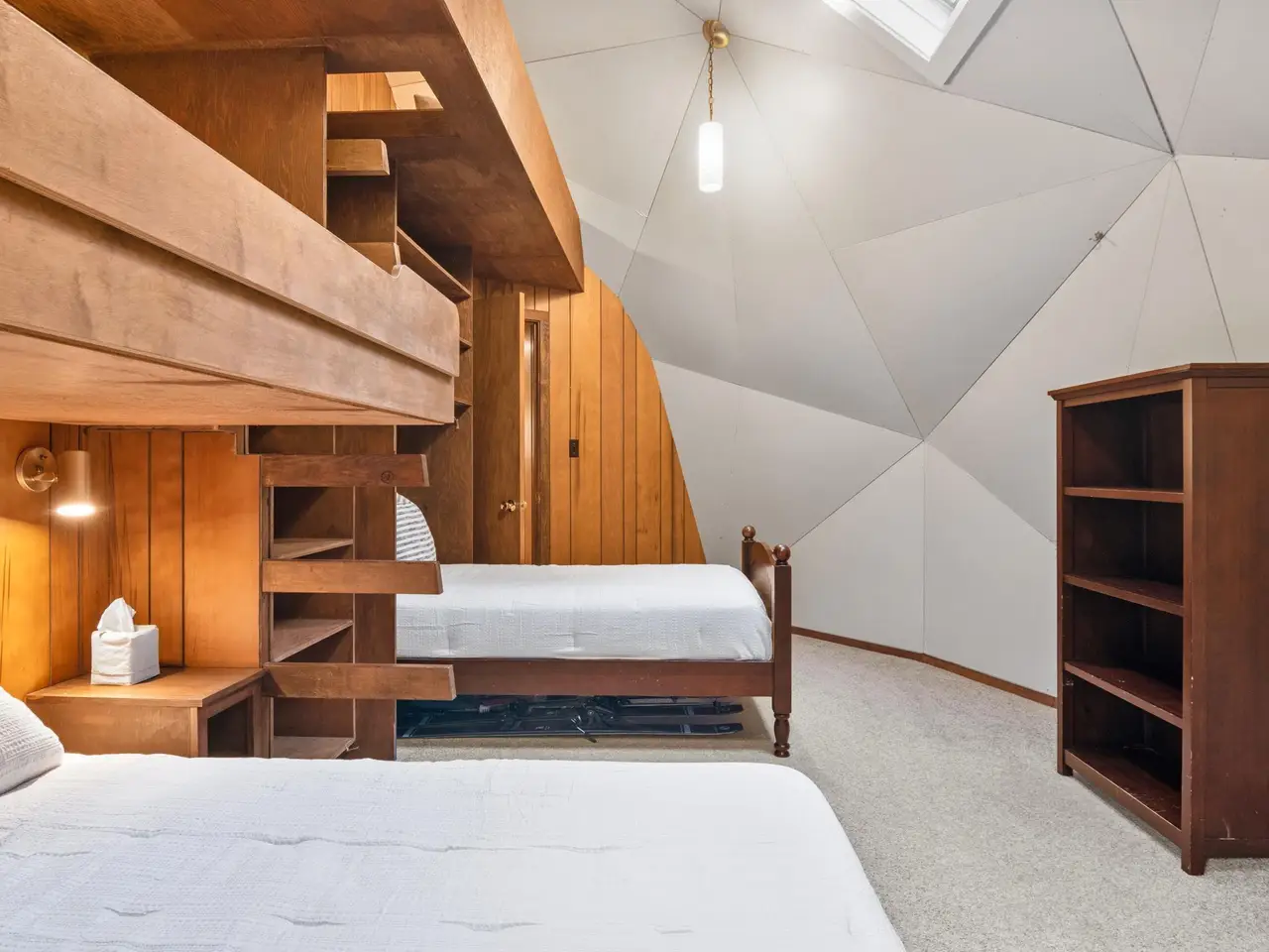 Enjoy private frontage along the south shore of Crystal Lake in this contemporary, geodesic dome home. The open kitchen & dining area flow into a cozy sunken living space with a fireplace, perfect for entertaining or peaceful mornings by the fire. Main floor primary en-suite & two bunk-style bedrooms offering great space for family or guests. The upper-level open loft provides flexibility for a guest room, office, or studio. Step outside to a spacious deck ideal for tranquil mornings, sunset dinners, views of rainbows & the Northern Lights. Detached dome garage offers ample storage for lake gear, boat, or vehicles.
