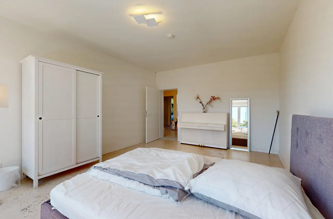 This light-flooded three-room apartment is located on the 5th floor of a well-kept apartment building and is easily accessible by elevator. The picturesque Palmengarten, Grüneburgpark and Frankfurt's lively city center are just a few minutes' walk away. The sought-after location in Westend boasts an excellent infrastructure with numerous shopping facilities, cozy restaurants, excellent public transport connections and green retreats in the immediate vicinity. The apartment has two well-designed bedrooms and a spacious living/dining area with an open-plan layout that invites you to linger. From here, you have direct access to the sunny loggia, which offers a magnificent view of the Frankfurt skyline. Large window fronts in all rooms create a bright, friendly living atmosphere and underline the pleasant feeling of space. Another highlight is the lovingly landscaped communal garden, which is available to all residents and invites them to relax in the greenery. Six parking spaces are jointly owned by the apartment owners. This apartment has the right to use one parking space.