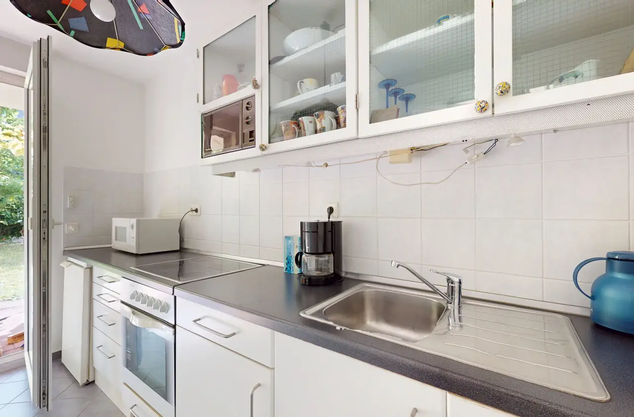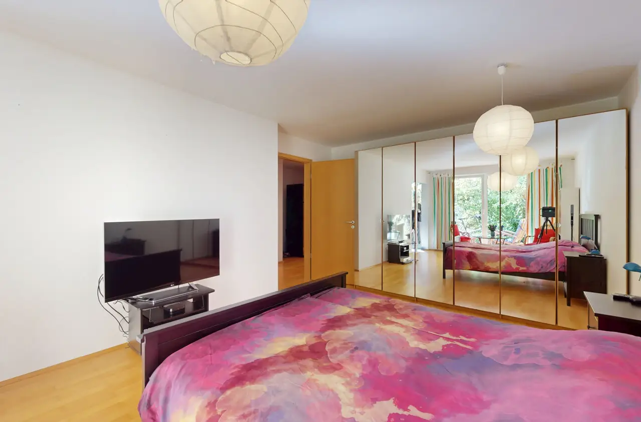 This special property combines the advantages of a barrier-free first floor apartment with the feeling of living in your own home. It is located in a well-kept, family-friendly ensemble of apartment buildings with a park-like common area and playgrounds and impresses with its unique combination of spaciousness, tranquillity and excellent infrastructure. The centerpiece is the approximately 325 m² garden, which offers exclusive special usage rights. It is beautifully ingrown, has fruit trees, a small pond and shady areas. The spacious, south-facing, covered terrace invites you to linger and offers a pleasant ambience at any time of day. There are five rooms, two bathrooms and a guest WC in a living space of around 154 m². Large, mostly floor-to-ceiling windows ensure that the rooms are flooded with light. The windows are double-glazed and fitted with electric shutters. Thanks to the barrier-free layout, the apartment is suitable for families as well as couples or senior citizens who value comfort and freedom of movement. The property was originally planned as two separate apartments that were merged. It consists of a three-bedroom apartment with approx. 87.22 m² and a two-bedroom apartment with approx. 66.78 m², which can easily be separated again. For this reason, there are currently two kitchens available - a practical solution for families or for individual redesign. Overall, the apartment is in a very well-kept condition, although selective modernization is advisable. The underfloor heating, which is operated by a modern heat pump, is a particular plus. It was only installed in 2023 and ensures a pleasant indoor climate. The building, which was constructed in 2003, is equipped with an elevator, making it easy to access the two spacious cellar compartments in the basement. An underground parking space is currently rented in the immediate vicinity of the building and can be taken over. The location near Dornbusch impresses with its excellent infrastructure: shopping facilities, schools, daycare centers and public transport connections are in the immediate vicinity and make the location particularly attractive. This garden apartment is truly unique, as it combines the advantages of urban living with the tranquillity and spaciousness of a private garden.