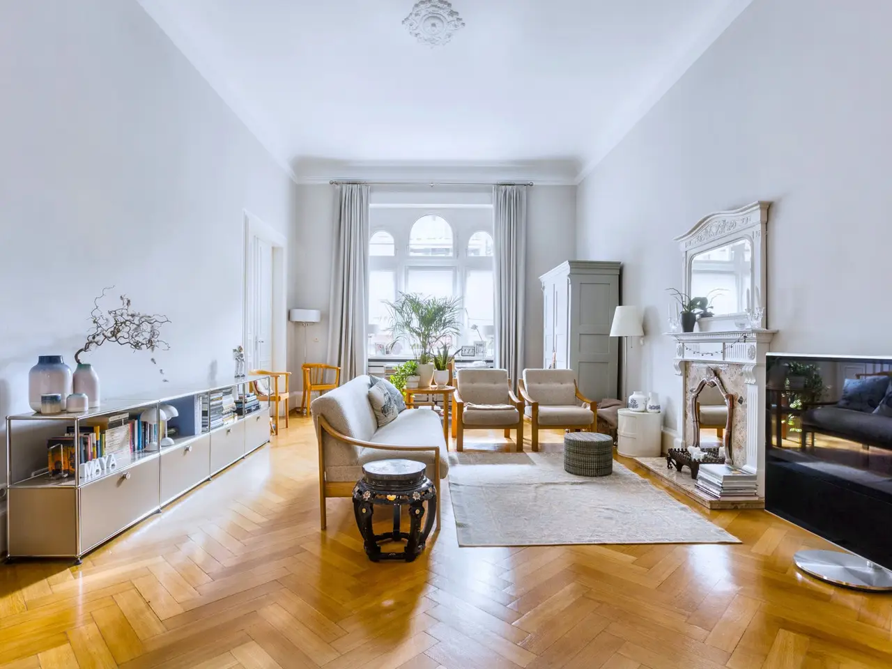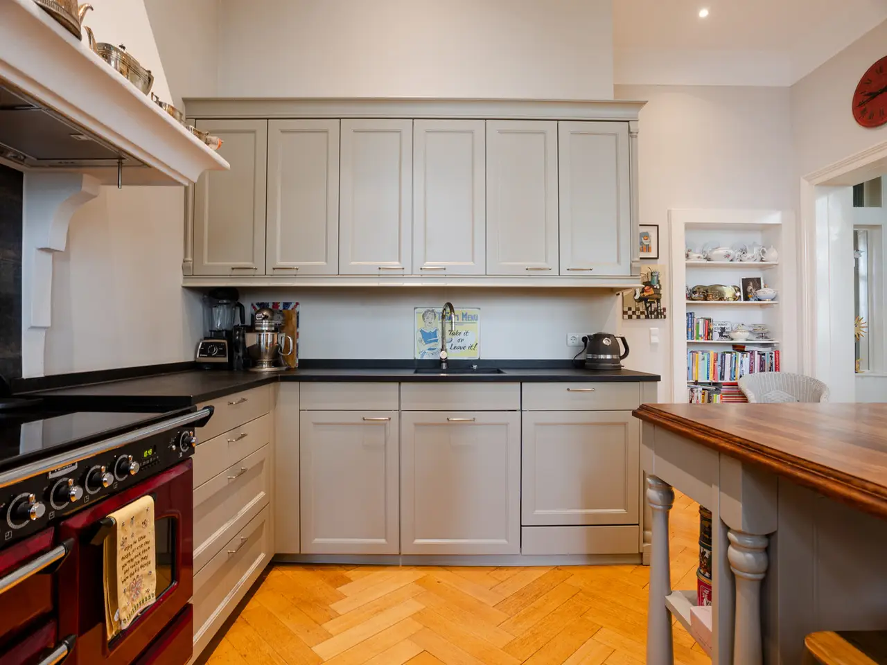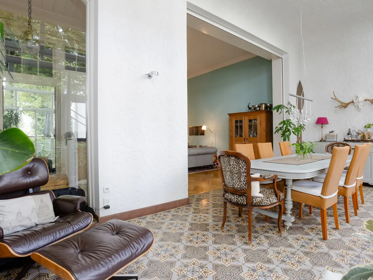 This unique period apartment with an idyllic garden is located on the mezzanine floor of a prestigious 4-family house built in 1900. The stately apartment impresses with approximately 4 meter high ceilings and original style elements typical of the construction period around 1900, such as majestic double doors and a sliding door, artfully decorated door frames, herringbone parquet flooring and high window elements in the style of the original year of construction. The stylish domicile is accessible via a private entrance and, with its two floors and garden, conveys the feeling of living in a townhouse. The spacious entrance hall on the mezzanine floor, with its elegant historical character, is suitable as a prestigious reception room with flair. As was customary in the Wilhelminian style, the three stately rooms are connected by double doors or the imposing sliding door. The dining area is housed in the fully glazed, very decorative conservatory, which is also around 4 meters high and faces directly onto the garden. The impressive, very stylish rooms are flooded with light from morning to night and offer beautiful views. The dining room leads onto the terrace and down a few steps into the idyllic garden with its English character. The large eat-in kitchen is equipped with a custom-made luxury kitchen in a historically authentic style and, in addition to modern appliances, offers a free-standing Falcon De Luxe range stove with multifunction oven and much more to match the flair of the kitchen. The bathroom on the mezzanine floor is also furnished in the Wilhelminian style. All bathrooms have underfloor heating. On the lower level of the maisonette-style apartment is a spacious, bright bedroom with high ceilings and a modern daylight bathroom. This area has a separate entrance via the general staircase. This exceptionally beautiful apartment delights with its incomparable charm and harmoniously designed, luxurious interior. The romantic garden complements the historic ambience. Part of the garden can be cut back to make use of the two parking spaces.