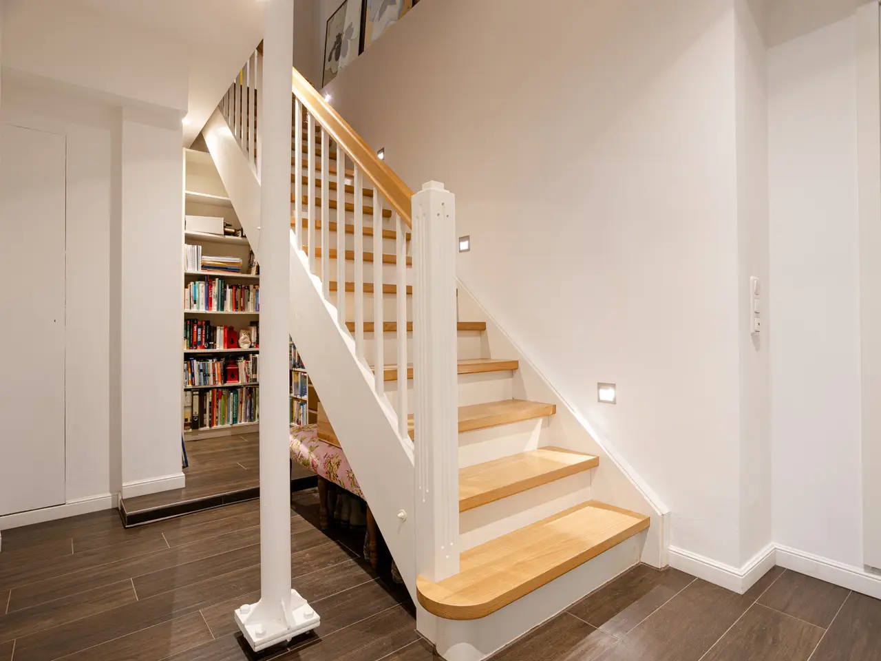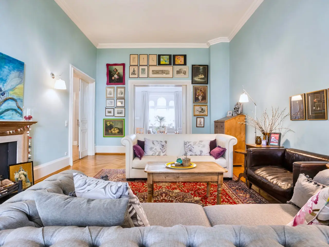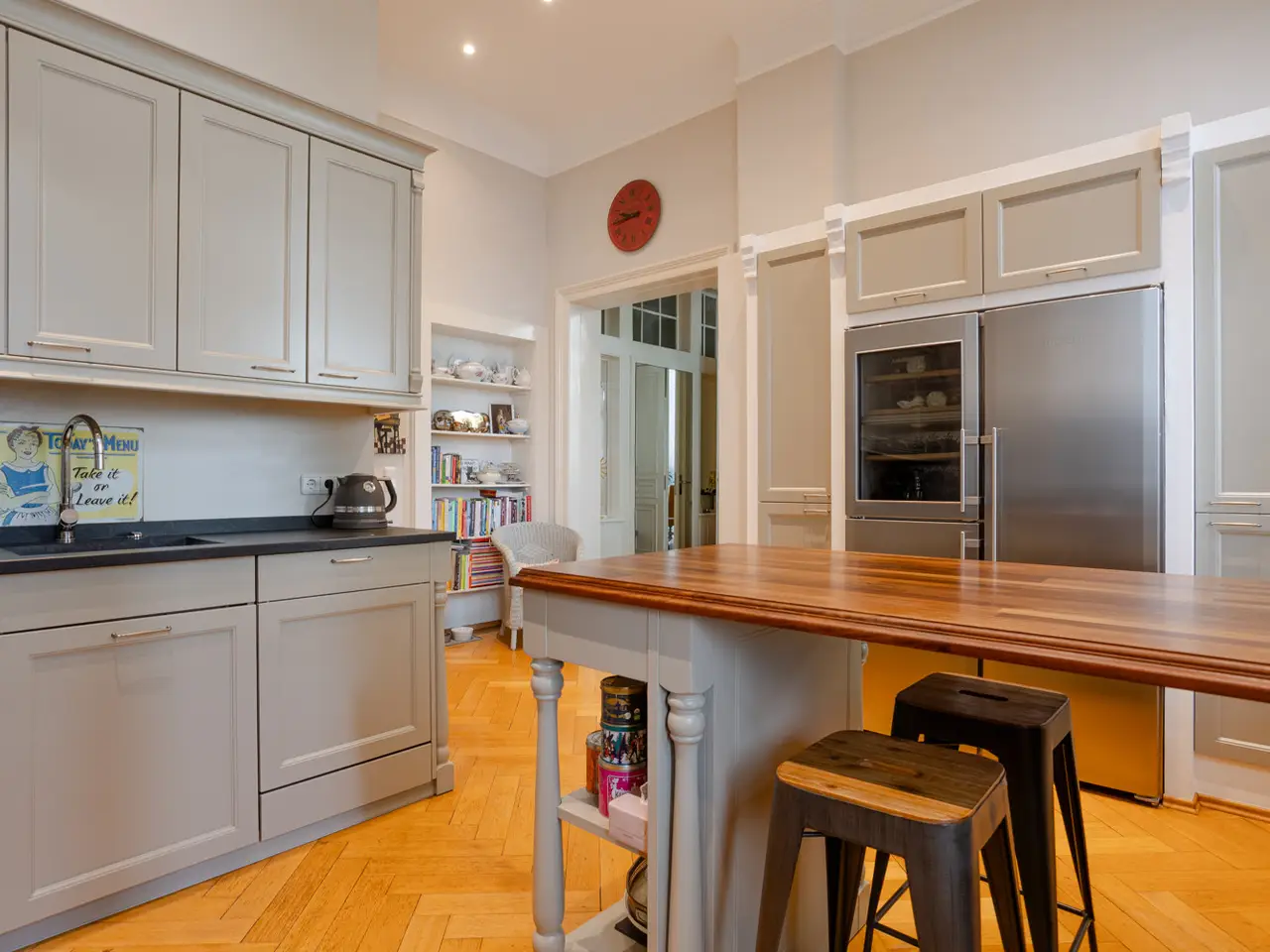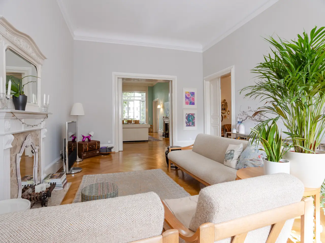 This unique period apartment with an idyllic garden is located on the mezzanine floor of a prestigious 4-family house built in 1900. The stately apartment impresses with approximately 4 meter high ceilings and original style elements typical of the construction period around 1900, such as majestic double doors and a sliding door, artfully decorated door frames, herringbone parquet flooring and high window elements in the style of the original year of construction. The stylish domicile is accessible via a private entrance and, with its two floors and garden, conveys the feeling of living in a townhouse. The spacious entrance hall on the mezzanine floor, with its elegant historical character, is suitable as a prestigious reception room with flair. As was customary in the Wilhelminian style, the three stately rooms are connected by double doors or the imposing sliding door. The dining area is housed in the fully glazed, very decorative conservatory, which is also around 4 meters high and faces directly onto the garden. The impressive, very stylish rooms are flooded with light from morning to night and offer beautiful views. The dining room leads onto the terrace and down a few steps into the idyllic garden with its English character. The large eat-in kitchen is equipped with a custom-made luxury kitchen in a historically authentic style and, in addition to modern appliances, offers a free-standing Falcon De Luxe range stove with multifunction oven and much more to match the flair of the kitchen. The bathroom on the mezzanine floor is also furnished in the Wilhelminian style. All bathrooms have underfloor heating. On the lower level of the maisonette-style apartment is a spacious, bright bedroom with high ceilings and a modern daylight bathroom. This area has a separate entrance via the general staircase. This exceptionally beautiful apartment delights with its incomparable charm and harmoniously designed, luxurious interior. The romantic garden complements the historic ambience. Part of the garden can be cut back to make use of the two parking spaces.