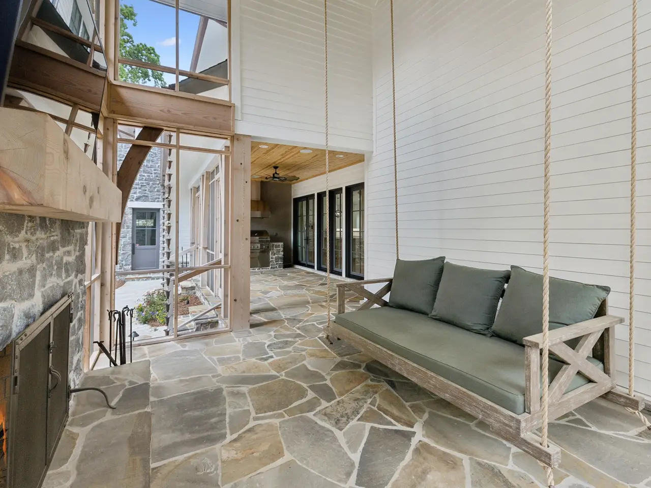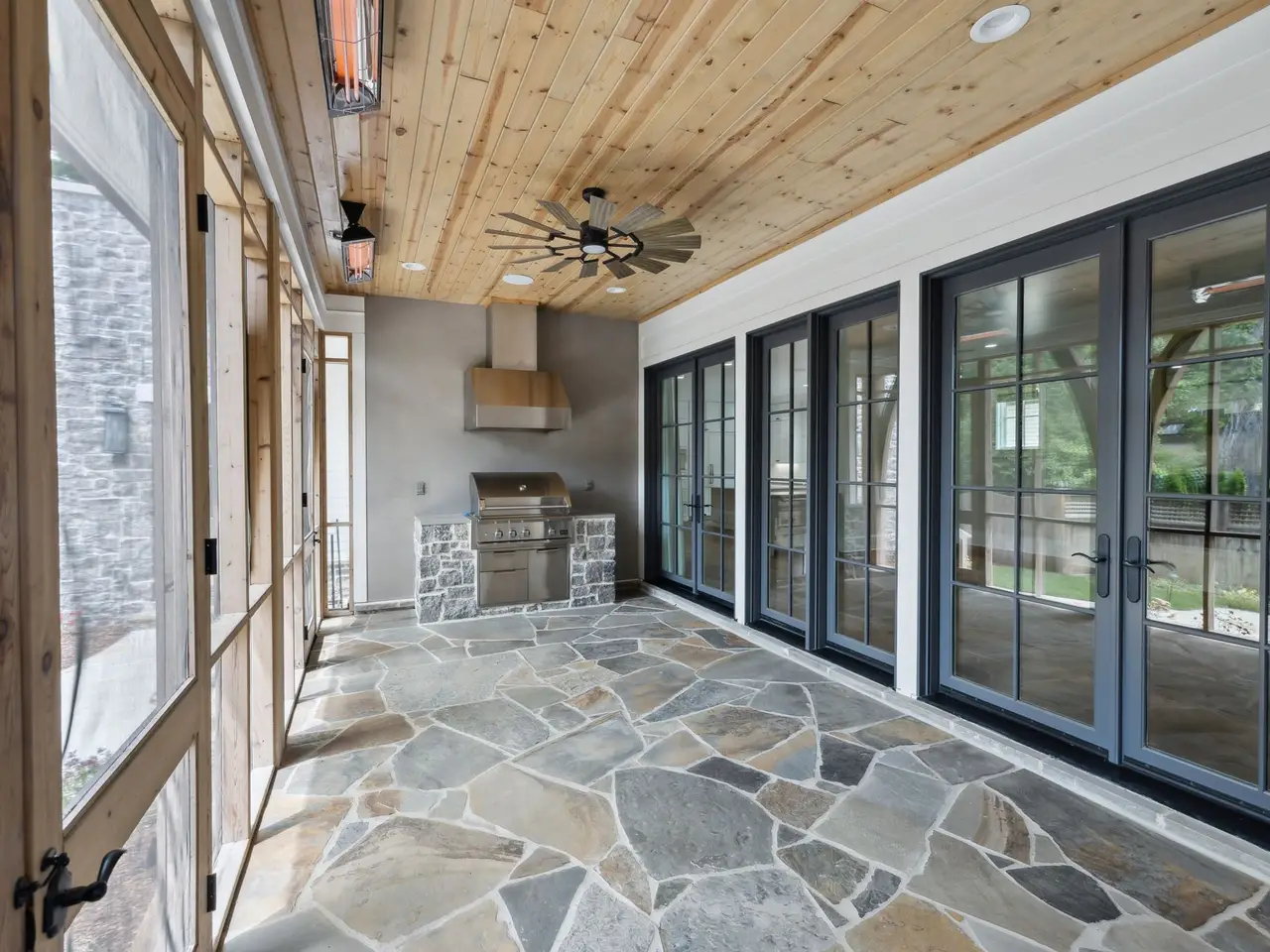 • Serene screened porch with outdoor grill and floor-to-ceiling stone fireplace
