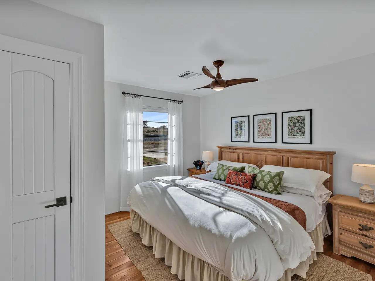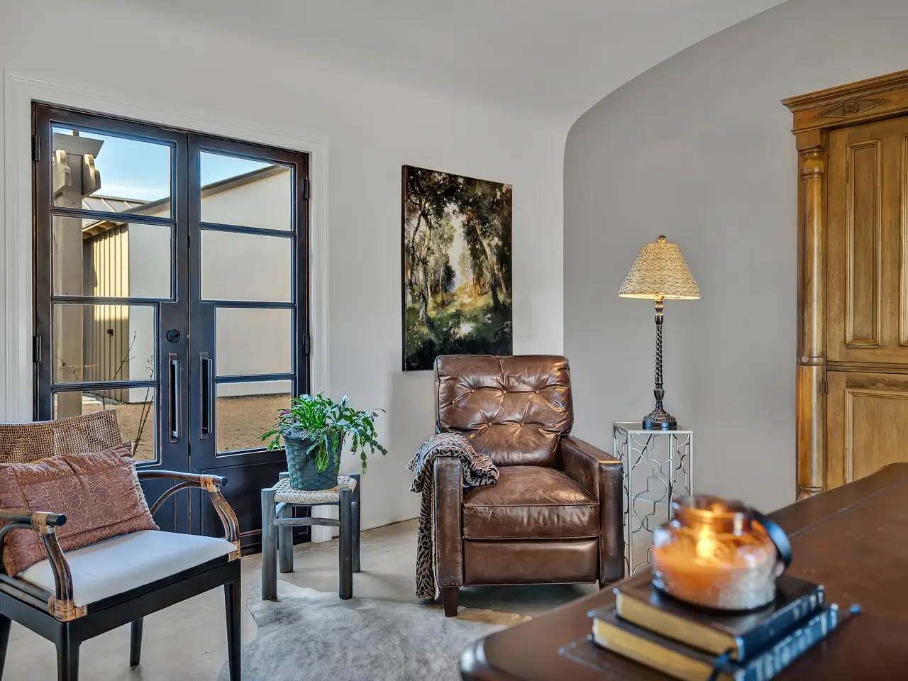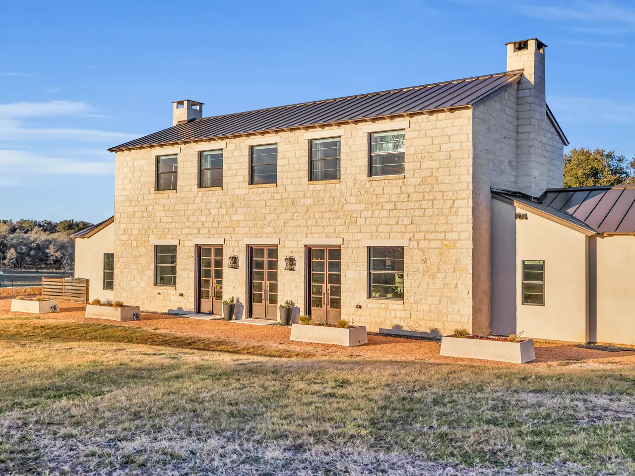 Experience serene luxury in a modern farmhouse nestled in the picturesque Texas Hill Country. The property is ideally located near the charming towns of Fredericksburg, Comfort, and Kerrville. Upon entering the property, an expansive limestone pathway leads to the entrance. The inviting courtyard adorned with a vine-covered pergola and twinkling lights provides a delightful spot to relax. The two-story home has been thoughtfully designed to blend functionality and luxury seamlessly. The first level features elegant hallways that guide you through the various rooms. The entire first level has heated flooring and recessed lighting with evening mood settings. The chef-ready kitchen is an excellent space for culinary enthusiasts, with multiple workstations, three sinks, high-end appliances, a butler's pantry, and quartz and woodblock countertops. The kitchen is perfectly set up for hosting events with separate stations for kitchen tasks, ample storage, and an 11-foot-long island that can accommodate up to five guests. The open floor plan leads to the dining area and living space, where large, rugged beams span the ceiling. The brick accent wall and wood-burning fireplace ground the light-filled room. Large solid steel entry doors line the exterior on each side of the home, providing easy access to the surrounding yard. The entire home is filled with natural light, and during the late afternoon, the main living area is transformed into a warm and serene space as the setting sun beams bounce off the floors, illuminating the space. The east wing of the home leads to the primary suite and office space. The elliptical arched ceilings with evening mood lighting provide an exceptional peaceful retreat. The en suite bath features a dual vanity, a freestanding porcelain tub, and a walk-in shower with a heated stone bench. The primary suite's dressing room boasts built-in shelving, a center console with storage, and a tri-fold mirror. The spacious and secluded office offers privacy and a reflective workspace. The second level features three spacious bedrooms, two full bathrooms, and a family room. The wood floors on the second level complement the abundance of natural light that fills the entire home. The property's detached oversized garage provides ample space for two cars, a golf cart/ATV, and extra storage. The barn, measuring 36x30 feet, is currently set up as a horse barn but can be restructured as a storage barn, among other options. Restful country living can be experienced at this tranquil, private home.