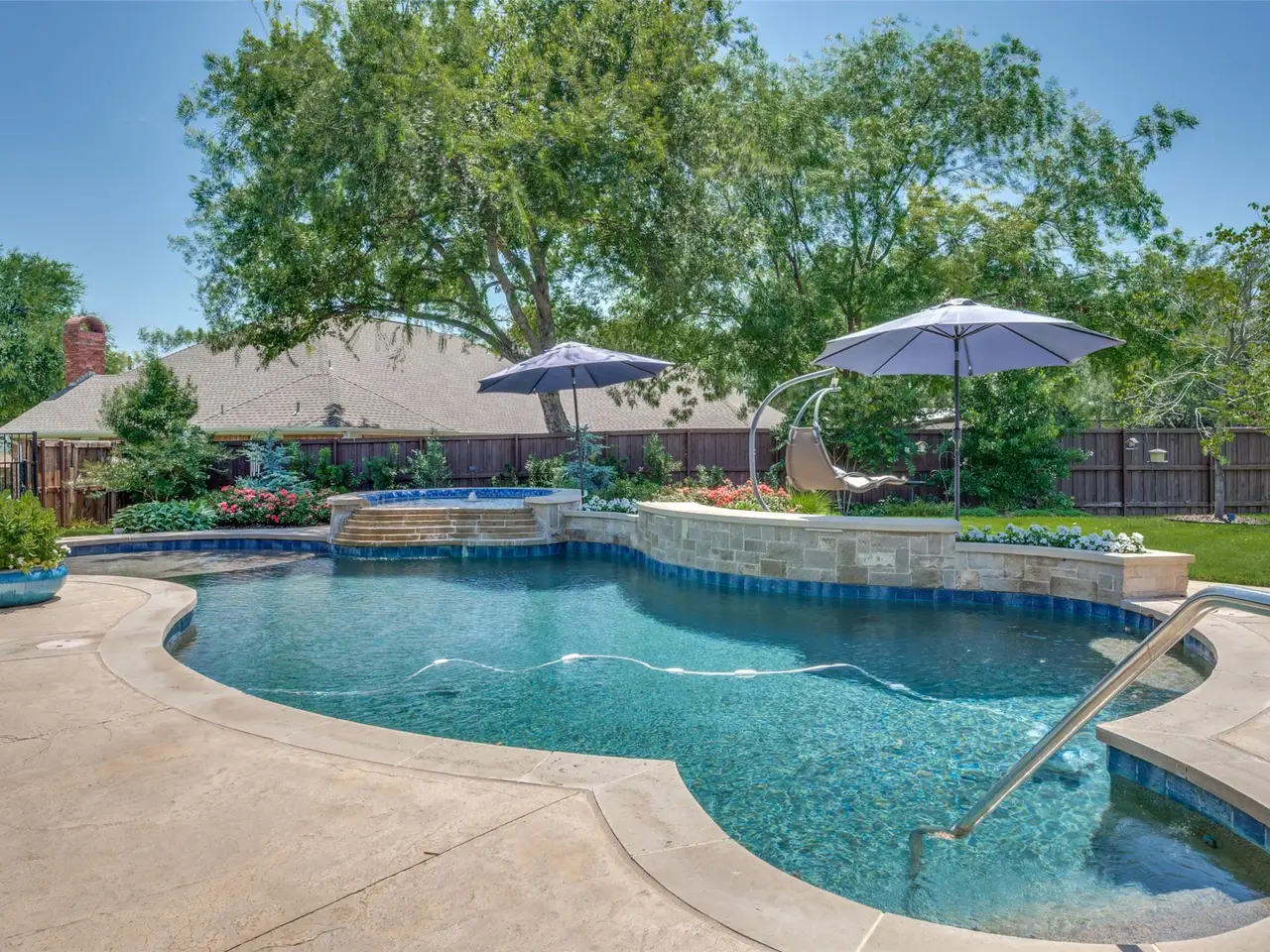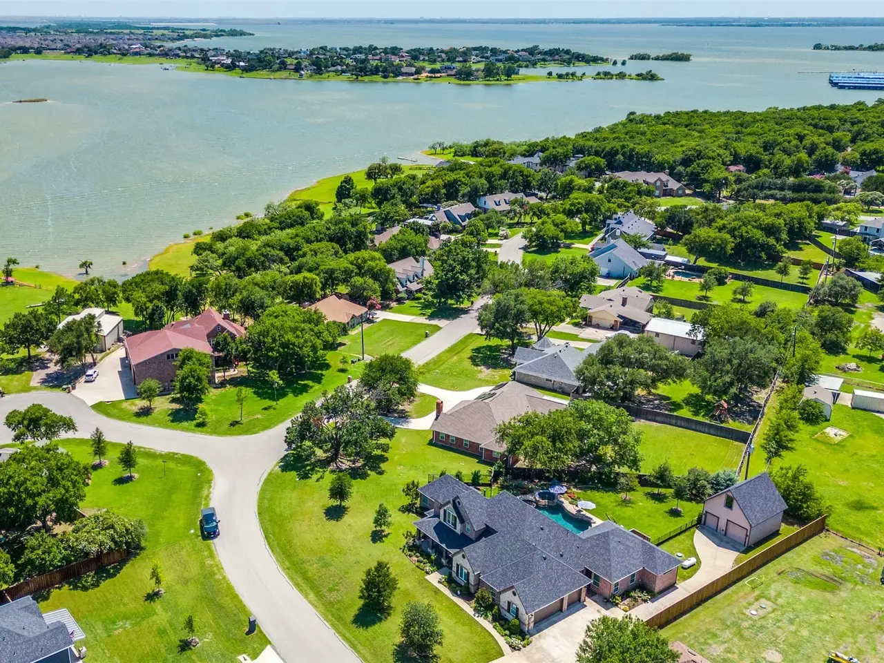 Multi-Gen Lakeside living in West Frisco! DESIGNED with HEART ~ with an attached 1 story Mother-in-Law .54 acre with Peek-a-Boo lake views. This custom Hensley-built home with constructed in 2014, spans 3,817 square feet, the residence features 4 bedrooms, 6 bathrooms, a dedicated study, two distinct living areas. Inside, modern luxury abounds with custom window coverings, stylish lighting fixtures, fresh and sophisticated paint tones, and intricate ceiling details. Wide plank smooth hardwood floors flow throughout, complementing custom built-in display shelves and cabinetry, a dedicated wine niche, and a sleek, modern kitchen. Marble counter tops, with upgraded stacked cabinets with lite display glass, beamed ceiling details, cool lighting and hardware. Hardwood floors, SS appliances, gas c-top, double ovens. The primary retreat, kitchen, and main living areas all offer spectacular views of the backyard pool oasis. The beautifully landscaped backyard is a true highlight, featuring a salt pool, a raised spa, an outdoor shower, and a convenient pool bath, plus a hot tub capable of seating six added in 2023. The pool area is enhanced by a large covered patio with direct access to the pool bath, living room, primary suite, and the attached guest house. MULTI-GENERATIONAL attached guest house provides single-story living with a full kitchen, island, living area, and a bedroom ensuite complete with a full over-sized ADA Shower, dual vanities, a walk-in closet. This guest house has Front door entry and back covered patio. Adding to the property's appeal is a detached two-story workshop with a one-car garage and a golf cart garage. This exceptional home is located in the Saratoga subdivision, a lakeside community known for its desirable absence of HOA fees and No city taxes. Residents can enjoy easy access to Hidden Cove Park and Marina at Lake Lewisville, just a short walk away.