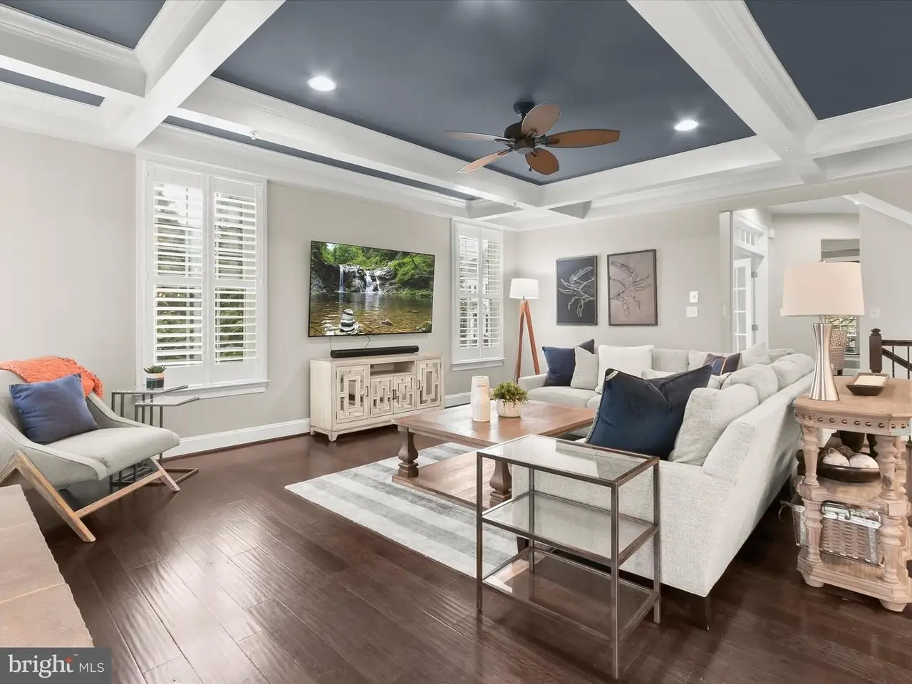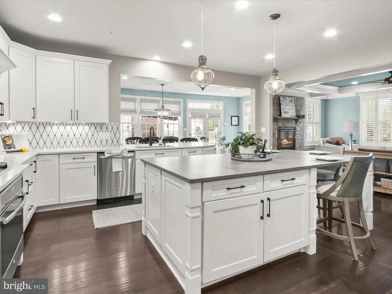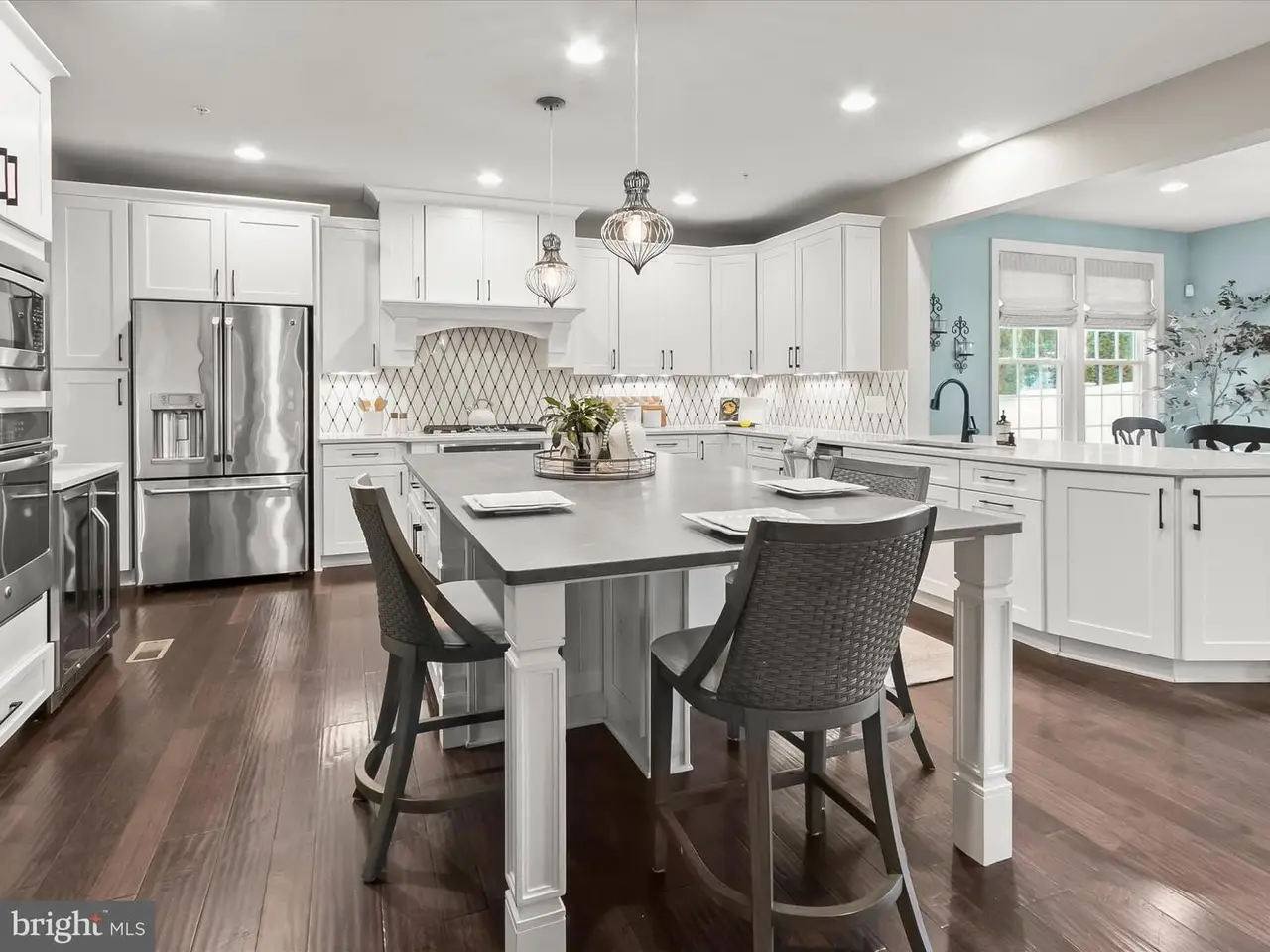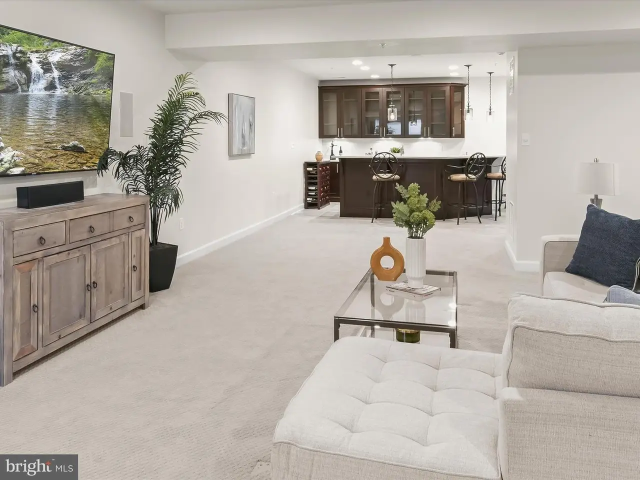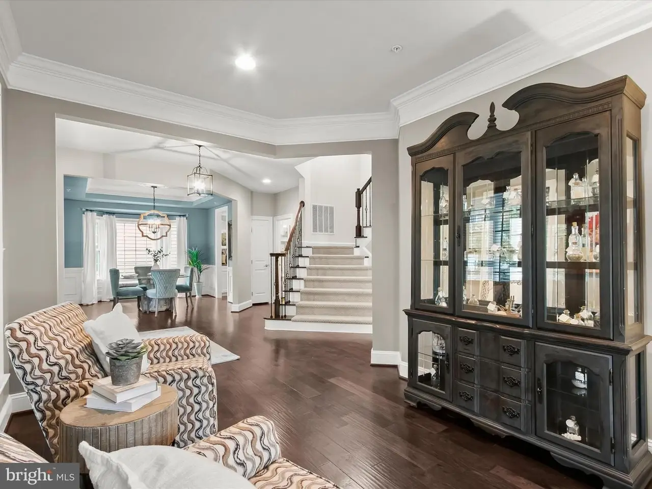 While every home in Maple Lawn is coveted, this premiere offering in the highly sought-after Midtown-West District is a standout. 7775 Elmwood Road is an absolutely showstopping NV Beaconsfield model presenting 5 bedrooms, 4.5 bathrooms, and more than 5,614 total square feet. Sited on a huge corner lot, the backyard oasis offers a fully fenced yard and custom patio with Trex decking, pavers, and fire pit. Every structural upgrade offered by NV Homes is included: bonus morning room, massive wrap-around front porch, primary bedroom sitting room & balcony, and a fourth level bedroom suite add-on. A magazine-worthy kitchen with expanded leathered quartz island is sure to impress. The kitchen also offers a butler pantry, glass front cabinetry, stylish backsplash, designer wallpaper, two ovens, five-burner cooktop and a wine fridge. Other main level highlights include hardwood flooring, extensive millwork, crown moulding, a bay window allowing tons of natural light, and an inviting family room with coffered ceiling and stone-front gas fireplace. The morning room off the kitchen showcases a wall of windows all its own and features French doors leading to the patio. An office with even more French doors, a half-bathroom and coat closet complete the main level. The upper level of this home features hardwood flooring throughout and includes a luxe primary bedroom with two walk-in closets, organizers, a sitting room with built-in cabinetry, and a gas fireplace. The stunning and completely renovated primary bathroom boasts a custom shower with multiple shower heads, standalone soaking tub, designer dual sink vanity, and premium finishes. There are three additional bedrooms and a shared bathroom with a dual sink vanity upstairs. This level is completed with a laundry room and hallway linen closet. The fourth level is perfect for in-laws, guests, or an au pair offering its own living area and 5th bedroom with en suite bath. The lower level presents a sprawling entertainment and relaxation area and a full bathroom. A large wet bar with espresso-colored shaker-style cabinets, fridge, dishwasher, and sink provide everything needed for hosting. Adjacent to the wet bar is a well-equipped gym while a finished storage room provides elegant yet practical additional space. Conveniently located close to all major Baltimore/DC commuter routes, and with enviable amenities including a resort-style community pool, tennis courts, pickleball courts, basketball courts, walking trails, state-of-the-art gym and more - you'll quickly see why Maple Lawn is an award-winning planned community unlike any other in the region.