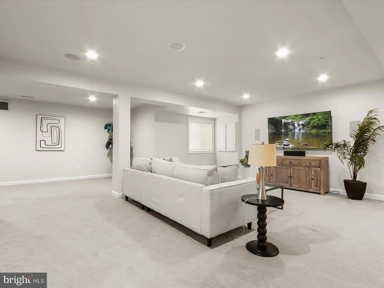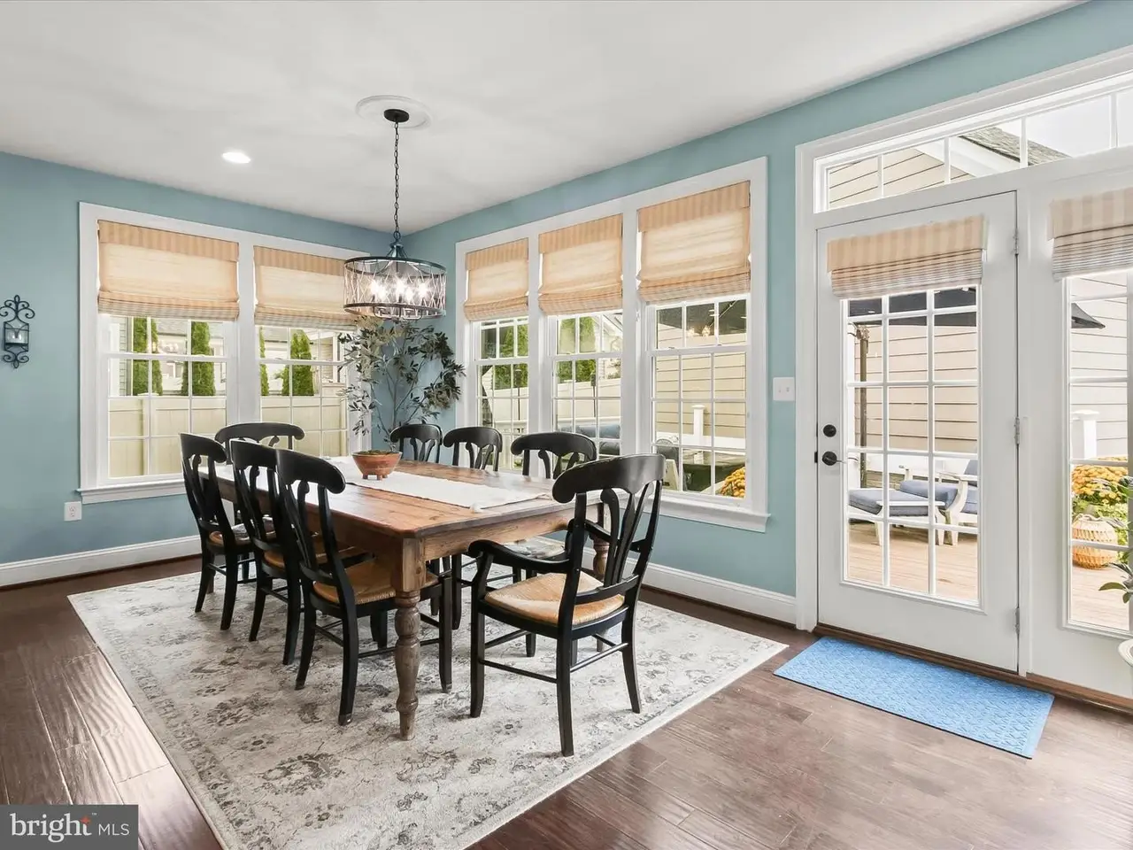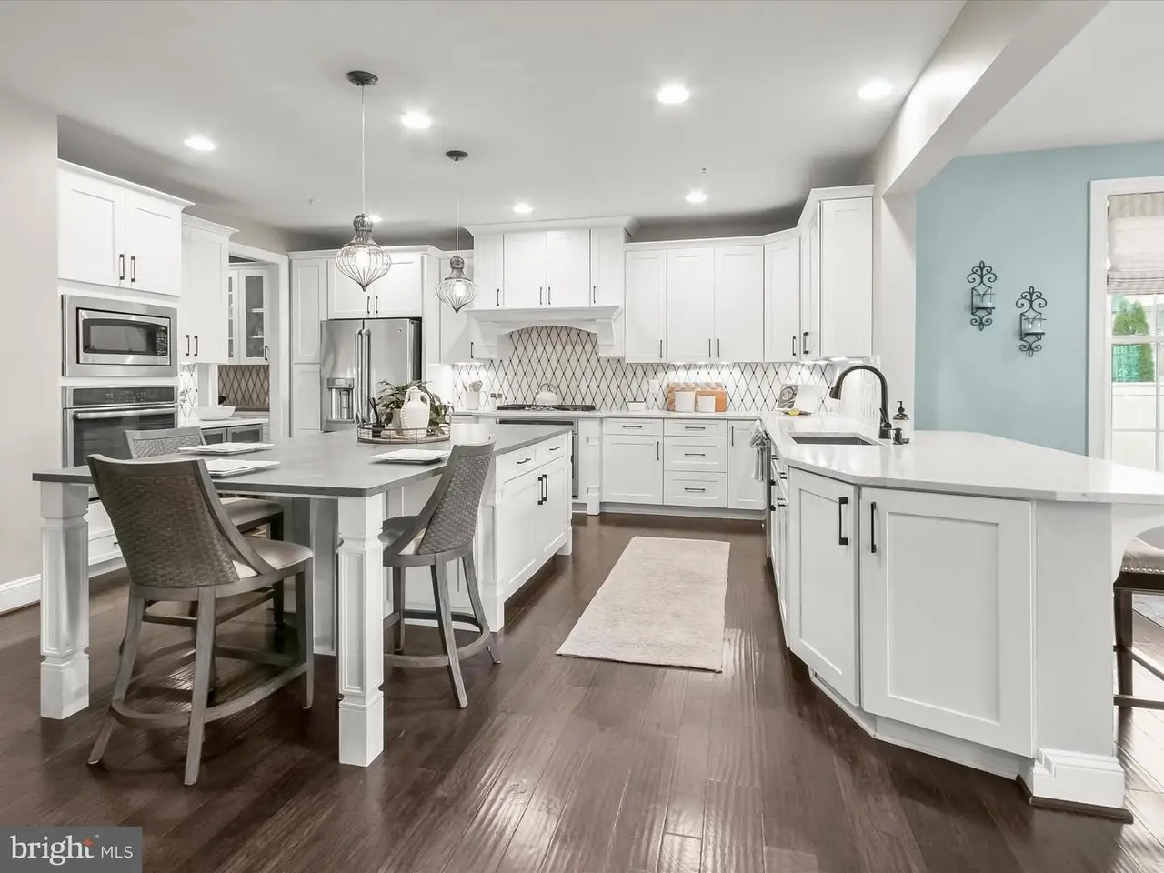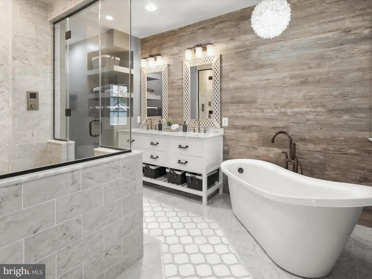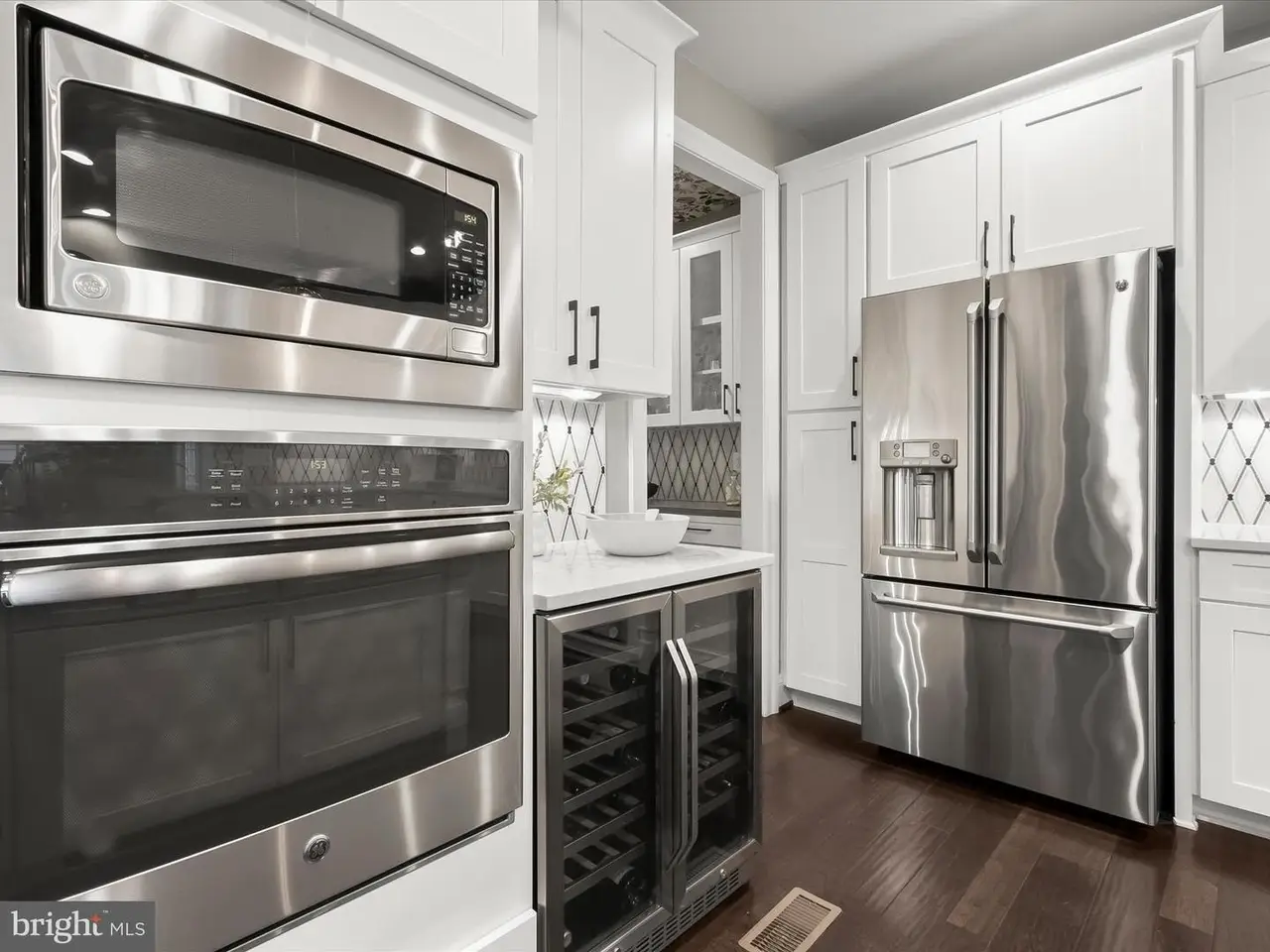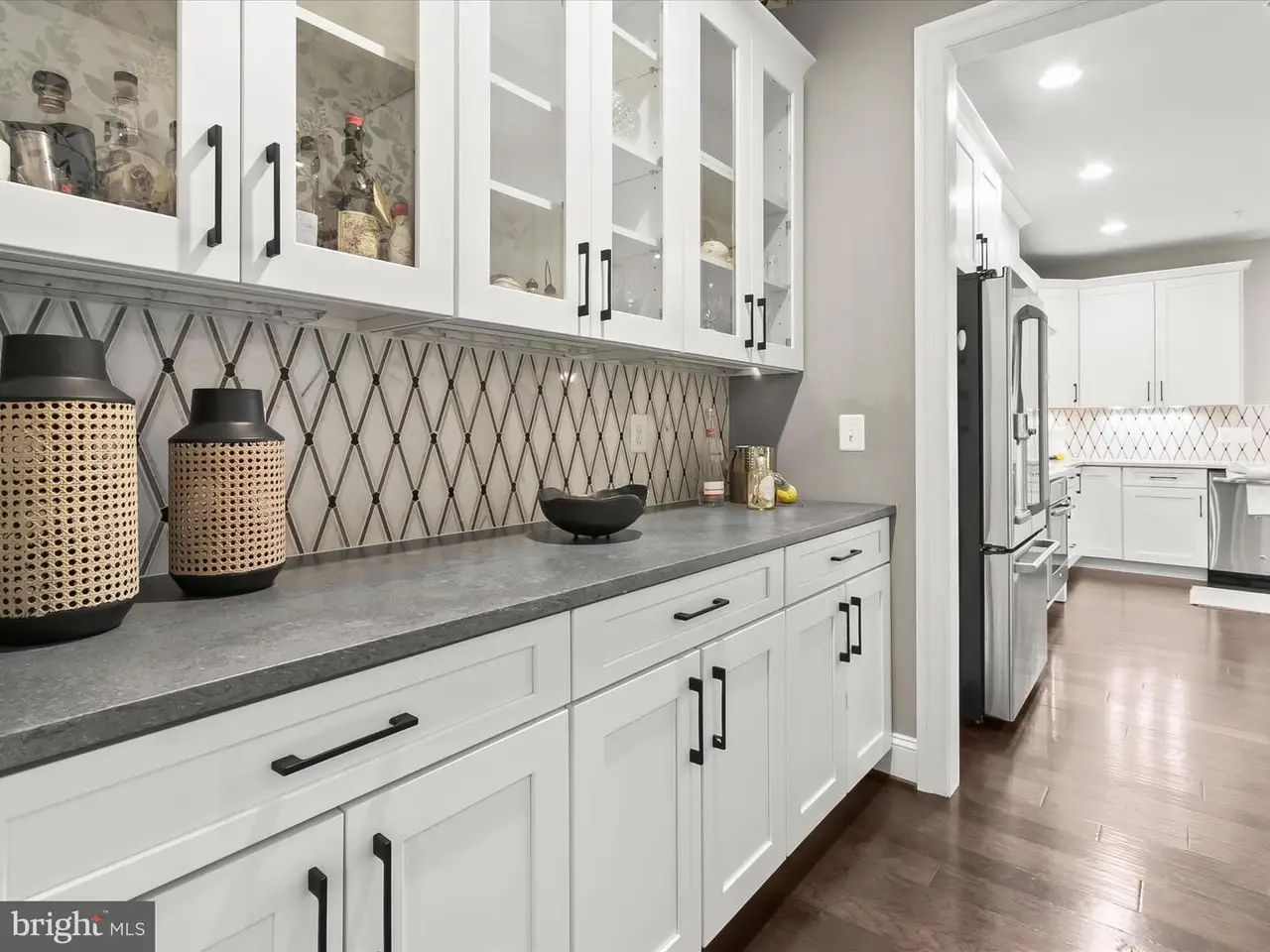While every home in Maple Lawn is coveted, this premiere offering in the highly sought-after Midtown-West District is a standout. 7775 Elmwood Road is an absolutely showstopping NV Beaconsfield model presenting 5 bedrooms, 4.5 bathrooms, and more than 5,614 total square feet. Sited on a huge corner lot, the backyard oasis offers a fully fenced yard and custom patio with Trex decking, pavers, and fire pit. Every structural upgrade offered by NV Homes is included: bonus morning room, massive wrap-around front porch, primary bedroom sitting room & balcony, and a fourth level bedroom suite add-on. A magazine-worthy kitchen with expanded leathered quartz island is sure to impress. The kitchen also offers a butler pantry, glass front cabinetry, stylish backsplash, designer wallpaper, two ovens, five-burner cooktop and a wine fridge. Other main level highlights include hardwood flooring, extensive millwork, crown moulding, a bay window allowing tons of natural light, and an inviting family room with coffered ceiling and stone-front gas fireplace. The morning room off the kitchen showcases a wall of windows all its own and features French doors leading to the patio. An office with even more French doors, a half-bathroom and coat closet complete the main level. The upper level of this home features hardwood flooring throughout and includes a luxe primary bedroom with two walk-in closets, organizers, a sitting room with built-in cabinetry, and a gas fireplace. The stunning and completely renovated primary bathroom boasts a custom shower with multiple shower heads, standalone soaking tub, designer dual sink vanity, and premium finishes. There are three additional bedrooms and a shared bathroom with a dual sink vanity upstairs. This level is completed with a laundry room and hallway linen closet. The fourth level is perfect for in-laws, guests, or an au pair offering its own living area and 5th bedroom with en suite bath. The lower level presents a sprawling entertainment and relaxation area and a full bathroom. A large wet bar with espresso-colored shaker-style cabinets, fridge, dishwasher, and sink provide everything needed for hosting. Adjacent to the wet bar is a well-equipped gym while a finished storage room provides elegant yet practical additional space. Conveniently located close to all major Baltimore/DC commuter routes, and with enviable amenities including a resort-style community pool, tennis courts, pickleball courts, basketball courts, walking trails, state-of-the-art gym and more - you'll quickly see why Maple Lawn is an award-winning planned community unlike any other in the region.