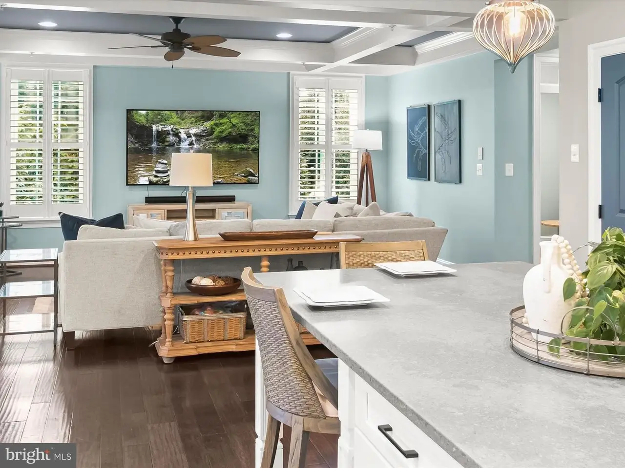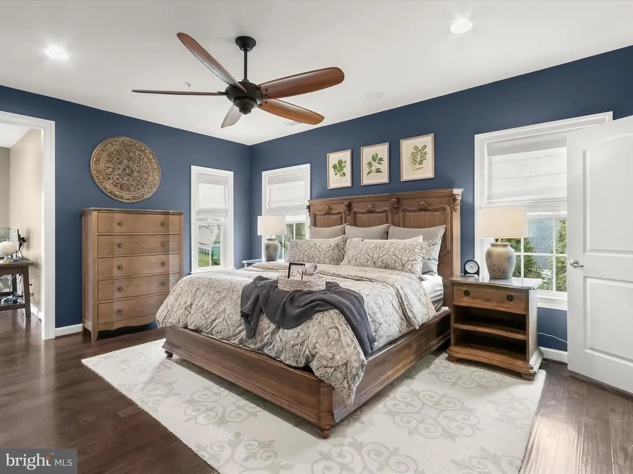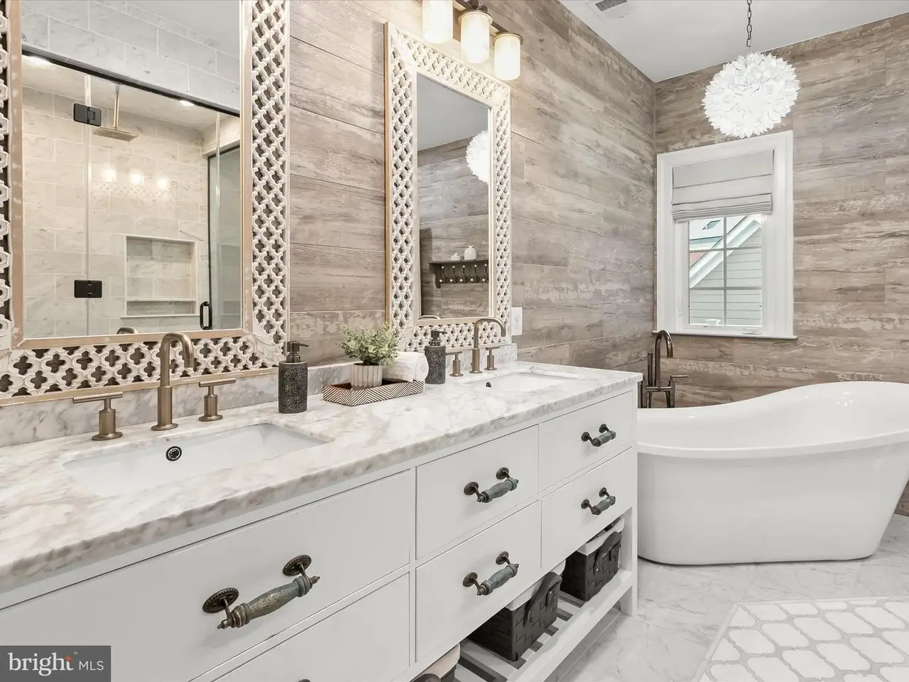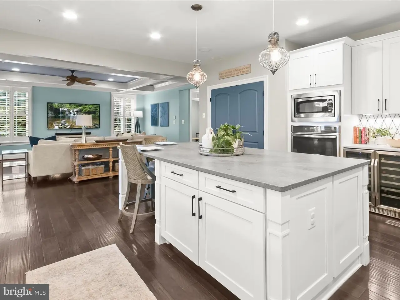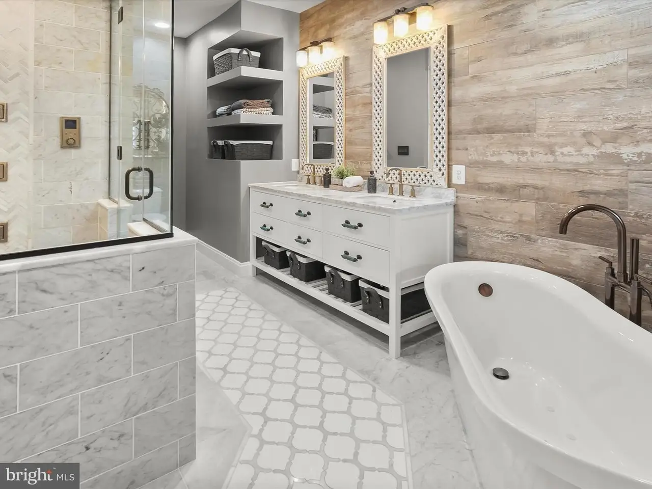 While every home in Maple Lawn is coveted, this premiere offering in the highly sought-after Midtown-West District is a standout. 7775 Elmwood Road is an absolutely showstopping NV Beaconsfield model presenting 5 bedrooms, 4.5 bathrooms, and more than 5,614 total square feet. Sited on a huge corner lot, the backyard oasis offers a fully fenced yard and custom patio with Trex decking, pavers, and fire pit. Every structural upgrade offered by NV Homes is included: bonus morning room, massive wrap-around front porch, primary bedroom sitting room & balcony, and a fourth level bedroom suite add-on. A magazine-worthy kitchen with expanded leathered quartz island is sure to impress. The kitchen also offers a butler pantry, glass front cabinetry, stylish backsplash, designer wallpaper, two ovens, five-burner cooktop and a wine fridge. Other main level highlights include hardwood flooring, extensive millwork, crown moulding, a bay window allowing tons of natural light, and an inviting family room with coffered ceiling and stone-front gas fireplace. The morning room off the kitchen showcases a wall of windows all its own and features French doors leading to the patio. An office with even more French doors, a half-bathroom and coat closet complete the main level. The upper level of this home features hardwood flooring throughout and includes a luxe primary bedroom with two walk-in closets, organizers, a sitting room with built-in cabinetry, and a gas fireplace. The stunning and completely renovated primary bathroom boasts a custom shower with multiple shower heads, standalone soaking tub, designer dual sink vanity, and premium finishes. There are three additional bedrooms and a shared bathroom with a dual sink vanity upstairs. This level is completed with a laundry room and hallway linen closet. The fourth level is perfect for in-laws, guests, or an au pair offering its own living area and 5th bedroom with en suite bath. The lower level presents a sprawling entertainment and relaxation area and a full bathroom. A large wet bar with espresso-colored shaker-style cabinets, fridge, dishwasher, and sink provide everything needed for hosting. Adjacent to the wet bar is a well-equipped gym while a finished storage room provides elegant yet practical additional space. Conveniently located close to all major Baltimore/DC commuter routes, and with enviable amenities including a resort-style community pool, tennis courts, pickleball courts, basketball courts, walking trails, state-of-the-art gym and more - you'll quickly see why Maple Lawn is an award-winning planned community unlike any other in the region.