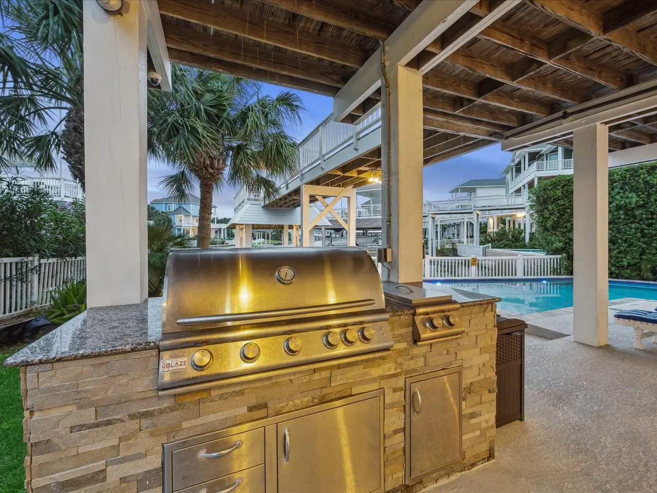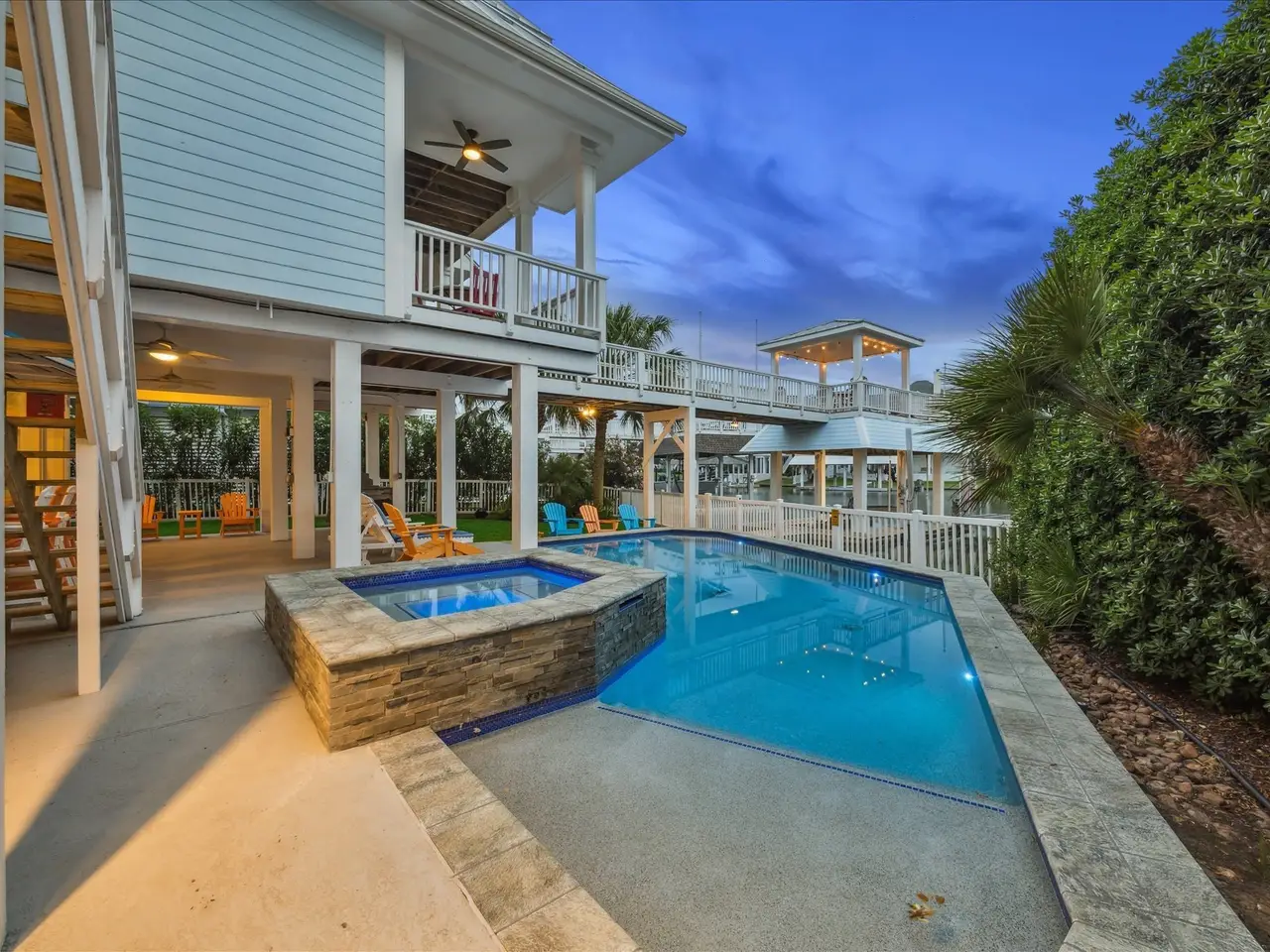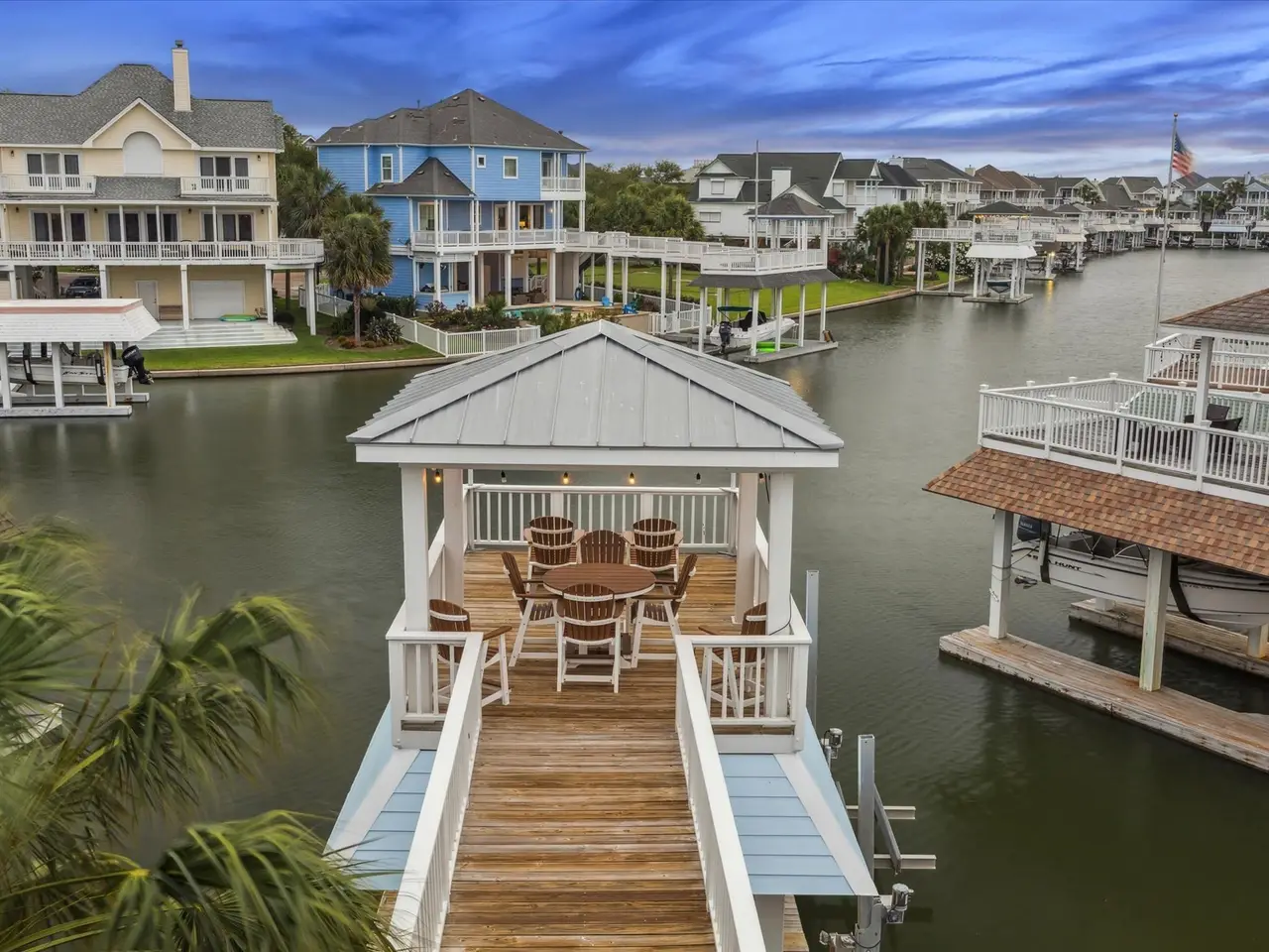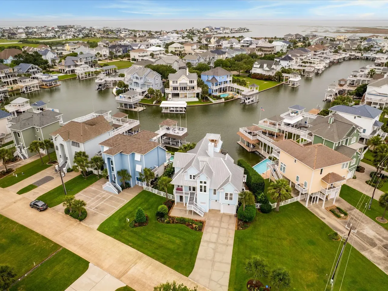 Experience vibrant coastal living in this beautifully updated & refreshing Laffite’s Cove home. Set on an expansive 11,010 sq ft lot (CAD), featuring a metal roof, fresh exterior paint, & durable Hardie plank siding. Whisk groceries & luggage upstairs w/your outdoor lift. Inside, enjoy black wood-look tile flooring, Big Chill appliances, & "Big Ass Fans." Expansive living room, dining, kitchen area overlooks the water. High ceilings, crown moldings, designer touches, electric shades. Large primary suite w/balcony to take in the cool breezes overlooking the water. Additional 3 bedrooms provide plenty of space. The outdoor oasis boasts refreshing pool w/chiller, spa, outdoor kitchen, bar, & screened party room w/half bath. Situated on a wide stunning oxbow canal location & proximity to the Laffite’s Cove Nature Preserve, this home offers the perfect blend of fun, design, & relaxation. Social Galveston Country Club membership transfers with property. Have a mini vacation every weekend!